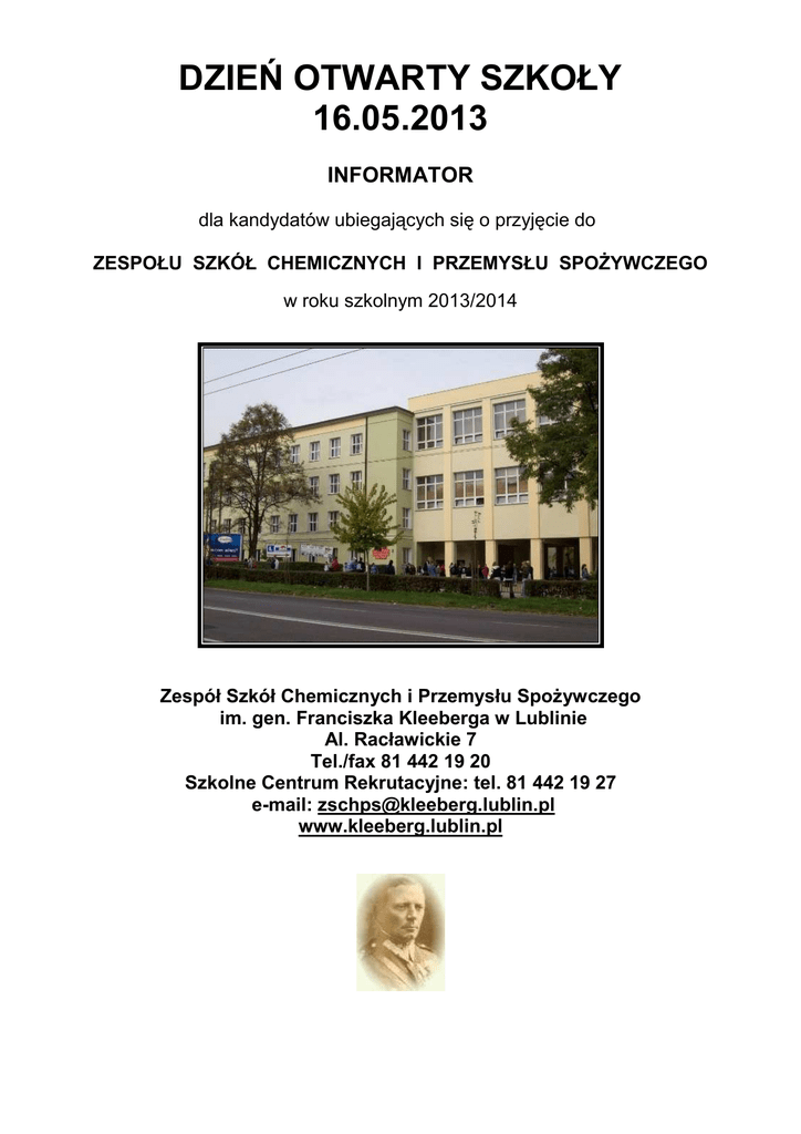 DZIEŃ OTWARTY SZKOŁY 16.05.2013 INFORMATOR dla kandydatów ubiegających się o przyjęcie do ZESPOŁU SZKÓŁ CHEMICZNYCH I PRZEMYSŁU SPOśYWCZEGO w roku szkolnym 2013/2014 Zespół Szkół Chemicznych i Przemysłu SpoŜywczego im. gen. Franciszka Kleeberga w Lublinie Al. Racławickie 7 Tel./fax 81 442 19 20 Szkolne Centrum Rekrutacyjne: tel. 81 442 19 27 e-mail: [email protected] www.kleeberg.lublin.pl Zespół Szkół Chemicznych i Przemysłu SpoŜywczego oferuje naukę w czterech typach szkół: XII Liceum Ogólnokształcące – 3 lata nauki Klasy z następującymi przedmiotami wiodącymi: • sportowa – sporty walki – rozszerzenia: język angielski, biologia, geografia, zwiększona liczba godzin wf-u; języki: angielski, niemiecki • geograficzno-biologiczna/ratownictwo medyczne – rozszerzenia: biologia, geografia, chemia; języki: angielski, niemiecki • biologiczno-chemiczna/ratownictwo medyczne – rozszerzenia: biologia, chemia, język angielski; języki: angielski, niemiecki • humanistyczno-dziennikarska – rozszerzenia: język polski, historia, wiedza o społeczeństwie; języki: angielski, niemiecki Technikum Przemysłu SpoŜywczego (4 lata nauki) w zawodzie: Technik technologii Ŝywności o specjalizacji: • produkcja wyrobów cukierniczych – rozszerzenia: biologia, informatyka; języki: angielski, niemiecki Technikum Chemiczne (4 lata nauki) w zawodzie: Technik analityk o specjalizacji: • analiza kryminalna i medyczna – rozszerzenia: biologia, chemia; języki: angielski, niemiecki Technik technologii chemicznej o specjalizacji: • technologia środków farmaceutycznych i kosmetycznych – rozszerzenia: biologia, chemia; języki: angielski, niemiecki Zasadnicza Szkoła Zawodowa Nr 10 (3 lata nauki) w zawodach: • cukiernik • piekarz • wędliniarz – język: angielski – język: angielski – język: angielski POSIADAMY Wysoko wykwalifikowaną kadrę, która potrafi uczyć i wychowywać 5 pracowni komputerowych Multimedialne Centrum Informacji ze stałym dostępem do Internetu Boiska „Orlik 2012”, duŜą salę gimnastyczną, lustrzaną salę taneczno-aerobikową, salę do tenisa stołowego, salę do unihokeja i gimnastyki, siłownię 2 strzelnice na broń krótką i pneumatyczną Barek i sklepik ZAPEWNIAMY Bezpłatne zajęcia praktyczne oraz praktyki zawodowe w firmach z Lublina i regionu MoŜliwość uzyskania dyplomu czeladnika OFERUJEMY Dobre przygotowanie do egzaminu maturalnego i egzaminów zawodowych Przyjazną atmosferę Wspomaganie wszechstronnego rozwoju zainteresowań UCZESTNICZYMY PROWADZIMY w projektach unijnych współpracę międzynarodową XII LICEUM OGÓLNOKSZTAŁCĄCE Dobrze przygotowuje do nowej matury i startu na studia! MoŜesz wybrać jedną z czterech klas: sportową – o profilu sportów walki z rozszerzonym programem języka angielskiego, biologii, geografii i zwiększoną liczbą godzin wychowania fizycznego; nauczane języki: angielski, niemiecki Rozszerzony program wf-u zawiera elementy wymagane na egzaminach sprawnościowych na Akademie Wychowania Fizycznego, Akademie Wojskowe, WyŜsze Szkoły Policyjne, Szkoły Ochroniarskie, ze szczególnym uwzględnieniem sportów walki: karate, taekwondo, judo oraz piłki koszykowej, piłki siatkowej, piłki noŜnej, lekkiej atletyki i gimnastyki. geograficzno-biologiczną z ratownictwem medycznym z rozszerzonym programem biologii, geografii, chemii nauczane języki: angielski, niemiecki Przygotowanie do dalszej nauki na uczelniach wyŜszych, na kierunkach związanych z biologią, geografią, ekonomią, ochroną środowiska, turystyką, agroturystyką i hotelarstwem wzbogacone wiedzą z zakresu ratownictwa medycznego. biologiczno-chemiczną z ratownictwem medycznym z rozszerzonym programem biologii, chemii, języka angielskiego; nauczane języki: angielski, niemiecki Klasa stworzona z myślą o młodzieŜy pragnącej kontynuować naukę na studiach medycznych, ratownictwie medycznym, pielęgniarstwie, fizjoterapii, farmacji, międzywydziałowych studiach przyrodniczych, biotechnologii oraz róŜnych specjalnościach biologicznych i chemicznych. humanistyczno-dziennikarską z rozszerzonym programem języka polskiego, historii, wiedzy o społeczeństwie; nauczane języki: angielski, niemiecki Przygotowuje do studiów na wszystkich kierunkach humanistycznych i filologicznych: dziennikarstwie, polonistyce, historii, prawie, stosunkach międzynarodowych, politologii, psychologii, socjologii, filozofii, pedagogice. TECHNIKUM CHEMICZNE MoŜesz wybrać jedną z klas: ANALIZA KRYMINALNA I MEDYCZNA Wybierając tę specjalizację zapoznasz się z metodyką badań wykonywanych w laboratoriach diagnostycznych i analitycznych, a zwłaszcza kryminalistycznych oraz medycznych i farmaceutycznych. Klasa z rozszerzonym programem biologii i chemii, stworzona z myślą o młodzieŜy pragnącej kontynuować naukę na studiach medycznych, ratownictwie medycznym, pielęgniarstwie, fizjoterapii, farmacji, międzywydziałowych studiach przyrodniczych, biotechnologii oraz róŜnych specjalnościach biologicznych i chemicznych. Absolwenci mają moŜliwość otrzymania certyfikatu potwierdzającego ukończoną specjalizację. Praktyki zawodowe odbywają się w: laboratoriach analitycznych. TECHNOLOGIA ŚRODKÓW FARMACEUTYCZNYCH I KOSMETYCZNYCH Wybierając tę specjalizację zapoznasz się z technologią produkcji leków, farmaceutyków i substancji chemicznych. Zdobędziesz bardzo dobre przygotowanie do studiów na kierunkach farmaceutycznych, chemicznych, technicznych i przyrodniczych oraz przygotowanie zawodowe do pracy w firmach farmaceutycznych i kosmetycznych. Klasa z rozszerzonym programem biologii i chemii. Absolwenci mają moŜliwość otrzymania certyfikatu potwierdzającego ukończoną specjalizację. Praktyki zawodowe odbywają się w: Zakładach Azotowych „Puławy”, Zakładach Chemicznych „Permedia”, PPH „STANDARD”, Lubelskich Zakładach Farmaceutycznych „POLFA”, MPWiK, SP „F