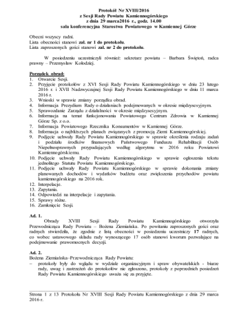 Protokół Nr XVIII/2016 z Sesji Rady Powiatu Kamiennogórskiego z dnia 29 marca2016 r., godz. 14.00 sala konferencyjna Starostwa Powiatowego w Kamiennej Górze Obecni wszyscy radni. Lista obecności stanowi zał. nr 1 do protokołu. Lista zaproszonych gości stanowi zał. nr 2 do protokołu. W posiedzeniu uczestniczyli również: sekretarz powiatu – Barbara Świętoń, radca prawny – Przemysław Kołodziej. Porządek obrad: 1. Otwarcie Sesji. 2. Przyjęcie protokołów z XVI Sesji Rady Powiatu Kamiennogórskiego w dniu 23 lutego 2016 r. i XVII Nadzwyczajnej Sesji Rady Powiatu Kamiennogórskiego w dniu 11 marca 2016 r. 3. Wnioski w sprawie zmiany porządku obrad. 4. Informacja Prezydium Rady o działaniach podejmowanych w okresie międzysesyjnym. 5. Sprawozdanie Zarządu z działalności w okresie międzysesyjnym. 6. Informacja na temat funkcjonowania Powiatowego Centrum Zdrowia w Kamiennej Górze Sp. z o.o. 7. Informacja Powiatowego Rzecznika Konsumentów w Kamiennej Górze. 8. Informacja o najbliższych planach związanych z promocją Ziemi Kamiennogórskiej. 9. Podjęcie uchwały Rady Powiatu Kamiennogórskiego w sprawie określenia rodzaju zadań i podziału środków finansowych Państwowego Funduszu Rehabilitacji Osób Niepełnosprawnych przypadających według algorytmu w 2016 roku Powiatowi Kamiennogórskiemu. 10. Podjęcie uchwały Rady Powiatu Kamiennogórskiego w sprawie ogłoszenia tekstu jednolitego Statutu Powiatu Kamiennogórskiego. 11. Podjęcie uchwały Rady Powiatu Kamiennogórskiego w sprawie dokonania zmiany planowanych dochodów i wydatków budżetu oraz zwiększenia przychodów powiatu kamiennogórskiego na 2016 rok. 12. Interpelacje. 13. Zapytania. 14. Odpowiedzi na interpelacje i zapytania. 15. Sprawy różne. 16. Zamknięcie Sesji. Ad. 1. Obrady XVIII Sesji Rady Powiatu Kamiennogórskiego otworzyła Przewodnicząca Rady Powiatu – Bożena Ziemiańska. Po powitaniu zaproszonych gości oraz radnych stwierdziła, że zgodnie z listą obecności w posiedzeniu uczestniczy 17 radnych, co wobec ustawowego składu rady wynoszącego 17 osób stanowi kworum pozwalające na podejmowanie prawomocnych decyzji. Ad. 2. Bożena Ziemiańska–Przewodnicząca Rady Powiatu: protokoły były do wglądu w wydziale organizacyjnym i spraw obywatelskich - biurze rady, uwag i zastrzeżeń do protokołów nie zgłoszono, protokoły z poprzednich posiedzeń Rady Powiatu Kamiennogórskiego uważa się za przyjęte. ___________________________________________________________________________ Strona 1 z 13 Protokołu Nr XVIII Sesji Rady Powiatu Kamiennogórskiego z dnia 29 marca 2016 r. Ad. 3. Bożena Ziemiańska–Przewodnicząca Rady Powiatu: czy ktoś z Państwa Radnych chciałby wystąpić z wnioskiem o uzupełnienie, bądź zmianę porządku obrad? Uwag nie zgłoszono. Ad. 4. Bożena Ziemiańska–Przewodnicząca Rady Powiatu: odczytała informację o działaniach prezydium rady międzysesyjnym, zał. nr 3 do protokołu. podejmowanych w okresie Robert Fyda – Wiceprzewodniczący Rady Powiatu: odczytał informację o działaniach stałych Komisji Rady Powiatu Kamiennogórskiego podejmowanych w okresie międzysesyjnym, zał. nr 4 do protokołu. Pytań nie zgłoszono. Ad. 5. Małgorzata Krzyszkowska – Wicestarosta Powiatu: przedstawiła sprawozdanie Zarządu Powiatu międzysesyjny, zał. nr 5 do protokołu. Kamiennogórskiego za okres Adam Krok – Radny: Pani Starosto chodzi o rozstrzygnięcie otwartego konkursu ofert na realizację zadań publicznych w 2016 roku. Komisja przedstawiła Państwu propozycję podziału środków i tam była przedstawiona również oferta na powstanie obelisku na cmentarzu żydowskim – proszę mi powiedzieć dlaczego ta propozycja została odrzucona przez Zarząd? Małgorzata Krzyszkowska – Wicestarosta Powiatu: Szanowny Panie Radny Zarząd Powiatu ma taką możliwość, aby do tych wszystkich propozycji się odnieść i mieć swoje stanowisko w tym przypadku Zarząd Powiatu wyraził odmienne zdanie niż komisja. Adam Krok – Radny: można wiedzieć, czym zarząd się sugerował? Małgorzata Krzyszkowska – Wicestarosta Powiatu: jeden z wniosków, akurat nie ten o którym Pan Radny mówi, nie znalazł u nas uznania dlatego, że osoby, które w tym projekcie uczestniczyły były to osoby ze Świdnicy i generalnie w tym proponowanym projekcie były pieniądze zdaniem zarządu przeznaczone na pensje, a nie na zadania służące mieszkańcom. Szanowni Państwo, jeżeli gminy żydowskie nie są zainteresowane, aby tutaj w Polsce inwestować, czy w cmentarze, czy kościoły - w ich metropolie, więc dlaczego my mamy wydawać na to pieniądze? Po drugie kwota w wysokości 900 zł naszym zdaniem nie wystarczy na postawienie kolejnego obelisku, który miałby powstać nad zalewem od strony ul. Księcia Bolka. Trzeba na to spojrzeć inaczej, być może w najbliższym czasie zalew będzie przez miasto remontowany, a na dzisiaj nie wiemy, czy w tym projekcie znajdzie uznanie umiejscowienie takiego obelisku. Jarosław Gęborys – Starosta Powiatu: wiemy, że jeden stary cmentarz żydowski znajduje się za murem cmentarza rzymsko – katolickiego i z tego, co się orientuję przez długie lata od kiedy ten cmentarz tam jest, gmina żydowska nie dołożyła do niego żadnych pieniędzy. Wiemy, jak wygląda teren ___________________________________________________________________________ Strona 2 z 13 Protokołu Nr XVIII Sesji Rady Powiatu Kamiennogórskiego z dnia 29 marca 2016 r. tego starego cmentarza, że jest zaniedbany i gdyby nie działalność naszych kamiennogórskich środowisk, to pewnie by już nie istniał. Od zakończenia II wojny światowej praktycznie przez nikogo w ogóle nie był utrzymywany. Dopiero w ostatnich latach wprowadzono tam trochę porządku co i tak nie zmienia tego, że jest on systematycznie niszczony i nic specjalnego tam się nie dzieje. Takie było stanowisko Zarządu Powiatu, że robienie kolejnego pomnika przy terenie rekreac