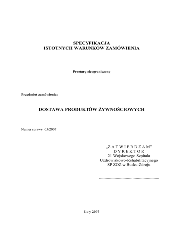 SPECYFIKACJA ISTOTNYCH WARUNKÓW ZAMÓWIENIA Przetarg nieograniczony Przedmiot zamówienia: DOSTAWA PRODUKTÓW śYWNOŚCIOWYCH Numer sprawy 05/2007 „Z A T W I E R D Z A M” DYREKTOR 21 Wojskowego Szpitala Uzdrowiskowo-Rehabilitacyjnego SP ZOZ w Busku-Zdroju .................................................................. Luty 2007 I. ZAMAWIAJĄCY 21 Wojskowy Szpital Uzdrowiskowo Rehabilitacyjny SP ZOZ 28-100 Busko-Zdrój ul. Gen. F. Rzewuskiego 8. II. TRYB ZAMÓWIENIA Przetarg nieograniczony na podstawie Rozdziału 3 Oddziału 1 Ustawy z dnia 29 stycznia 2004 r. Prawo zamówień publicznych (Dz. U. nr 19 poz. 177 z 2005r. z późniejszymi zmianami ) III. OPIS PRZEDMIOTU ZAMÓWIENIA Dostawa do Zamawiającego produktów Ŝywnościowych zgodnie z wykazami ilościowowartościowymi: 1. mroŜonych warzyw, owoców i ryb - załącznik Nr 1; 2.ogólnych produktów Ŝywnościowych - załącznik Nr 2; 3.owoców cytrusowych - załącznik Nr 3; 4.produktów mącznych, strączkowych i przyprawowych - załącznik Nr 4. Uwaga: Ilość produktów Ŝywnościowych podanych w załącznikach Nr 1 – 4 obejmuje zapotrzebowanie w ciągu 1 roku. Warunki dostawy: Dostawy odbywać się będą na podstawie szczegółowych zamówień składanych przez zamawiającego , we wszystkie dni za wyjątkiem świąt, do godziny 7:00 IV. OFERTY CZĘŚCIOWE I WARIANTOWE Zamawiający dopuszcza składanie ofert częściowych według poszczególnych załączników wyszczególnionych w punkcie III niniejszej specyfikacji istotnych warunków zamówienia. Zamawiający nie dopuszcza składania ofert wariantowych. V. TERMIN WYKONANIA ZAMÓWIENIA 10.03.2007r. – 31.03.2008r. VI. WARUNKI UDZIAŁU W POSTĘPOWANIU W postępowaniu mogą wziąć udział wykonawcy którzy: 1.spełnią warunki określone w art.22 ust.1 Ustawy z dnia 29 stycznia 2004r Prawo zamówień publicznych ( Dz. U. nr.19 poz. 177 z dnia 09.02.2004r); 2.nie podlegają wykluczeniu na podstawie art.24.Ustawy Prawo zamówień publicznych; 2 3.złoŜą ofertę zgodnie z wymaganiami specyfikacji istotnych warunków zamówienia. VII. OFERTA POWINNA ZAWIERAĆ. 1.Wypełnione wykazy ilościowo-wartościowe – załączniki Nr 1, Nr 2, Nr 3, Nr 4, do niniejszej specyfikacji. 2.Formularze oferty z cenę brutto za wykonanie przedmiotu zamówienia łącznie z dostawą do Zamawiającego oddzielnie dla kaŜdego załącznika wyszczególnionego w p III - załącznik Nr 5, do niniejszej specyfikacji. 3.Aktualny odpis z właściwego rejestru sądowego, lub aktualne zaświadczenie o wpisie do ewidencji działalności gospodarczej, lub poświadczone ich kserokopie. 4.Wymagane zezwolenia i opinie uprawniające do obrotu produktami Ŝywnościowymi stanowiącymi przedmiot zamówienia. 5.Oświadczenie o spełnieniu warunków określonych w art.22 ust.1 Ustawy Prawo zamówień publicznych - załącznik Nr 6, do niniejszej specyfikacji. 6.Oświadczenie Ŝe firma nie podlega wykluczeniu z postępowania z art. 24 Ustawy Prawo zamówień publicznych - załącznik Nr 7, do niniejszej specyfikacji. 7.Oświadczenie o nie zaleganiu w płaceniu składek do Urzędu Skarbowego, oraz Zakładu Ubezpieczeń Społecznych - załącznik Nr 8, do niniejszej specyfikacji. 8.Zaakceptowany wzór umowy – Załącznik Nr 9, do niniejszej specyfikacji. VIII. TERMIN ZWIĄZANIA OFERTĄ 30 dni IX. OPIS SPOSOBU PRZYGOTOWANIA OFERTY Aby oferta mogła być uznana za waŜną i brać udział w ocenie powinna spełniać wymogi Ustawy - Prawo zamówień publicznych i niniejszej specyfikacji. 1.Oferta powinna być sporządzona w języku polskim na formularzu oferty stanowiącym załącznik nr 5 do niniejszej specyfikacji. 2.Oferta powinna być podpisana przez osobę upełnomocnioną do reprezentowania firmy, co musi wynikać z załączonych do oferty dokumentów. Pełnomocnictwa, zgodnie z ustawą o opłacie skarbowej muszą być opatrzone znaczkami skarbowymi. 3.Wszystkie kartki Oferty powinny być połączone w sposób trwały uniemoŜliwiający ich wysunięcie się , ponumerowane i podpisane przez osobę podpisującą ofertę. 4.Wykonawca powinien spełniać warunki wymagane w punkcie VI niniejszej specyfikacji. 3 5.Oferta powinna zawierać wszystkie dokumenty wymienione w punkcie VII niniejszej specyfikacji. 6.Wszelkie poprawki lub zmiany w ofercie winny być podpisane własnoręcznie przez osobę podpisującą ofertę. 7.Ofertę naleŜy umieścić w kopercie zamkniętej w sposób gwarantujący w poufności jej treści. zachowanie 8.Koperta winna być opatrzona adresem Zamawiającego z dopiskiem: „PRZETARG NIEOGRANICZONY – DOSTAWA PRODUKTÓW śYWNOŚCIOWYCH ”. 9.Koperta musi być równieŜ opisana nazwą i adresem Wykonawcy. 10.Zamawiający odrzuci ofertę, jeŜeli: •jest niezgodna z Ustawą Pzp; •jej treść nie odpowiada treści specyfikacji istotnych warunków zamówienia; •jej złoŜenie stanowi czyn nieuczciwej konkurencji w rozumieniu przepisów o zwalczaniu nieuczciwej konkurencji; •zawiera raŜąco niską cenę w stosunku do przedmiotu zamówienia; •została złoŜona przez wykonawcę wykluczonego z udziału w postępowaniu o udzielenie zamówienia; •zawiera omyłki rachunkowe w obliczeniu ceny, których nie moŜna poprawić na podstawie art. 88, lub błędy w obliczeniu ceny; •wykonawca w terminie 7 dni od dnia otrzymania zawiadomienia nie zgodził się na poprawienie omyłki rachunkowej w obliczeniu ceny; •jest niewaŜna na podstawie odrębnych przepisów; 11.Oferta złoŜona po terminie zostanie zwrócona Wykonawcy bez otwierania po upływie terminu przewidzianego na wniesienie protestu. 12.Zamawiający wykluczy Wykonawców którzy: •nie spełniają warunków określonych w art. 24 ust.1 i 2 Ustawy Prawo zamówień publicznych; •nie spełniają warunków udziału w postępowaniu, o których mowa w Ustawie Prawo zamówień publicznych w art. 22 ust. 1 pkt 1-3. X. MIEJSCE SKŁADANIA OFERT Ofertę naleŜy przesłać lub dostarczyć do sekretariatu szpitala bud. Nr 2 /KORAL/ poniedział
