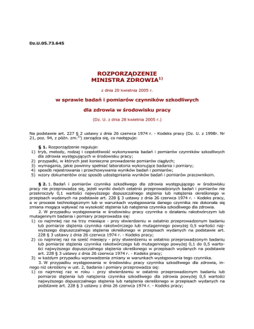 Dz.U.05.73.645 ROZPORZĄDZENIE MINISTRA ZDROWIA1) z dnia 20 kwietnia 2005 r. w sprawie badań i pomiarów czynników szkodliwych dla zdrowia w środowisku pracy (Dz. U. z dnia 28 kwietnia 2005 r.) Na podstawie art. 227 § 2 ustawy z dnia 26 czerwca 1974 r. - Kodeks pracy (Dz. U. z 1998r. Nr 21, poz. 94, z późn. zm.2)) zarządza się, co następuje: § 1. Rozporządzenie reguluje: 1) tryb, metody, rodzaj i częstotliwość wykonywania badań i pomiarów czynników szkodliwych dla zdrowia występujących w środowisku pracy; 2) przypadki, w których jest konieczne prowadzenie pomiarów ciągłych; 3) wymagania, jakie powinny spełniać laboratoria wykonujące badania i pomiary; 4) sposób rejestrowania i przechowywania wyników badań i pomiarów; 5) wzory dokumentów oraz sposób udostępniania wyników badań i pomiarów pracownikom. § 2. 1. Badań i pomiarów czynnika szkodliwego dla zdrowia występującego w środowisku pracy nie przeprowadza się, jeŜeli wyniki dwóch ostatnio przeprowadzonych badań i pomiarów nie przekroczyły 0,1 wartości najwyŜszego dopuszczalnego stęŜenia lub natęŜenia określonego w przepisach wydanych na podstawie art. 228 § 3 ustawy z dnia 26 czerwca 1974 r. - Kodeks pracy, a w procesie technologicznym lub w warunkach występowania danego czynnika nie dokonała się zmiana mogąca wpływać na wysokość stęŜenia lub natęŜenia czynnika szkodliwego dla zdrowia. 2. W przypadku występowania w środowisku pracy czynnika o działaniu rakotwórczym lub mutagennym badania i pomiary przeprowadza się: 1) co najmniej raz na trzy miesiące - przy stwierdzeniu w ostatnio przeprowadzonym badaniu lub pomiarze stęŜenia czynnika rakotwórczego lub mutagennego powyŜej 0,5 wartości najwyŜszego dopuszczalnego stęŜenia określonego w przepisach wydanych na podstawie art. 228 § 3 ustawy z dnia 26 czerwca 1974 r. - Kodeks pracy; 2) co najmniej raz na sześć miesięcy - przy stwierdzeniu w ostatnio przeprowadzonym badaniu lub pomiarze stęŜenia czynnika rakotwórczego lub mutagennego powyŜej 0,1 do 0,5 wartości najwyŜszego dopuszczalnego stęŜenia określonego w przepisach wydanych na podstawie art. 228 § 3 ustawy z dnia 26 czerwca 1974 r. - Kodeks pracy; 3) w kaŜdym przypadku wprowadzenia zmiany w warunkach występowania tego czynnika. 3. W przypadku występowania w środowisku pracy czynnika szkodliwego dla zdrowia, innego niŜ określony w ust. 2, badania i pomiary przeprowadza się: 1) co najmniej raz w roku - przy stwierdzeniu w ostatnio przeprowadzonym badaniu lub pomiarze stęŜenia lub natęŜenia czynnika szkodliwego dla zdrowia powyŜej 0,5 wartości najwyŜszego dopuszczalnego stęŜenia lub natęŜenia określonego w przepisach wydanych na podstawie art. 228 § 3 ustawy z dnia 26 czerwca 1974 r. - Kodeks pracy; 2 2) co najmniej raz na dwa lata - przy stwierdzeniu w ostatnio przeprowadzonym badaniu lub pomiarze stęŜenia lub natęŜenia czynnika szkodliwego dla zdrowia powyŜej 0,1 do 0,5 wartości najwyŜszego dopuszczalnego stęŜenia lub natęŜenia określonego w przepisach wydanych na podstawie art. 228 § 3 ustawy z dnia 26 czerwca 1974 r. - Kodeks pracy; 3) w kaŜdym przypadku wprowadzenia zmiany w warunkach występowania tego czynnika. § 3. W przypadku występowania w środowisku pracy szkodliwego dla zdrowia czynnika chemicznego, dla którego określono wartość najwyŜszego dopuszczalnego stęŜenia pułapowego, przeprowadza się pomiary ciągłe stęŜenia tego czynnika. § 4. Pracodawca przed przystąpieniem do przeprowadzania badań i pomiarów czynników szkodliwych dla zdrowia w środowisku pracy dokonuje rozeznania: 1) procesów technologicznych i występujących w nich czynników szkodliwych dla zdrowia w celu ich wytypowania do oznaczenia w środowisku pracy; 2) organizacji i sposobu wykonywania pracy. § 5. Pracodawca, nie później niŜ w terminie 30 dni od dnia rozpoczęcia działalności, jest obowiązany do wykonania badań i pomiarów czynnika szkodliwego dla zdrowia w środowisku pracy. § 6. Metody badań i pomiarów czynników szkodliwych dla zdrowia w środowisku pracy określają Polskie Normy oraz normy międzynarodowe lub równowaŜne. § 7. Laboratoria wykonujące badania i pomiary czynników szkodliwych dla zdrowia w środowisku pracy powinny uzyskać akredytację na podstawie przepisów ustawy z dnia 30 sierpnia 2002 r. o systemie oceny zgodności (Dz. U. z 2004 r. Nr 204, poz. 2087 oraz z 2005 r. Nr 64, poz. 565). § 8. O wynikach przeprowadzonych badań i pomiarów czynników szkodliwych dla zdrowia w środowisku pracy pracodawca jest obowiązany niezwłocznie, w sposób ustalony w danym zakładzie pracy, poinformować pracowników oraz umieszczać aktualne wyniki tych badań lub pomiarów na odpowiednim stanowisku pracy. § 9. 1. Na podstawie wyników badań i pomiarów pracodawca prowadzi na bieŜąco rejestr czynników szkodliwych dla zdrowia występujących na stanowisku pracy, zwany dalej "rejestrem", którego wzór określa załącznik nr 1 do rozporządzenia. 2. Pracodawca wpisuje na bieŜąco wyniki badań i pomiarów czynnika szkodliwego dla zdrowia do karty badań i pomiarów, zwanej dalej "kartą", której wzór określa załącznik nr 2 do rozporządzenia. 3. W przypadku likwidacji zakładu pracy, pracodawca niezwłocznie przekazuje rejestr oraz kartę właściwemu miejscowo państwowemu inspektorowi sanitarnemu, a w odniesieniu do jednostek, o których mowa w art. 20 ust. 1 ustawy z dnia 14 marca 1985 r. o Państwowej Inspekcji Sanitarnej (Dz. U. z 1998 r. Nr 90, poz. 575, z późn. zm.3)), właściwemu państwowemu inspektorowi sanitarnemu Ministerstwa Spraw Wewnętrznych i Administracji. 4. Rejestry oraz karty przechowywane są przez okres 40 lat, licząc od daty ostatniego wpisu. 5. Wyniki badań i pomiarów, o których mowa w § 5, przechowuje się przez okres 3 lat, licząc od daty ostatniego wpisu. § 10. 1. Dokumenty zawierające wyniki badań i pomiarów wpisane do rejestru i kar