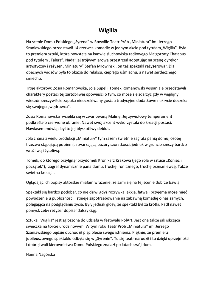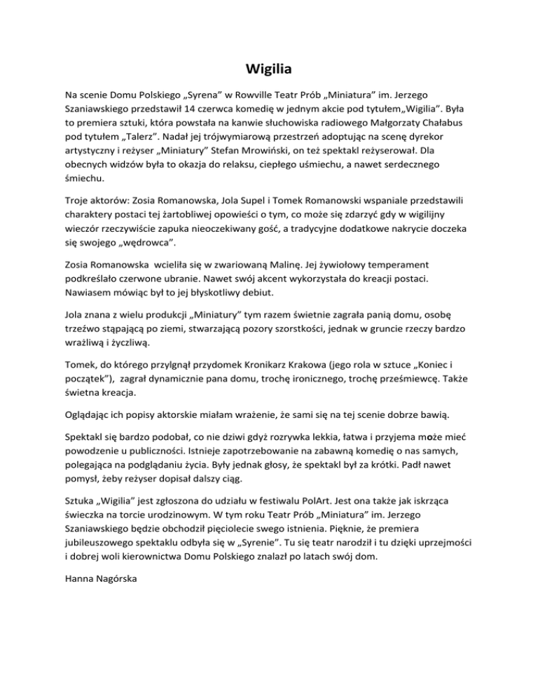Wigilia Na scenie Domu Polskiego „Syrena” w Rowville Teatr Prób „Miniatura” im. Jerzego Szaniawskiego przedstawił 14 czerwca komedię w jednym akcie pod tytułem„Wigilia”. Była to premiera sztuki, która powstała na kanwie słuchowiska radiowego Małgorzaty Chałabus pod tytułem „Talerz”. Nadał jej trójwymiarową przestrzeń adoptując na scenę dyrekor artystyczny i reżyser „Miniatury” Stefan Mrowiński, on też spektakl reżyserował. Dla obecnych widzów była to okazja do relaksu, ciepłego uśmiechu, a nawet serdecznego śmiechu. Troje aktorów: Zosia Romanowska, Jola Supel i Tomek Romanowski wspaniale przedstawili charaktery postaci tej żartobliwej opowieści o tym, co może się zdarzyć gdy w wigilijny wieczór rzeczywiście zapuka nieoczekiwany gość, a tradycyjne dodatkowe nakrycie doczeka się swojego „wędrowca”. Zosia Romanowska wcieliła się w zwariowaną Malinę. Jej żywiołowy temperament podkreślało czerwone ubranie. Nawet swój akcent wykorzystała do kreacji postaci. Nawiasem mówiąc był to jej błyskotliwy debiut. Jola znana z wielu produkcji „Miniatury” tym razem świetnie zagrała panią domu, osobę trzeźwo stąpającą po ziemi, stwarzającą pozory szorstkości, jednak w gruncie rzeczy bardzo wrażliwą i życzliwą. Tomek, do którego przylgnął przydomek Kronikarz Krakowa (jego rola w sztuce „Koniec i początek”), zagrał dynamicznie pana domu, trochę ironicznego, trochę prześmiewcę. Także świetna kreacja. Oglądając ich popisy aktorskie miałam wrażenie, że sami się na tej scenie dobrze bawią. Spektakl się bardzo podobał, co nie dziwi gdyż rozrywka lekkia, łatwa i przyjema może mieć powodzenie u publiczności. Istnieje zapotrzebowanie na zabawną komedię o nas samych, polegająca na podglądaniu życia. Były jednak głosy, że spektakl był za krótki. Padł nawet pomysł, żeby reżyser dopisał dalszy ciąg. Sztuka „Wigilia” jest zgłoszona do udziału w festiwalu PolArt. Jest ona także jak iskrząca świeczka na torcie urodzinowym. W tym roku Teatr Prób „Miniatura” im. Jerzego Szaniawskiego będzie obchodził pięciolecie swego istnienia. Pięknie, że premiera jubileuszowego spektaklu odbyła się w „Syrenie”. Tu się teatr narodził i tu dzięki uprzejmości i dobrej woli kierownictwa Domu Polskiego znalazł po latach swój dom. Hanna Nagórska Fotografie Zbigniew Slifierz