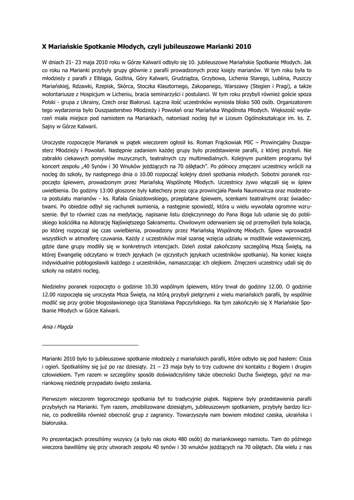X Mariańskie Spotkanie Młodych, czyli jubileuszowe Marianki 2010 W dniach 21- 23 maja 2010 roku w Górze Kalwarii odbyło się 10. jubileuszowe Mariańskie Spotkanie Młodych. Jak co roku na Marianki przybyły grupy głównie z parafii prowadzonych przez księży marianów. W tym roku była to młodzieży z parafii z Elbląga, Goźlina, Góry Kalwarii, Grudziądza, Grzybowa, Lichenia Starego, Lublina, Puszczy Mariańskiej, Rdzawki, Rzepisk, Skórca, Stoczka Klasztornego, Zakopanego, Warszawy (Stegien i Pragi), a także wolontariusze z Hospicjum w Licheniu, bracia seminarzyści i postulanci. W tym roku przybyli również goście spoza Polski - grupa z Ukrainy, Czech oraz Białorusi. Łączna ilość uczestników wyniosła blisko 500 osób. Organizatorem tego wydarzenia było Duszpasterstwo Młodzieży i Powołań oraz Mariańska Wspólnota Młodych. Większość wydarzeń miała miejsce pod namiotem na Mariankach, natomiast nocleg był w Liceum Ogólnokształcące im. ks. Z. Sajny w Górze Kalwarii. Uroczyste rozpoczęcie Marianek w piątek wieczorem ogłosił ks. Roman Frąckowiak MIC – Prowincjalny Duszpasterz Młodzieży i Powołań. Następnie zadaniem każdej grupy było przedstawienie parafii, z której przybyli. Nie zabrakło ciekawych pomysłów muzycznych, teatralnych czy multimedialnych. Kolejnym punktem programu był koncert zespołu „40 Synów i 30 Wnuków jeżdżących na 70 oślętach”. Po północy zmęczeni uczestnicy wrócili na nocleg do szkoły, by następnego dnia o 10.00 rozpocząć kolejny dzień spotkania młodych. Sobotni poranek rozpoczęto śpiewem, prowadzonym przez Mariańską Wspólnotę Młodych. Uczestnicy żywo włączali się w śpiew uwielbienia. Do godziny 13:00 głoszone były katechezy przez ojca prowincjała Pawła Naumowicza oraz moderatora postulatu marianów - ks. Rafała Gniazdowskiego, przeplatane śpiewem, scenkami teatralnymi oraz świadectwami. Po obiedzie odbył się rachunek sumienia, a następnie spowiedź, która u wielu wywołała ogromne wzruszenie. Był to również czas na medytację, napisanie listu dziękczynnego do Pana Boga lub udanie się do pobliskiego kościółka na Adorację Najświętszego Sakramentu. Chwilowym oderwaniem się od przemyśleń była kolacja, po której rozpoczął się czas uwielbienia, prowadzony przez Mariańską Wspólnotę Młodych. Śpiew wprowadził wszystkich w atmosferę czuwania. Każdy z uczestników miał szansę wzięcia udziału w modlitwie wstawienniczej, gdzie dane grupy modliły się w konkretnych intencjach. Dzień został zakończony szczególną Mszą Świętą, na której Ewangelię odczytano w trzech językach (w ojczystych językach uczestników spotkania). Na koniec księża indywidualnie pobłogosławili każdego z uczestników, namaszczając ich olejkiem. Zmęczeni uczestnicy udali się do szkoły na ostatni nocleg. Niedzielny poranek rozpoczęto o godzinie 10.30 wspólnym śpiewem, który trwał do godziny 12.00. O godzinie 12.00 rozpoczęła się uroczysta Msza Święta, na którą przybyli pielgrzymi z wielu mariańskich parafii, by wspólnie modlić się przy grobie błogosławionego ojca Stanisława Papczyńskiego. Na tym zakończyło się X Mariańskie Spotkanie Młodych w Górze Kalwarii. Ania i Magda _________________________________ Marianki 2010 było to jubileuszowe spotkanie młodzieży z mariańskich parafii, które odbyło się pod hasłem: Cisza i ogień. Spotkaliśmy się już po raz dziesiąty. 21 – 23 maja były to trzy cudowne dni kontaktu z Bogiem i drugim człowiekiem. Tym razem w szczególny sposób doświadczyliśmy także obecności Ducha Świętego, gdyż na mariankową niedzielę przypadało święto zesłania. Pierwszym wieczorem tegorocznego spotkania był to tradycyjnie piątek. Najpierw były przedstawienia parafii przybyłych na Marianki. Tym razem, zmobilizowane dziesiątym, jubileuszowym spotkaniem, przybyły bardzo licznie, co podkreśliła również obecność grup z zagranicy. Towarzyszyła nam bowiem młodzież czeska, ukraińska i białoruska. Po prezentacjach przeszliśmy wszyscy (a było nas około 480 osób) do mariankowego namiotu. Tam do późnego wieczora bawiliśmy się przy utworach zespołu 40 synów i 30 wnuków jeżdżących na 70 oślętach. Dla wielu z nas nazwa i utwory zespołu były zagadką, ale już przy pierwszych nutach zaczęły się tańce i klaskanie. Zabawę podsumowaliśmy okrzykami: WSZYSTKIE BRAWA DLA JEZUSA! Kolejny dzień rozpoczął się porannymi katechezami, prowadzonymi przez ojca prowincjała ks. Pawła Naumowicza oraz ks. Rafała Gniazdowskiego. Poznaliśmy bliżej biblijną bohaterkę Marię Magdalenę. Prześledziliśmy jej grzeszne życie, moment nawrócenia i późniejsze trwanie przy Jezusie. Historia Marii Magdaleny, która była pierwsza w grzechu, ale później z podobną siłą się nawróciła i towarzyszyła Mistrzowi, stała się dla nas doskonałą motywacją do pojednania z Bogiem. Stąd też księża przeprowadzili rachunek sumienia, a potem łąka przed namiotem znów zapełniła się młodymi ludźmi, którzy za pośrednictwem kapłanów powierzali miłosierdziu Jezusa swe grzechy. W tym samym czasie mogliśmy pisać listy dziękczynne do Boga, które potem miały być ofiarowane w czasie Mszy Świętej. Później, zanim rozpoczęło się czuwanie połączone z modlitwami do Ducha Świętego, grupa z Ukrainy wykonała dla nas przedstawienie. Było to symboliczne ukazanie tego jak my – ludzie zostaliśmy zniewoleni przez szatana. Wszyscy byliśmy po OGROMNYM WRAŻENIEM występu, stąd też nasi koledzy z zagranicy otrzymali owacje na stojąco! Potem rozpoczęła się chyba najbardziej emocjonująca część Marianek 2010 - celebracja Wigilii Zesłania Ducha Świętego. W dużym namiocie prowadzone były modlitwy. Również śpiewem przyzywano Ducha Ożywiciela. Poza tym w małym namiocie można było powierzyć swe sprawy w czasie modlitwy wstawienniczej. Dookoła panowała niesamowita 