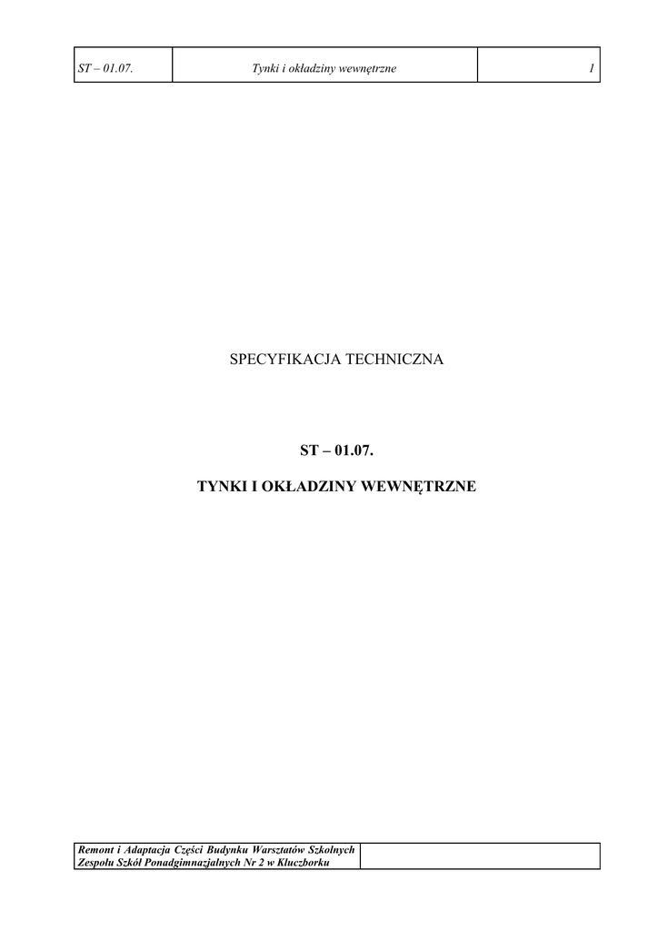 ST – 01.07. Tynki i okładziny wewnętrzne SPECYFIKACJA TECHNICZNA ST – 01.07. TYNKI I OKŁADZINY WEWNĘTRZNE Remont i Adaptacja Części Budynku Warsztatów Szkolnych Zespołu Szkół Ponadgimnazjalnych Nr 2 w Kluczborku 1 ST – 01.07. Tynki i okładziny wewnętrzne 2 1. WSTĘP. 1.1 Przedmiot SST. Przedmiotem niniejszej szczegółowej specyfikacji technicznej (SST) są wymagania dotyczące wykonania i odbioru tynków i okładzin wewnętrznych i zewnętrznych w ramach zadania inwestycyjnego pn.: „Remont i Adaptacja Części Budynku Warsztatów Szkolnych Zespołu Szkół Ponadgimnazjanych Nr 2 na Pracownie Specjalistyczne Centrum Kształcenia Ustawicznego w Kluczborku”. 1.2 Zakres stosowania SST. Szczegółowa specyfikacja techniczna jest stosowana jako dokument przetargowy i kontraktowy przy zlecaniu i realizacji robót wymienionych w pkt.1.1. 1.3 Zakres robót objętych SST. Roboty, których dotyczy specyfikacja, obejmują wszystkie czynności umożliwiające i mające na celu wykonanie tynków wewnętrznych i okładzin wewnętrznych obiektu, w tym: − tynki wewnętrzne cementowo-wapienne, − okładziny ścienne wewnętrzne z płytek ściennych 1.4. Określenia podstawowe. Określenia podane w niniejszej SST są zgodne z obowiązującymi odpowiednimi normami i specyfikacją techniczną ST – 00.00. 1.5. Ogólne wymagania dotyczące robót. Wykonawca robót jest odpowiedzialny za jakość ich wykonania oraz za zgodność z dokumentacją projektową, SST i poleceniami Inżyniera. 2. MATERIAŁY. 2.1. Woda Do przygotowania zapraw stosować można każdą wodę zdatna do picia. Niedozwolone jest użycie wód ściekowych, kanalizacyjnych bagiennych oraz wód zawierających tłuszcze organiczne, oleje i muł. 2.2. Piasek Piasek powinien spełniać wymagania obowiązującej normy przedmiotowej. Do spodnich warstw tynku należy stosować piasek gruboziarnisty, do warstw wierzchnich średnioziarnisty. Do gładzi piasek powinien być drobnoziarnisty i przechodzić całkowicie przez sito o prześwicie 0,5 mm. 2.3. Zaprawy budowlane cementowo-wapienne Marka i skład zaprawy powinny być zgodne z wymaganiami normy państwowej. Przygotowanie zapraw do robót tynkarskich powinno być wykonywane mechanicznie. Zaprawę należy przygotować w takiej ilości, aby mogła być wbudowana możliwie wcześnie po jej przygotowaniu tj. ok. 3 godzin. Do zapraw tynkarskich należy stosować piasek rzeczny lub kopalniany. Do zapraw cementowo-wapiennych należy stosować cement portlandzki z dodatkiem żużla lub popiołów lotnych 25 i 35 oraz cement hutniczy 25 pod warunkiem, że temperatura otoczenia w ciągu 7 dni od chwili zużycia zaprawy nie będzie niższa niż +5°C. Do zapraw cementowo-wapiennych należy stosować wapno sucho gaszone lub gaszone w postaci ciasta wapiennego otrzymanego z wapna niegaszonego, które powinno tworzyć jednolita i jednobarwna masę, bez grudek niegaszonego wapna i zanieczyszczeń obcych. 2.4. Płytki ceramiczne i okładziny wewnętrzne Wymagania: − Barwa - wg wzorca producenta do uzgodnienia z Inspektorem Nadzoru. − Nasiąkliwość po wypaleniu 10-24% − Wytrzymałość na zginanie nie mniejsza niż 10,0 MPa − Odporność szkliwa na pęknięcia włoskowate nie mniej niż 160°C 2.5. Gładź gipsowa Produkt powinien być zgodny z: PN B-30042:1997 2.6. Suche tynki i ścianki działowe z płyt gk Płyty gipsowo-kartonowe wg PN-B-79406:1997 i PN-B-79405:1997 Zaprawa gipsowa wg instrukcji producenta Profile stalowe i łączniki wg instrukcji producenta. Alternatywnie możliwe do zastosowania są stropy podwieszane systemowe – po uzgodnieniu z Inspektorem nadzoru. Remont i Adaptacja Części Budynku Warsztatów Szkolnych Zespołu Szkół Ponadgimnazjalnych Nr 2 w Kluczborku ST – 01.07. Tynki i okładziny wewnętrzne 3 2.7. Kratki Kratki zgodnie z dokumentacją projektową. 3. SPRZĘT. Roboty można wykonać przy użyciu dowolnego typu sprzętu. 4. TRANSPORT. Materiały i elementy mogą być przewożone dowolnymi środkami transportu. Podczas transportu materiały i elementy konstrukcji powinny być zabezpieczone przed uszkodzeniami lub utratą stateczności. 5. WYKONANIE ROBÓT. 5.1. Ogólne zasady wykonywania tynków. Przed przystąpieniem do wykonywania robót tynkowych powinny być zakończone wszystkie roboty murowe, roboty instalacyjne podtynkowe, zamurowane przebicia i bruzdy, osadzone ościeżnice drzwiowe i okienne. Tynki należy wykonywać w temperaturze nie niższej niż +5°C pod warunkiem, że w ciągu doby nie nastąpi spadek poniżej 0°C. W niższych temperaturach można wykonywać tynki jedynie przy zastosowaniu odpowiednich środków zabezpieczających. W okresie wysokich temperatur świeżo wykonane tynki powinny być w czasie wiązania i twardnienia, tj. w ciągu pierwszego tygodnia, zwilżane wodą. 5.2. Przygotowanie podłoży W ścianach przewidzianych do tynkowania nie należy wypełniać zaprawą spoin przy zewnętrznych licach na głębokości 5-10 mm. Bezpośrednio przed tynkowaniem podłoże należy oczyścić z kurzu szczotkami oraz usunąć plamy z rdzy i substancji tłustych. Plamy z substancji tłustych można usunąć przez zmycie 10% roztworem szarego mydła lub przez wypalenie lampą benzynową. Nadmiernie sucha powierzchnie podłoża należy zwilżyć wodą. 5.3. Wykonywania tynków dwuwarstwowych. Tynk dwuwarstwowy powinien być wykonany z obrzutki i narzutu. Narzut tynków wewnętrznych należy wykonać według pasów i listew kierunkowych. Należy stosować zaprawy cementowo-wapienne - w tynkach nie narażonych na zawilgocenie o stosunku 1:1:4, - w tynkach narażonych na zawilgocenie o stosunku 1:1:2. 5.4. Wykonywania tynków trójwarstwowych. Tynk trójwarstwowy powinien być wykonany z obrzutki, narzutu i gładzi. Narzut tynków wewnętrznych należy wykonać według pasów i listew kierunkowych. Gładź należy nanosić po związaniu warstwy narzutu, lecz przed jej stwardnieniem. Podczas zacierania warstwa gładzi powinna 