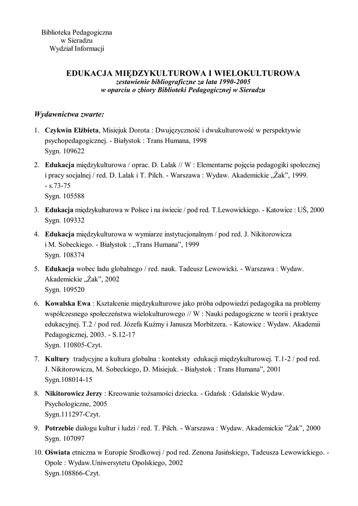 Biblioteka Pedagogiczna w Sieradzu Wydział Informacji EDUKACJA MIĘDZYKULTUROWA I WIELOKULTUROWA zestawienie bibliograficzne za lata 1990-2005 w oparciu o zbiory Biblioteki Pedagogicznej w Sieradzu Wydawnictwa zwarte: 1. Czykwin Elżbieta, Misiejuk Dorota : Dwujęzyczność i dwukulturowość w perspektywie psychopedagogicznej. - Białystok : Trans Humana, 1998 Sygn. 109622 2. Edukacja międzykulturowa / oprac. D. Lalak // W : Elementarne pojęcia pedagogiki społecznej i pracy socjalnej / red. D. Lalak i T. Pilch. - Warszawa : Wydaw. Akademickie „Żak”, 1999. - s.73-75 Sygn. 105588 3. Edukacja międzykulturowa w Polsce i na świecie / pod red. T.Lewowickiego. - Katowice : UŚ, 2000 Sygn. 109332 4. Edukacja międzykulturowa w wymiarze instytucjonalnym / pod red. J. Nikitorowicza i M. Sobeckiego. - Białystok : „Trans Humana”, 1999 Sygn. 108374 5. Edukacja wobec ładu globalnego / red. nauk. Tadeusz Lewowicki. - Warszawa : Wydaw. Akademickie „Żak”, 2002 Sygn. 109520 6. Kowalska Ewa : Kształcenie międzykulturowe jako próba odpowiedzi pedagogika na problemy współczesnego społeczeństwa wielokulturowego // W : Nauki pedagogiczne w teorii i praktyce edukacyjnej. T.2 / pod red. Józefa Kuźmy i Janusza Morbitzera. - Katowice : Wydaw. Akademii Pedagogicznej, 2003. - S.12-17 Sygn. 110805-Czyt. 7. Kultury tradycyjne a kultura globalna : konteksty edukacji międzykulturowej. T.1-2 / pod red. J. Nikitorowicza, M. Sobeckiego, D. Misiejuk. - Białystok : Trans Humana”, 2001 Sygn.108014-15 8. Nikitorowicz Jerzy : Kreowanie tożsamości dziecka. - Gdańsk : Gdańskie Wydaw. Psychologiczne, 2005 Sygn.111297-Czyt. 9. Potrzebie dialogu kultur i ludzi / red. T. Pilch. - Warszawa : Wydaw. Akademickie ”Żak”, 2000 Sygn. 107097 10. Oświata etniczna w Europie Srodkowej / pod red. Zenona Jasińskiego, Tadeusza Lewowickiego. Opole : Wydaw.Uniwersytetu Opolskiego, 2002 Sygn.108866-Czyt. 11. Paszkowska Romana : Rola komunikacji międzykulturowej w ksztaceniu studentów w grupach międzynarodowych // W : Edukacja wobec integracji europejskiej / red. Nauk. Jerzy Kojkoł, Piotr Jan Przybysz. - Gdynia : Akademia Marynarki Wojennej, 2004. - S.43-52 Sygn. 11025-czyt. 12. Pedagogika i edukacja wobec nowych wspólnot i różnic w jednoczącej się Europie : materiały z IV Ogólnopolskiego Zjazdu Pedagogicznego / pod red. Eugenii Malewskiej i Bogusława Śliwerskiego. - Kraków : „Impuls”, 2002 13. Rabczuk Wiktor : Polityka edukacyjna Unii Europejskiej wobec imigrantów oraz mniejszości narodowych i etnicznych. - Warszawa : Instytut Badań Edukacyjnych, 2002 Sygn.96470 14. Suchodolska Jolanta : Rola edukacji w kształtowaniu postaw i orientacji proeuropejskich młodzieży – uwagi sformułowane na podstawie wyników badań na pograniczu polsko-czeskim // W : Młodzież a dorośli : napięcia między socjalizacją a wychowaniem / red. Nauk. Roma Kwiecińska, Mirosław J. Szymański. - Kraków : Instytut Technologii Eksploatacji, 2001. - s. 118-128 Sygn. 108963 15. Szerląg Alicja : Ku międzykulturowości – aksjologiczne impoonderabilia // W : Edukacja ku wartościom / pod red. Alicji Szerląg. - Kraków : „Impuls”, 2004. - s. 97-111 Sygn.111195-Czyt. Artykuły z czasopism 1. Aleksandrowicz-Pędlich Lucyna : Międzykulturowość w nauczaniu języków obcych // Języki Obce w Szkole. - 2001, nr 6, s. 251-256 2. Chrobak Stanisław : Kultura w edukacji europejskiej – inspiracje chrześcijańskie // Wychowanie na co Dzień. - 2001, nr 3, s. 10-12 3. Duboniewicz Marta : Wzajemne przenikanie się kultur // Edukacja i Dialog. - 2005, nr 9, s. 53-56 4. Dyba Krystyna : Szukać podobieństw, rozumieć różnicę – edukacja międzykulturowa w szkole : jakiej edukacji nam potrzeba? // Dyrektor Szkoły. - 2002, nr 6, s. 11-13 5. Górniewicz Józef : Idea tolerancji w edukacji międzykulturowej (na przykładzie Międzynarodowego Centrum Edukacyjnego Uniwersytetu Warmińsko-Mazurskiego w Olsztynie) // Wychowanie na co Dzień . - 2003, nr 1/ 2, s. 16-18 6. Jackiewicz Agnieszka : Refleksje z wymiany polsko-fińskiej // Języki Obce w Szkole. - 2004, nr 6, s. 278-280 7. Jeżowski Antoni : Nauczyciele w Unii Europejskiej // Dyrektor Szkoły. - 2001, nr 9, s. 17-20 8. Kamińska Krystyna : Edukacja wobec imigracji jako nowego zjawiska społecznego w Polsce // Edukacja .- 2002, nr 4, s. 20-29 9. Kamińska Krystyna : Zjawisko wielokulturowości w wychowaniu przedszkolnym // Wychowanie w Przedszkolu. - 2002, nr 5, s. 259-266 10. Kapica Gabriela : Przygotowanie do partnerstwa kulturowego // Życie Szk. - 2004, nr 5, s. 3-10 11. Kowalczewska-Grabowska Katarzyna : Szkoła w nowej Europie // Edukacja i Dialog. - 2002, nr 10, s. 65-69 12. Mach Elżbieta : Polska szkoła a wyzwania międzykulturowości // Edukacja. - 2001, nr 2, s. 87-96 13. Masalska Ewa : Edukacja międzykulturowa w polskiej szkole // Kwartalnik Pedagogiczny.- 1999, nr 1, s. 73-86 14. Michalik Urszula : Kształtowanie świadomości kulturowej oraz poprawianie komunikacji międzykulturowej jako niezbędny element edukacji w dobie globalizmu // Nauczyciel i Szk. - 2005, nr 1/2, s. 25-39 15. Nalaskowski Stanisław : Globalizm – odniesienie edukacyjne // Wychowanie na co Dzień. - 2001, nr 9, s. 15-16 16. Nasalska Ewa : Edukacja międzykulturowa w polskiej szkole. // Kwartalnik Pedagogiczny. - 1999, nr 1, s. 73-86 17. Nikitorowicz Jerzy : Język matczyny – wartość kulturowa i cel edukacyjny. // Edukacja. - 2000, nr 4, s. 38-46 18. Nowakowska Renata : Migracja w wybranych krajach Europy a wychowanie międzykulturowe // Kwartalnik Pedagogiczny. - 2001, nr 3/ 4, s. 77-85 19. Pasiecka Małgorzata, Krajewski Grzegorz : Stacjonarny tandem językowy – o rozwijaniu kompetencji międzykulturowej // Języki Obce w Szk. - 2002, nr 3, s. 16-22 20. Rusaczyk Janusz : Wielokulturowość w edukacji // Nowa Szk. - 2005, nr 5, s. 4-8 21. Sawicka-Wielgasik Sabina : Klasy wielokulturowe we Włoszech // Nowa Szk. - 2002, nr 5, s. 51-52 22. Schmidt Joanna : Di