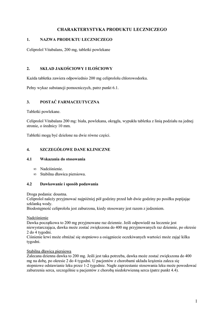 CHARAKTERYSTYKA PRODUKTU LECZNICZEGO 1. NAZWA PRODUKTU LECZNICZEGO Celiprolol Vitabalans, 200 mg, tabletki powlekane 2. SKŁAD JAKOŚCIOWY I ILOŚCIOWY Każda tabletka zawiera odpowiednio 200 mg celiprololu chlorowodorku. Pełny wykaz substancji pomocniczych, patrz punkt 6.1. 3. POSTAĆ FARMACEUTYCZNA Tabletki powlekane. Celiprolol Vitabalans 200 mg: biała, powlekana, okrągła, wypukła tabletka z linią podziału na jednej stronie, o średnicy 10 mm. Tabletki mogą być dzielone na dwie równe części. 4. SZCZEGÓŁOWE DANE KLINICZNE 4.1 Wskazania do stosowania • • 4.2 Nadciśnienie. Stabilna dławica piersiowa. Dawkowanie i sposób podawania Droga podania: doustna. Celiprolol należy przyjmować najpóźniej pół godziny przed lub dwie godziny po posiłku popijając szklanką wody. Biodostępność celiprololu jest zaburzona, kiedy stosowany jest razem z jedzeniem. Nadciśnienie Dawka początkowa to 200 mg przyjmowane raz dziennie. Jeśli odpowiedź na leczenie jest niewystarczająca, dawka może zostać zwiększona do 400 mg przyjmowanych raz dziennie, po okresie 2 do 4 tygodni. Ciśnienie krwi może obniżać się stopniowo a osiągniecie oczekiwanych wartości może zająć kilka tygodni. Stabilna dławica piersiowa Zalecana dzienna dawka to 200 mg. Jeśli jest taka potrzeba, dawka może zostać zwiększona do 400 mg na dobę, po okresie 2 do 4 tygodni. U pacjentów z chorobami układu krążenia zaleca się stopniowe odstawianie leku przez 1-2 tygodnie. Nagłe zaprzestanie stosowania leku może powodować zaburzenia serca, szczególnie u pacjentów z chorobą niedokrwienną serca (patrz punkt 4.4). 1 Pacjenci w podeszłym wieku Dostępne są jedynie ograniczone dane dotyczące stosowania leku u pacjentów w podeszłym wieku. Należy zachować ostrożność stosujące lek Celiprolol u pacjentów w tej grupie wiekowej (patrz punkt 4.4). Dzieci Celiprolol nie jest wskazany do stosowania u dzieci. Zaburzenia czynności nerek Zwykle nie jest konieczne zmniejszanie dawki u pacjentów z łagodną niewydolnością nerek. Celiprolol powinien być stosowany z zachowaniem ostrożności u pacjentów, u których klirens kreatyniny wynosi 15-40 ml/min a dawka powinna zostać zmniejszona do 100 mg raz na dobę (patrz punkt 4.4). Celiprolol jest przeciwwskazany u pacjentów z klirensem kreatyniny mniejszym niż 15 ml/min (patrz punkt 4.3). Zaburzenia czynności wątroby Dostępne są ograniczone dane dotyczące stosowania leku przez pacjentów z niewydolnością wątroby. Dlatego też Celiprolol należy stosować z ostrożnością i rozważyć zmniejszenie dawki u pacjentów z łagodną do umiarkowanej niewydolnością wątroby (patrz punkt 4.4). Celiprolol przeciwwskazany jest u pacjentów z ostrą niewydolnością wątroby (patrz punkt 4.3). 4.3 Przeciwwskazania • • • • • • • • • • • • • • • • • • 4.4 Nadwrażliwość na substancję czynną lub jakikolwiek składnik leku Wstrząs kardiogenny Znaczna bradykardia (mniej niż 50 uderzeń na minutę) Niewyrównana niewydolność serca Zespół chorego węzła zatokowego Blok przedsionkowo-komorowy drugiego lub trzeciego stopnia Guz chromochłonny Kwasica metaboliczna Blok zatokowo -przedsionkowy Dławica Prinzmetala Niedociśnienie (ciśnienie skurczowe poniżej 100 mmHg) Ciężka niewydolność nerek (klirens kreatyniny poniżej 15 ml/min) Przewlekła obturacyjna choroba płuc Ostre napady astmy Skurcz oskrzeli lub astma oskrzelowa Późne stadium choroby zarostowej tętnic obwodowych lub zespół Raynaud Ostra niewydolność wątroby Jednoczesne stosowanie inhibitorów MAO (z wyjątkiem inhibitorów MAO-B) Specjalne ostrzeżenia i środki ostrożności dotyczące stosowania Dostępne są jedynie ograniczone dane dotyczące stosowania leku u pacjentów w podeszłym wieku. Należy zachować ostrożność stosujące lek Celiprolol u pacjentów w tej grupie wiekowej. Pacjenci w podeszłym wieku powinni być regularnie monitorowani ze względu na częste zaburzenia czynności nerek i wątroby w tej grupie wiekowej. Celiprolol może być stosowany u pacjentów z ograniczoną funkcją nerek w stopniu łagodnym do umiarkowanego, ponieważ jest on wydzielany drogą nerkową jak i pozanerkową. Zmniejszenie dawki do 100 mg raz dziennie jest właściwe u pacjentów z klirensem kreatyniny pomiędzy 15 do 40 ml/min. 2 Celiprolol jest przeciwwskazany u pacjentów, u których klirens kreatyniny jest mniejszy niż 15 ml/min. Dostępne są ograniczone dane dotyczące stosowania leku u pacjentów z niewydolnością wątroby. Pacjenci z łagodną do umiarkowanej niewydolnością wątroby powinni być dokładnie monitorowani po rozpoczęciu terapii jak również należy rozważyć zmniejszenie dawki. Celiprolol przeciwwskazany jest u pacjentów z ciężką niewydolnością wątroby. Nagłe odstawienie środków blokujących receptor beta-adrenergiczny u pacjentów z chorobą niedokrwienną serca może powodować zwiększoną częstość i cięższy przebiegu napadów dławicy piersiowej lub pogorszenie stanu serca. Mimo że w badaniach klinicznych nie obserwowano żadnych działań niepożądanych po nagłym zaprzestaniu stosowania celiprololu, dawka powinna być stopniowo zmniejszana przez 1do2 tygodni, Jeśli to konieczne, należy rozpocząć inne leczenie, aby zapobiec zaostrzeniu objawów dławicy piersiowej. Anestezjolog powinien zostać poinformowany o stosowaniu celiprololu w przypadku konieczności zastosowania znieczulenia ogólnego. Jeśli leczenie jest wstrzymywane przed znieczuleniem, powinno to następować stopniowo jak również należy zachować odstęp 48-godzinny między ostatnią dawką celiprololu a znieczuleniem. Kontynuacja stosowania beta-blokerów obniża ryzyko zaburzeń rytmu serca podczas wprowadzania do znieczulania i intubacji. U pacjentów z dławicą piersiową i towarzyszącymi zaburzeniami krążenia obwodowego (chromanie przestankowe), beta-blokery powinny byś stosowane niezwykle ostrożni