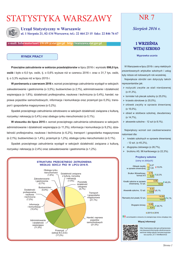 NR 7 STATYSTYKA WARSZAWY Sierpień 2016 r. Urząd Statystyczny w Warszawie ul. 1 Sierpnia 21, 02-134 Warszawa; tel.: 22 464 23 15 faks: 22 846 76 67 e-mail: [email protected] http://warszawa.stat.gov.pl 1 WRZEŚNIA WITAJ SZKOŁO Wyprawka ucznia RYNEK PRACY Przeciętne zatrudnienie w sektorze przedsiębiorstw w lipcu 2016 r. wyniosło 996,0 tys. osób i było o 6,0 tys. osób, tj. o 0,6% wyższe niż w czerwcu 2016 r. oraz o 31,7 tys. osób, tj. o 3,3% wyższe niż w lipcu 2015 r. W Warszawie w lipcu 2016 r. ceny niektórych prezentowanych artykułów szkolnych i usług były niższe od notowanych rok wcześniej. Największe obniżki cen dotyczyły takich W porównaniu z czerwcem 2016 r. wzrost przeciętnego zatrudnienia wystąpił w sekcjach: zakwaterowanie i gastronomia (o 3,5%), budownictwo (o 2,1%), administrowanie i działalność wspierająca (o 1,8%), działalność profesjonalna, naukowa i techniczna (o 0,4%), handel; na- reprezentantów jak: nożyczki zwykłe ze stali nierdzewnej (o 41,3%), tornister lub plecak szkolny (o 25,0%), prawa pojazdów samochodowych, informacja i komunikacja oraz przemysł (po 0,3%), trans- krzesło obrotowe (o 20,0%), port i gospodarka magazynowa (o 0,2%). ołówek zwykły w oprawie drewnianej Spadek przeciętnego zatrudnienia odnotowano w sekcjach działalność związana z kulturą, rozrywką i rekreacją (o 0,4%) oraz obsługa rynku nieruchomości (o 0,1%). W stosunku do lipca 2015 r. wzrost przeciętnego zatrudnienia odnotowano w sekcjach: administrowanie i działalność wspierająca (o 11,3%), informacja i komunikacja (o 9,2%), działalność profesjonalna, naukowa i techniczna (o 6,2%), transport i gospodarka magazynowa (o 2,1%), budownictwo (o 1,4%), przemysł (o 1,2%), obsługa rynku nieruchomości (o 0,1%). Spadek przeciętnego zatrudnienia wystąpił w sekcjach działalność związana z kulturą, rozrywką i rekreacją (o 2,4%) oraz zakwaterowanie i gastronomia (o 1,2%). STRUKTURA PRZECIĘTNEGO ZATRUDNIENIA WEDŁUG SEKCJI PKD W LIPCU 2016 R. Obsługa rynku nieruchomości (1,6%) Zakwaterowanie i gastronomia (2,7%) Działalność profesjonalna, naukowa i techniczna (7,2%) Budownictwo (5,0%) (o 15,0%), obiad w stołówce szkolnej, dwudaniowy (o 14,7%), akwarele szkolne - 12 szt (o 8,1%). Największy wzrost cen zaobserwowano natomiast dla: kredek szkolnych w oprawie drewnianej - 12 szt. (o 45,2%), długopisu żelowego (o 26,7%), brulionu A5, 96 kartkowego (o 22,3%). Przybory szkolne (ceny w złotych) Działalność związana z kulturą, rozrywką i rekreacją (1,5%) Pozostała działalność usługowa (0,7%) Transport i gospodarka magazynowa (21,1%) Informacja i komunikacja (10,4%) Handel; naprawa pojazdów samochodowych (21,0%) Administrowanie i działalność wspierająca (11,5%) Przemysł (sekcje B,C,D,E) (17,2%) Więcej informacji http://warszawa.stat.gov.pl/opracowania-biezace/informacje-okolicznosciowe/inne-/witaj-szkolo-cenowa-wyprawka-ucznia-,27,7.html#archive Strona 1 RYNEK PRACY (dok.) Podstawowe dane o m.st. Warszawie W końcu lipca 2016 r. liczba zarejestrowanych bezrobotnych wyniosła 36938 osób, była o 744 osoby, tj. o 2,0% mniejsza niż w końcu czerwca 2016 r. i o 7326 osób, Przeciętne zatrudnienie w sektorze przedsiębiorstw w lipcu 2016 r. wyniosło 996,0 tys. osób i było o 3,3% wyższe niż przed rokiem. Przeciętne miesięczne wynagrodzenie brutto w sektorze przedsiębiorstw w lipcu 2016 r. wyniosło 5429,69 zł i było o 3,1% wyższe niż w lipcu 2015 r. tj. o 16,6% mniejsza niż w analogicznym okresie 2015 r. Liczba zarejestrowanych bezrobotnych kobiet wyniosła 18464, co stanowiło 50,0% ogółu bezrobotnych (przed miesiącem 49,3%, przed rokiem 48,6%) i 18,5% bezrobotnych kobiet w województwie mazowieckim. W stosunku do czerwca 2016 r. liczba bezrobotnych kobiet zmniejszyła się o 112 osób, tj. o 0,6%, a w stosunku do lipca 2015 r. zmniejszyła się o 3036 osób, tj. o 14,1%. Stopa bezrobocia rejestrowanego wynosiła 3,1% (przed miesiącem 3,2%, a przed rokiem 3,8%), średnia w województwie mazowieckim kształtowała się na poziomie 7,7% (przed miesiącem 7,8%, a przed rokiem 8,7%), natomiast w kraju na poziomie 8,6% (przed miesią- W końcu lipca 2016 r. liczba zarejestrowanych bezrobotnych wyniosła 36938 osób i była o 16,6% mniejsza niż przed rokiem, a stopa bezrobocia ukształtowała się na poziomie 3,1%. cem 8,8%, a przed rokiem 10,0%). W lipcu 2016 r. w urzędach pracy zarejestrowano 3662 osoby bezrobotne (3838 w czerwcu 2016 r., a 4555 w lipcu 2015 r.). Bezrobotni zarejestrowani stanowili 19,0% ogółu zarejestrowanych bezrobotnych w województwie. Liczba osób rejestrujących się po raz pierwszy wyniosła 1099 (przed miesiącem 1091), W końcu lipca 2016 r. liczba kobiet, które nie podjęły zatrudnienia po urodzeniu dziecka wyniosła 3487, tj. 18,9% ogółu zarejestrowanych bezrobotnych kobiet. co stanowiło 30,0% ogółu zarejestrowanych bezrobotnych, którzy zarejestrowali się w lipcu br. oraz 24,6% zarejestrowanych po raz pierwszy w województwie. Udział osób zwolnionych z przyczyn dotyczących zakładu pracy wśród bezrobotnych zarejestrowanych w lipcu 2016 r. wyniósł 7,3% (w województwie mazowieckim 5,6%), przed miesiącem 4,1%, a przed rokiem 5,5%. Produkcja sp r z ed ana p r z emys ł u (w cenach stałych) w lipcu 2016 r. była o 6,5% mniejsza niż przed rokiem. W lipcu 2016 r. wyrejestrowano z ewidencji bezrobotnych 4406 osób (4725 w czerwcu 2016 r., a 5014 w lipcu 2015 r.), co stanowiło 20,1% wyrejestrowanych z ewidencji bezrobotnych w województwie mazowieckim. Spośród wyrejestrowanych bezrobotnych 1967 osób podjęło pracę. Ponadto 1563 osoby utraciły status bezrobotnego w wyniku niepotwierdzenia Produkcja budowlano-montażowa (w cenach bieżących) w lipcu 2016 r. była o 6,0% mniejsza niż przed rokiem. gotowości do podjęcia pracy. Przyczyną skreślenia z ewidencji było również dobrowolne zrezygnowanie ze statusu bezrobotnego, rozpoczęcie szkolenia lub stażu, n