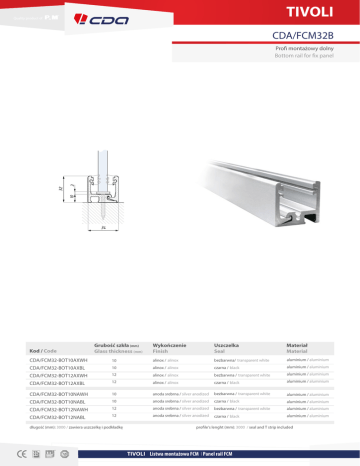 TIVOLI Quality product of CDA/FCM32B 10 32 3 Profi montażowy dolny Bottom rail for fix panel 34 Kod / Code Grubość szkła (mm) Glass thickness (mm) Wykończenie Finish Uszczelka Seal Materiał Material CDA/FCM32-BOT10AXWH 10 alinox / alinox bezbarwna/ transparent white aluminium / aluminium CDA/FCM32-BOT10AXBL 10 alinox / alinox czarna / black aluminium / aluminium CDA/FCM32-BOT12AXWH 12 alinox / alinox bezbarwna / transparent white aluminium / aluminium CDA/FCM32-BOT12AXBL 12 alinox / alinox czarna / black aluminium / aluminium CDA/FCM32-BOT10NAWH 10 anoda srebrna / silver anodized bezbarwna / transparent white aluminium / aluminium CDA/FCM32-BOT10NABL 10 anoda srebrna / silver anodized czarna / black aluminium / aluminium CDA/FCM32-BOT12NAWH 12 anoda srebrna / silver anodized bezbarwna / transparent white aluminium / aluminium CDA/FCM32-BOT12NABL 12 anoda srebrna / silver anodized czarna / black aluminium / aluminium długość (mm): 3000 / zawiera uszczelkę i podkładkę profile’s lenght (mm): 3000 / seal and T strip included TIVOLI Listwa montażowa FCM І Panel rail FCM TIVOLI Quality product of CDA/ FCM Profile montażowe FCM - przekroje FCM rail for fix panels - sections FCM32T 26 10 3 34 FCM26B FCM32B TIVOLI Listwa montażowa FCM І Panel rail FCM H h H 8.5 3 32 26 h 32 26 8-16 8-16 FCM26T TIVOLI Quality product of CDA/FCM Profile montażowe FCM - przekroje FCM rail for fix panels - sections h 3 108 3 66 86 88 34 34 FCM80B FCM100B TIVOLI Listwa montażowa FCM І Panel rail FCM H 32 H h 32 8-16 FCM32T 8-16 FCM32T