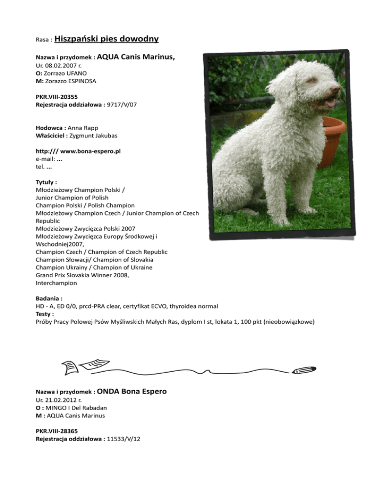 Rasa : Hiszpański pies dowodny Nazwa i przydomek : AQUA Canis Marinus, Ur. 08.02.2007 r. O: Zorrazo UFANO M: Zorazzo ESPINOSA PKR.VIII-20355 Rejestracja oddziałowa : 9717/V/07 Hodowca : Anna Rapp Właściciel : Zygmunt Jakubas http:/// www.bona-espero.pl e-mail: ... tel. ... Tytuły : Młodzieżowy Champion Polski / Junior Champion of Polish Champion Polski / Polish Champion Młodzieżowy Champion Czech / Junior Champion of Czech Republic Młodzieżowy Zwycięzca Polski 2007 Młodzieżowy Zwycięzca Europy Środkowej i Wschodniej2007, Champion Czech / Champion of Czech Republic Champion Słowacji/ Champion of Slovakia Champion Ukrainy / Champion of Ukraine Grand Prix Slovakia Winner 2008, Interchampion Badania : HD - A, ED 0/0, prcd-PRA clear, certyfikat ECVO, thyroidea normal Testy : Próby Pracy Polowej Psów Myśliwskich Małych Ras, dyplom I st, lokata 1, 100 pkt (nieobowiązkowe) Nazwa i przydomek : ONDA Bona Espero Ur. 21.02.2012 r. O : MINGO I Del Rabadan M : AQUA Canis Marinus PKR.VIII-28365 Rejestracja oddziałowa : 11533/V/12 Hodowca : Zygmunt Jakubas Właściciel : Zygmunt Jakubas http:/// www.bona-espero.pl e-mail: ... tel. ... Tytuły : Młodzieżowy Champion Polski /Junior Champion of Polish Młodzieżowy Champion Czech / Junior Champion of Czech Republic Zwycięzca Klubu Czeskiego ( KCHLS ) 2013 Champion Słowacji Zwycięzca Czech 2014 Badania : HD- A/A , ED- 0/0 prcd-PRA- wolny CHG ( Congenitale Hypothyroidea ) - wolny certyfikat ECVO Goniodysplazja - wolny Testy :