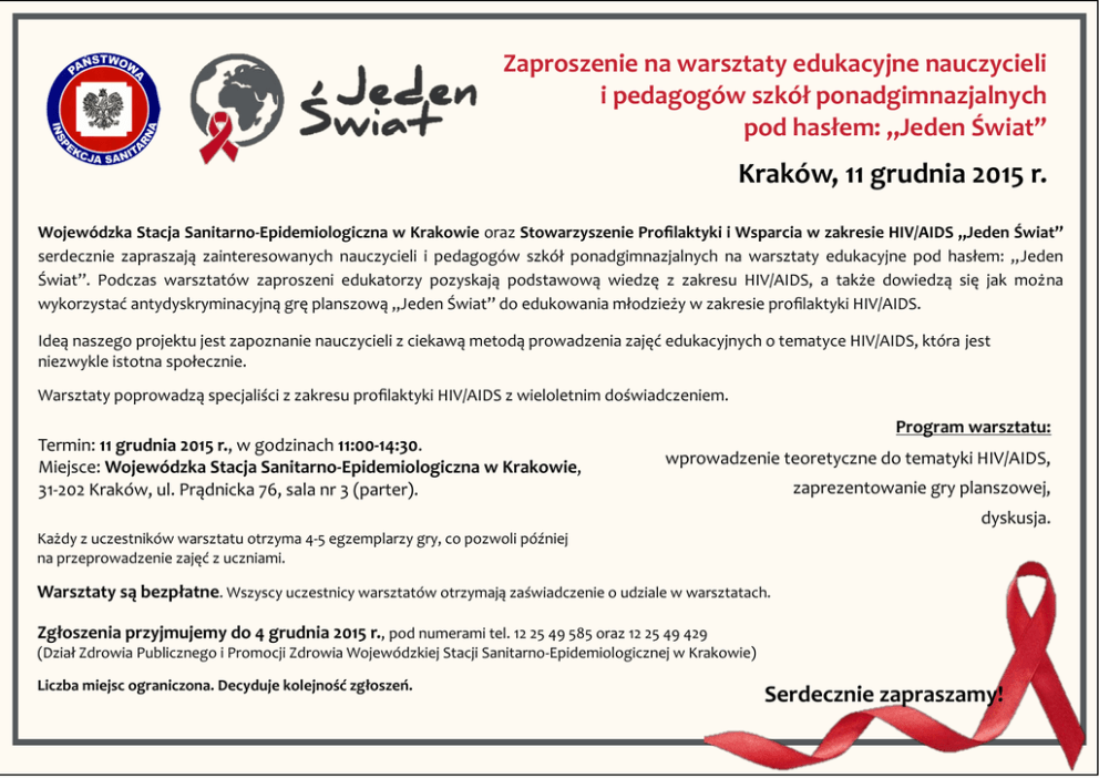 Zaproszenie na warsztaty edukacyjne nauczycieli i pedagogów szkół ponadgimnazjalnych pod hasłem: „Jeden Świat” Kraków, 11 grudnia 2015 r. Wojewódzka Stacja Sanitarno-Epidemiologiczna w Krakowie oraz Stowarzyszenie Profilaktyki i Wsparcia w zakresie HIV/AIDS „Jeden Świat” serdecznie zapraszają zainteresowanych nauczycieli i pedagogów szkół ponadgimnazjalnych na warsztaty edukacyjne pod hasłem: „Jeden Świat”. Podczas warsztatów zaproszeni edukatorzy pozyskają podstawową wiedzę z zakresu HIV/AIDS, a także dowiedzą się jak można wykorzystać antydyskryminacyjną grę planszową „Jeden Świat” do edukowania młodzieży w zakresie profilaktyki HIV/AIDS. Ideą naszego projektu jest zapoznanie nauczycieli z ciekawą metodą prowadzenia zajęć edukacyjnych o tematyce HIV/AIDS, która jest niezwykle istotna społecznie. Warsztaty poprowadzą specjaliści z zakresu profilaktyki HIV/AIDS z wieloletnim doświadczeniem. Termin: 11 grudnia 2015 r., w godzinach 11:00-14:30. Miejsce: Wojewódzka Stacja Sanitarno-Epidemiologiczna w Krakowie, 31-202 Kraków, ul. Prądnicka 76, sala nr 3 (parter). Program warsztatu: wprowadzenie teoretyczne do tematyki HIV/AIDS, zaprezentowanie gry planszowej, dyskusja. Każdy z uczestników warsztatu otrzyma 4-5 egzemplarzy gry, co pozwoli później na przeprowadzenie zajęć z uczniami. Warsztaty są bezpłatne. Wszyscy uczestnicy warsztatów otrzymają zaświadczenie o udziale w warsztatach. Zgłoszenia przyjmujemy do 4 grudnia 2015 r., pod numerami tel. 12 25 49 585 oraz 12 25 49 429 (Dział Zdrowia Publicznego i Promocji Zdrowia Wojewódzkiej Stacji Sanitarno-Epidemiologicznej w Krakowie) Liczba miejsc ograniczona. Decyduje kolejność zgłoszeń. Serdecznie zapraszamy!