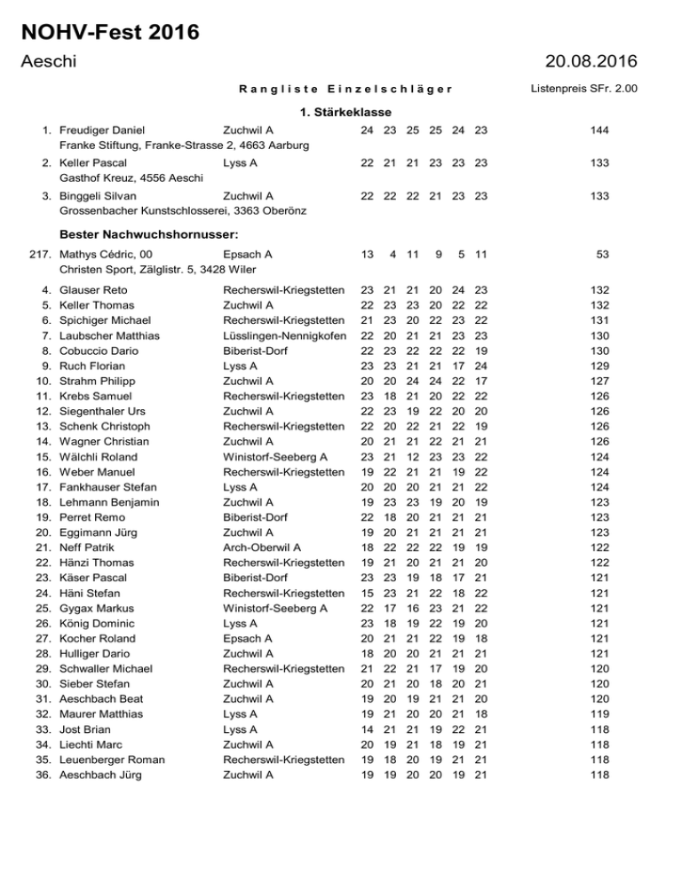 NOHV-Fest 2016 Aeschi 20.08.2016 Listenpreis SFr. 2.00 Rangliste Einzelschläger 1. Stärkeklasse 1. Freudiger Daniel Zuchwil A Franke Stiftung, Franke-Strasse 2, 4663 Aarburg 24 23 25 25 24 23 144 2. Keller Pascal Gasthof Kreuz, 4556 Aeschi 22 21 21 23 23 23 133 22 22 22 21 23 23 133 Lyss A 3. Binggeli Silvan Zuchwil A Grossenbacher Kunstschlosserei, 3363 Oberönz Bester Nachwuchshornusser: 217. Mathys Cédric, 00 Epsach A Christen Sport, Zälglistr. 5, 3428 Wiler 4. 5. 6. 7. 8. 9. 10. 11. 12. 13. 14. 15. 16. 17. 18. 19. 20. 21. 22. 23. 24. 25. 26. 27. 28. 29. 30. 31. 32. 33. 34. 35. 36. Glauser Reto Keller Thomas Spichiger Michael Laubscher Matthias Cobuccio Dario Ruch Florian Strahm Philipp Krebs Samuel Siegenthaler Urs Schenk Christoph Wagner Christian Wälchli Roland Weber Manuel Fankhauser Stefan Lehmann Benjamin Perret Remo Eggimann Jürg Neff Patrik Hänzi Thomas Käser Pascal Häni Stefan Gygax Markus König Dominic Kocher Roland Hulliger Dario Schwaller Michael Sieber Stefan Aeschbach Beat Maurer Matthias Jost Brian Liechti Marc Leuenberger Roman Aeschbach Jürg Recherswil-Kriegstetten Zuchwil A Recherswil-Kriegstetten Lüsslingen-Nennigkofen Biberist-Dorf Lyss A Zuchwil A Recherswil-Kriegstetten Zuchwil A Recherswil-Kriegstetten Zuchwil A Winistorf-Seeberg A Recherswil-Kriegstetten Lyss A Zuchwil A Biberist-Dorf Zuchwil A Arch-Oberwil A Recherswil-Kriegstetten Biberist-Dorf Recherswil-Kriegstetten Winistorf-Seeberg A Lyss A Epsach A Zuchwil A Recherswil-Kriegstetten Zuchwil A Zuchwil A Lyss A Lyss A Zuchwil A Recherswil-Kriegstetten Zuchwil A 13 23 22 21 22 22 23 20 23 22 22 20 23 19 20 19 22 19 18 19 23 15 22 23 20 18 21 20 19 19 14 20 19 19 4 11 21 23 23 20 23 23 20 18 23 20 21 21 22 20 23 18 20 22 21 23 23 17 18 21 20 22 21 20 21 21 19 18 19 21 23 20 21 22 21 24 21 19 22 21 12 21 20 23 20 21 22 20 19 21 16 19 21 20 21 20 19 20 21 21 20 20 9 20 20 22 21 22 21 24 20 22 21 22 23 21 21 19 21 21 22 21 18 22 23 22 22 21 17 18 21 20 19 18 19 20 5 11 24 22 23 23 22 17 22 22 20 22 21 23 19 21 20 21 21 19 21 17 18 21 19 19 21 19 20 21 21 22 19 21 19 23 22 22 23 19 24 17 22 20 19 21 22 22 22 19 21 21 19 20 21 22 22 20 18 21 20 21 20 18 21 21 21 21 53 132 132 131 130 130 129 127 126 126 126 126 124 124 124 123 123 123 122 122 121 121 121 121 121 121 120 120 120 119 118 118 118 118 37. 38. 39. 40. 41. 42. 43. 44. 45. 46. 47. 48. 49. 50. 51. 52. 53. 54. 55. 56. 57. 58. 59. 60. 61. 62. 63. 64. 65. 66. 67. 68. 69. 70. 71. 72. 73. 74. 75. 76. 77. 78. 79. 80. 81. 82. 83. 84. 85. 86. Reusser Marc Hugi Jörg Gasche Patrick Winzenried Remo Siegrist Conradin Weber Stefan Helbling Lorenz Zbinden Reto Christen Fabian Moser Thomas Salzmann Bernhard Schöni Remo Althaus Christian Däppen Samuel Keller Heinz Kölliker Roman Kuster Stefan Moser Michael Mühlethaler Reto Schluep Christian Schneider Lars Stuker Mario Wyss Walter Glauser Roger Möri Roman Wyss Stefan Andres Marcel Heiniger Markus Kaufmann Daniel Münger Marc Neuhaus Hansueli Rätz Dominik Wenger Stefan Wyss Fredi Hirsbrunner Thomas Rizza Davide Binggeli Urs Marbot Daniel Rytz Michael Theiler Marc Gasche Erich Helbling Simon Möri Stefan Moser Thomas Rufer Michael Fankhauser Reto Gasche Matthias Friedli Andreas Otti Daniel Rüttimann Raphael Recherswil-Kriegstetten Arch-Oberwil A Obergerlafingen A Recherswil-Kriegstetten Epsach A Lyss A Epsach A Aetingen A Recherswil-Kriegstetten Zuchwil A Recherswil-Kriegstetten Obergerlafingen A Zuchwil A Lüsslingen-Nennigkofen Lyss A Recherswil-Kriegstetten Arch-Oberwil A Lyss A Recherswil-Kriegstetten Lüsslingen-Nennigkofen Obergerlafingen A Arch-Oberwil A Lüsslingen-Nennigkofen Epsach A Epsach A Messen Messen Zuchwil A Obergerlafingen A Arch-Oberwil A Arch-Oberwil A Messen Recherswil-Kriegstetten Arch-Oberwil A Obergerlafingen A Gossau A Winistorf-Seeberg A Lyss A Lyss A Recherswil-Kriegstetten Recherswil-Kriegstetten Epsach A Epsach A Lyss A Lüsslingen-Nennigkofen Aetingen A Obergerlafingen A Gossau A Arch-Oberwil A Biberist-Dorf 19 21 20 18 21 16 20 20 19 21 17 19 21 20 18 20 18 20 20 21 19 18 21 18 117 116 116 116 116 87. Ryser Marcel Aetingen A 116 88. Schaller Reto Lyss A 115 89. Winistörfer André Winistorf-Seeberg A 115 ###### 105 Punkte 114 Kranz: Zweitauszeichnung: ###### 94 Punkte 114 114 114 113 113 113 113 113 112 112 112 112 112 112 111 111 111 110 110 110 110 110 110 110 110 109 109 108 108 108 108 107 107 107 107 107 106 106 105 105 105 105 105 105
