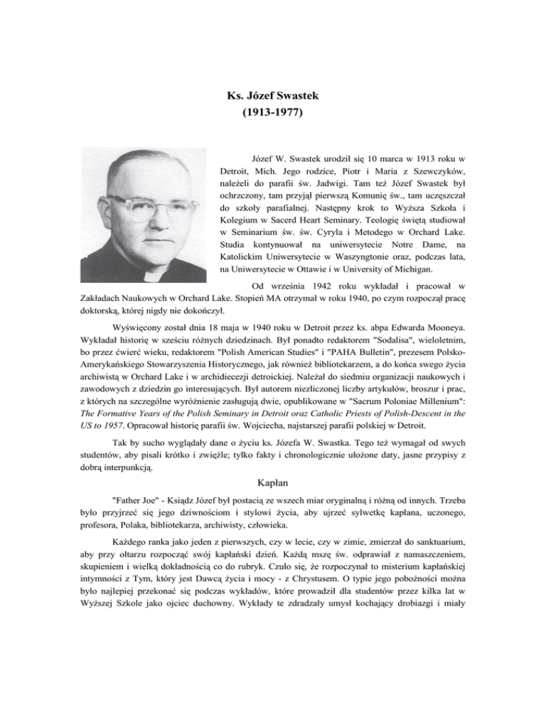 Ks. Józef Swastek (1913-1977) Józef W. Swastek urodził się 10 marca w 1913 roku w Detroit, Mich. Jego rodzice, Piotr i Maria z Szewczyków, należeli do parafii św. Jadwigi. Tam też Józef Swastek był ochrzczony, tam przyjął pierwszą Komunię św., tam uczęszczał do szkoły parafialnej. Następny krok to Wyższa Szkoła i Kolegium w Sacerd Heart Seminary. Teologię świętą studiował w Seminarium św. św. Cyryla i Metodego w Orchard Lake. Studia kontynuował na uniwersytecie Notre Dame, na Katolickim Uniwersytecie w Waszyngtonie oraz, podczas lata, na Uniwersytecie w Ottawie i w University of Michigan. Od września 1942 roku wykładał i pracował w Zakładach Naukowych w Orchard Lake. Stopień MA otrzymał w roku 1940, po czym rozpoczął pracę doktorską, której nigdy nie dokończył. Wyświęcony został dnia 18 maja w 1940 roku w Detroit przez ks. abpa Edwarda Mooneya. Wykładał historię w sześciu różnych dziedzinach. Był ponadto redaktorem "Sodalisa", wieloletnim, bo przez ćwierć wieku, redaktorem "Polish American Studies" i "PAHA Bulletin", prezesem PolskoAmerykańskiego Stowarzyszenia Historycznego, jak również bibliotekarzem, a do końca swego życia archiwistą w Orchard Lake i w archidiecezji detroickiej. Należał do siedmiu organizacji naukowych i zawodowych z dziedzin go interesujących. Był autorem niezliczonej liczby artykułów, broszur i prac, z których na szczególne wyróżnienie zasługują dwie, opublikowane w "Sacrum Poloniae Millenium": The Formative Years of the Polish Seminary in Detroit oraz Catholic Priests of Polish-Descent in the US to 1957. Opracował historię parafii św. Wojciecha, najstarszej parafii polskiej w Detroit. Tak by sucho wyglądały dane o życiu ks. Józefa W. Swastka. Tego też wymagał od swych studentów, aby pisali krótko i zwięźle; tylko fakty i chronologicznie ułożone daty, jasne przypisy z dobrą interpunkcją. Kapłan "Father Joe" - Ksiądz Józef był postacią ze wszech miar oryginalną i różną od innych. Trzeba było przyjrzeć się jego dziwnościom i stylowi życia, aby ujrzeć sylwetkę kapłana, uczonego, profesora, Polaka, bibliotekarza, archiwisty, człowieka. Każdego ranka jako jeden z pierwszych, czy w lecie, czy w zimie, zmierzał do sanktuarium, aby przy ołtarzu rozpocząć swój kapłański dzień. Każdą mszę św. odprawiał z namaszczeniem, skupieniem i wielką dokładnością co do rubryk. Czuło się, że rozpoczynał to misterium kapłańskiej intymności z Tym, który jest Dawcą życia i mocy - z Chrystusem. O typie jego pobożności można było najlepiej przekonać się podczas wykładów, które prowadził dla studentów przez kilka lat w Wyższej Szkole jako ojciec duchowny. Wykłady te zdradzały umysł kochający drobiazgi i miały dobrze opracowane tło historyczne tematu. Każda homilia była cackiem nie tylko retorycznym, ale i pełnym zadumy teologicznej. Ks. Józef Swastek nie znał kazań bezosobowych. Przemawiał całkowicie zaangażowany w treść kazania, wkładał w nie serce i umysł, wielkie bogactwo swej wiedzy i doświadczenia. Znakomity ten kaznodzieja i kapłan o jasnym profilu duszy przeżywał odnowę posoborową w wielkim umiłowaniu Kościoła, którego dzieje znał jak mało kto. Ks. Józef był kapłanem, którego życie było związane dogłębnie z Polonijnymi Zakładami Naukowymi w Orchard Lake. Długie to były dyskusje, serdeczne dyskusje na temat, co to znaczy "kapłan polonijny". Sam ks. Józef Dąbrowski nakreślił ten ideał nie tylko swoim życiem, ale i bogatym programem uczelni, która weszła w dzieje Polonii jako Seminarium Polskie. Ks. Józef Swastek był kapłanem polonijnym. Nikt, wydaje się, nie dorównywał mu wiedzą o fundatorze-założycielu Seminarium Polskiego, o prototypie kapłana polonijnego. Wszelkie możliwe źródła, listy, dokumenty dotyczące ks. Dąbrowskiego znał i gromadził. Historyk Polonii Wiedzę o Polonii, a zwłaszcza o jej życiu i dziejach, znał w stopniu doskonałym. Jako wspózałożyciel Polsko-Amerykańskiego Stowarzyszenia Historycznego wraz z Mieczysławem Haimanem, Oskarem Haleckim i innymi stał się nie tylko jednym z największych filarów tej organizacji, ale i największym znawcą dziejów Polonii. Praca ks. prof. Józefa Swastka w PAHA na wszystkich szczeblach oczekuje naukowego opracowania. W znajomości historii Polonii amerykańskiej, a szczególnie katolickiej Polonii, chyba nikt mu nie dorównuje. Nauczyciel i wychowawca Ks. Józef miał ogromną wiedzę, a było to ściśle związane z jedną z wielu jego specjalności: bibliotekarstwem. Kochał książki, a słowa drukowane po prostu smakował. Na widok nowej książki, nowego dzieła, a szczególnie związanego z historią Polonii, Kościoła, Stanów Zjednoczonych, Polski, miał oczy pełne radości. Należał do tego typu bibliotekarzy i archiwistów, dla których każda pozycja jest cenna. Treścią każdej książki, artykułu, które dostał w ręce, szybko ubogacał swoje wykłady i notatki i umiejscawiał ją w pamięci, która była jakby wielkim komputerem-encyklopedią-leksykonem. Praca The Formative Years of the Polish Seminary in Detroit jest jednym z podziwu godnych pomników jego wiedzy i zdolności pisarskich. Uczony nie musi być także wychowawcą. Ks. Józef Swastek miał tę umiejętność jako ojciec duchowny, doradca, profesor, wykładowca i przyjaciel. Był otwarty i wrażliwy dla prawdy, której szukał, dla studenta, którego wychowywał, dla współbrata w kapłaństwie, z którym niósł jarzmo i chwałę posługi Bożej. Wykłady ks. Józefa Swastka były nie tylko świetnie przygotowane, ale i wygłaszane z pasją, przekonaniem i gotowością na "challenge" ze strony studentów i postawienia problemu. Nic dziwnego, że został przez młodzież uznany za znakomitego uczonego i wychowawcę. Pismo święte, archeologia biblijna, teologia pastoralna i oczywiście historia Kościoła były umiłowanymi dz