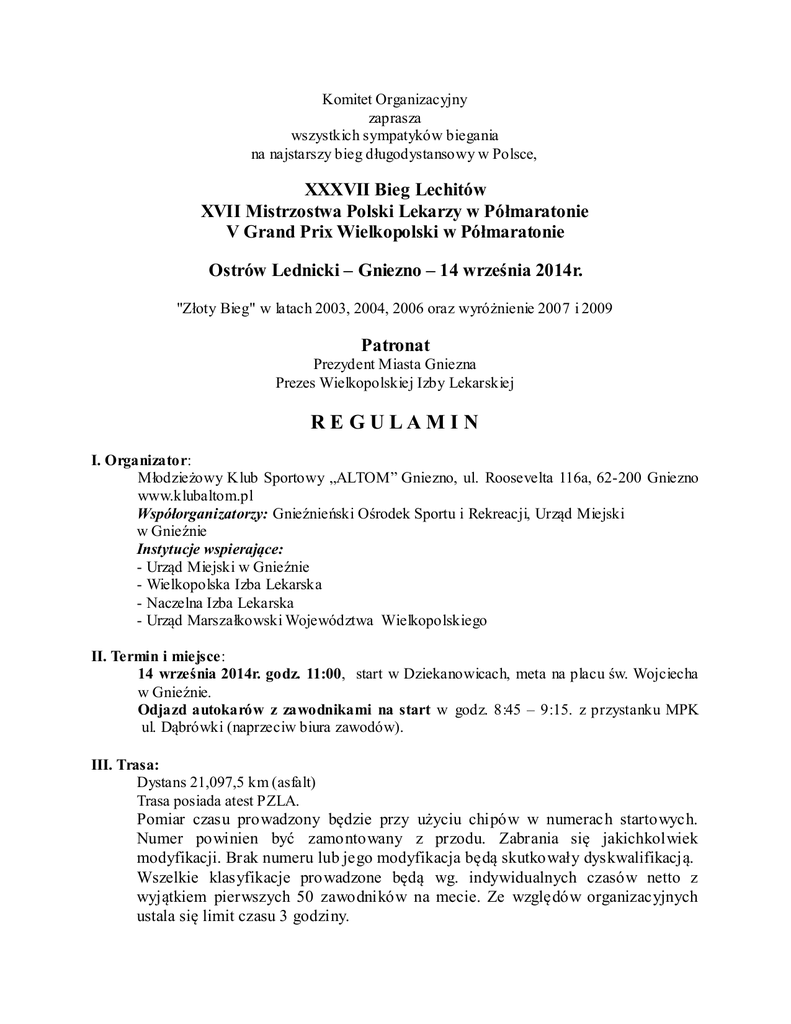 Komitet Organizacyjny zaprasza wszystkich sympatyków biegania na najstarszy bieg długodystansowy w Polsce, XXXVII Bieg Lechitów XVII Mistrzostwa Polski Lekarzy w Półmaratonie V Grand Prix Wielkopolski w Półmaratonie Ostrów Lednicki – Gniezno – 14 września 2014r. "Złoty Bieg" w latach 2003, 2004, 2006 oraz wyróżnienie 2007 i 2009 Patronat Prezydent Miasta Gniezna Prezes Wielkopolskiej Izby Lekarskiej RE GULAMI N I. Organizator: Młodzieżowy Klub Sportowy „ALTOM” Gniezno, ul. Roosevelta 116a, 62-200 Gniezno www.klubaltom.pl Współorganizatorzy: Gnieźnieński Ośrodek Sportu i Rekreacji, Urząd Miejski w Gnieźnie Instytucje wspierające: - Urząd Miejski w Gnieźnie - Wielkopolska Izba Lekarska - Naczelna Izba Lekarska - Urząd Marszałkowski Województwa Wielkopolskiego II. Termin i miejsce: 14 września 2014r. godz. 11:00, start w Dziekanowicach, meta na placu św. Wojciecha w Gnieźnie. Odjazd autokarów z zawodnikami na start w godz. 8:45 – 9:15. z przystanku MPK ul. Dąbrówki (naprzeciw biura zawodów). III. Trasa: Dystans 21,097,5 km (asfalt) Trasa posiada atest PZLA. Pomiar czasu prowadzony będzie przy użyciu chipów w numerach startowych. Numer powinien być zamontowany z przodu. Zabrania się jakichkolwiek modyfikacji. Brak numeru lub jego modyfikacja będą skutkowały dyskwalifikacją. Wszelkie klasyfikacje prowadzone będą wg. indywidualnych czasów netto z wyjątkiem pierwszych 50 zawodników na mecie. Ze względów organizacyjnych ustala się limit czasu 3 godziny. Protesty można składać wyłącznie pisemnie, po wpłaceniu kaucji 100 PLN, do Sędziego Głównego w ciągu 1 godziny od zakończenia biegu. Inne formy nie będą rozpatrywane. W przypadku nie uwzględnienia protestu kaucja nie podlega zwrotowi. IV. Uczestnictwo: Warunkiem uczestnictwa w Biegu jest prawidłowe Formularza Rejestracyjnego oraz dokonanie opłaty startowej. Przekazanie Formularza Rejestracyjnego odbywa się w formie elektronicznej lub bezpośrednio w Biurze Zawodów (szczegóły w punkcie V. Zgłoszenia). Wypełnienie Formularza Rejestracyjnego i dokonanie opłaty rejestracyjnej, o której mowa w punkcie VI/1. jest jednoznaczne z akceptacją niniejszego Regulaminu. Organizator zastrzega sobie prawo do odrzucenia każdego Formularza Rejestracyjnego, co do którego istnieje podejrzenie, że został wypełniony niezgodnie z prawdą, oraz do zdyskwalifikowania każdego Uczestnika, wobec którego istnieje uzasadnione przekonanie, że naruszył warunki niniejszego Regulaminu. Organizator zastrzega sobie prawo do ustanowienia limitu Uczestników Biegu w ilości 1000 Uczestników. W przypadku wyczerpania limitu Organizator zastrzega sobie prawo do wcześniejszego zakończenie rejestracji jak również zwiększenia tego limitu. Uczestnik musi wyrazić akceptację wymogów zawartych w niniejszym Regulaminie, w tym wyrazić zgodę na przetwarzanie danych osobowych zgodnie z ustawą z dnia 29 sierpnia 1997r. o ochronie danych osobowych (tekst jednolity: Dz. U. 2002 r. Nr 101 poz. 926, ze zm.). Organizator zastrzega sobie, a także podmiotom z nim powiązanym, prawo do przeprowadzenia z każdym z uczestników wywiadów, robienia zdjęć i/lub filmowania, używania imion i nazwisk, wizerunku, podobizny lub głosu oraz innych materiałów pochodzących lub związanych z uczestnictwem w Biegu na potrzeby reklamowe, promocyjne, a także możliwość ich wykorzystania w internecie lub w transmisjach radiowo-telewizyjnych oraz na wszelkie inne potrzeby komercyjne z prawem do ich modyfikowania. Chyba, że zostanie zastrzeżona autoryzacja. Organizator zastrzega sobie również, a także swoim reprezentantom i podmiotom powiązanym, prawo do nieodpłatnego wykorzystywania na całym świecie wszelkich zdjęć, materiałów filmowych, wywiadów i nagrań dźwiękowych przedstawiających Uczestników. Tego rodzaju zdjęcia, materiały, wywiady i nagrania mogą być bezpłatnie umieszczane na wybranych nośnikach elektronicznych w katalogach oraz mediach, w tym w telewizji, radiu, gazetach, magazynach, na stronach internetowych i na wystawach, mogą być wykorzystywane na potrzeby reklamowe, promocyjne oraz do wszelkich innych celów komercyjnych związanych z działalnością prowadzoną przez Organizatora i podmiotów z nim powiązanych. Jednocześnie Uczestnik przyjmuje do wiadomości możliwość zmian, modyfikacji i skrótów związanych z użyciem imienia, wizerunku, podobizny, głosu czy też informacji biograficznych Uczestnika. Uczestnik oświadcza, że Organizator, ani podmioty z nim powiązane, nie są i nie będą zobligowane do uiszczenia jakichkolwiek opłat związanych z uprawnieniami opisanymi w niniejszym punkcie. Uczestnik udziela Organizatorowi oraz podmiotom z nim powiązanym, nieograniczonej licencji na używanie wypowiedzi, informacji, pomysłów Uczestnika w dowolnym celu, bez obowiązku powiadamiania i wynagrodzenia majątkowego Uczestnika, a w szczególności w celu reklamy i promocji. Odbiór Pakietu Startowego. Po złożeniu Formularza Rejestracyjnego oraz uiszczeniu płaty Starowej Uczestnik otrzyma Pakiet Startowy przygotowany przez Organizatora. Odbiór Pakietów Startowych odbędzie się w Biurze Zwodów w godzinach jego otwarcia. W celu odbioru Pakietu Startowego i Numeru Startowego należy posiadać ze sobą dokument tożsamości zgodny z danymi podanymi przy rejestracji oraz podpisać formularz rejestracyjny. Organizator nie ponosi wobec Uczestnika jakiejkolwiek odpowiedzialności związanej z nieodebraniem przez Uczestnika Pakietu Startowego lub jakiegokolwiek z jego elementów. Odbiór pakietu startowego może nastąpić przez osoby trzecie na podstawie pisemnego upoważnienia – wzór druku na stronie organizatora. Ube zpieczenie. Organizator nie zapewnia uczestnikom jakiegokolwiek ube zpieczenia związanego z możliwością wystąpienia choroby, wypadku, odniesienia obrażeń, poniesienia śmierci lub poniesienia jakichkolwiek strat bądź szkód, jakie mog