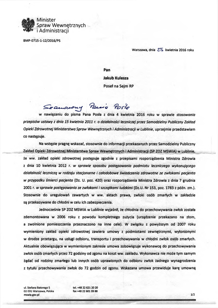 Minister Spraw Wewnętrznych i Administracji BM P-0715-1-12/2016/PS Warszawa, dnia Z S kwietnia 2016 roku Pan Jakub Kulesza Poseł na Sejm RP w nawiązaniu do pisma Pana Posła z dnia 4 kwietnia 2016 roku w sprawie stosowania przepisów ustawy z dnia 15 kwietnia 2011 r. o działalności leczniczej przez Samodzielny Publiczny Zakład Opieki Zdrowotnej Ministerstwa Spraw Wewnętrznych i Administracji w Lublinie, uprzejmie przedstawiam co następuje. Na wstępie pragnę wskazać, stosownie do informacji przekazanych przez Samodzielny Publiczny Zakład Opieki Zdrowotnej Ministerstwa Spraw Wewnętrznych i Administracji (SP ZOZ MSWiA) w Lublinie, że ww. zakład opieki zdrowotnej postępuje zgodnie z przepisami rozporządzenia Ministra Zdrowia z dnia 10 kwietnia 2012 r. w sprawie sposobu postępowania podmiotu leczniczego wykonującego działalność leczniczą w rodzaju stacjonarne i całodobowe świadczenia zdrowotne ze zwłokami pacjenta w przypadku śmierci pacjenta (Dz. U. poz. 420) oraz rozporządzenia Ministra Zdrowia z dnia 7 grudnia 2001 r. w sprawie postępowania ze zwłokami i szczątkami ludzkimi (Dz.U. Nr 153, poz. 1783 z późn. zm.). Stosownie do uregulowań zawartych w ww. aktach prawa, zwłoki osób zmarłych w zakładzie są przekazywane do chłodni w celu ich zabezpieczenia. Jednocześnie SP ZOZ MSWiA w Lublinie wyjaśnił, że chłodnia do przechowywania zwłok została zdemontowana w 2006 roku z powodu kompletnego zużycia (urządzenie przekazano na złom, a zwolnione pomieszczenia przeznaczono na inne cele). W związku z powyższym od 2007 roku wymieniony zakład opieki zdrowotnej zawiera umowy z podmiotami zewnętrznymi, wyłonionymi w drodze przetargu, na usługi odbioru, transportu i przechowywania w chłodni zwłok osób zmarłych. Aktualnie obowiązująca w wymienionym zakresie umowa zobowiązuje wykonawcę do przechowywania zwłok osób zmarłych przez 72 godziny od zgonu na koszt ww. zakładu. Wykonawca nie może tym samym żądać od rodziny zmarłego lub innych osób uprawionych do odbioru zwłok żadnego wynagrodzenia z tytułu przechowywania zwłok do 72 godzin od zgonu. Wskazana umowa przewiduje karę umowną ul. Stefana Batorego 5 02-591 Warszawa, Polska mswia.gov.pl tel. +48 22 62120 20 fax +48 22 601 39 88 1/2 w wysokości 2.000 zł dla wykonawcy, który bezprawnie pobierze opłatę za pobyt zwłok w chłodni przed upływem 72 godzin od zgonu, od osób uprawnionych do pochowania zmarłego, a osoby te zgłoszą pisemną informację w tej sprawie do szpitala. Powyższe stanowi zabezpieczenie swobody wyboru przez rodzinę zmarłego podmiotu świadczącego usługi pogrzebowe. Należy również dodać, że obowiązkiem personelu wymienionego szpitala jest przekazywanie rodzinom osób zmarłych informacji o miejscu przechowywania zwłok w chłodni, braku odpłatności ze strony rodziny za przechowywanie zwłok oraz możliwości swobodnego wyboru innego podmiotu świadczącego usługi pogrzebowe. Obowiązek przechowywania zwłok przez 72 godziny po zgonie, na koszt zakładu wynika z art. 28 ust. 1 pkt 2 lit. b ustawy z dnia 15 kwietnia 2011 r. o działalności leczniczej (t.j.: Dz. U. z 2015 r., poz. 618 z późn. zm.). Ponadto SP ZOZ MSWiA poinformował, że według stanu na dzień 18 kwietnia 2016 roku, do dyrektora wskazanego zakładu opieki zdrowotnej nie wpływały od rodzin osób zmarłych w szpitalu skargi na działania podmiotów, w których przechowywane są zwłoki. Wymieniony dyrektor nie posiada również informacji o pozostawianiu na terenie szpitala folderów reklamowych podmiotów świadczących usługi pogrzebowe. Niemniej, w celu zapobiegnięcia wystąpienia tego rodzaju incydentów ww. dyrektor polecił kierownikom komórek organizacyjnych funkcjonujących w szpitalu zwrócić uwagę podległym pracownikom na zakaz przekazywania rodzinom zmarłych wszelkich informacji dotyczących podmiotów świadczących usługi pogrzebowe oraz na konieczność zgłaszania przełożonym przypadków pozostawiania materiałów reklamowych przez wskazane podmioty na terenie szpitala. Reasumując przedstawione wyjaśnienia uprzejmie informuję, że w opinii Ministerstwa Spraw Wewnętrznych i Administracji SP ZOZ MSWiA w Lublinie nie narusza art. 13 pkt 1 ustawy o działalności leczniczej, zgodnie z którym w miejscu udzielania świadczeń zdrowotnych nie mogą być świadczone usługi pogrzebowe oraz prowadzona ich reklama, ponieważ szpital nie prowadzi oraz nie zezwala na prowadzenie tego rodzaju usług na swoim terenie. Natomiast udzielanie rodzinie zmarłego rzetelnych informacji o miejscu przechowywania zwłok, nie można uznać za reklamę przedsiębiorcy pogrzebowego przechowywującego zwłoki. Niezależnie od powyższego pragnę dodać, że zawarte w wystąpieniu Pana Posła informacje zostaną uwzględnione w trakcie prowadzonych prac analitycznych mających na celu sporządzanie planów kontroli jednostek nadzorowanych przez Ministra Spraw Wewnętrznych i Administracji. BIURO POSELSKIE Posła na Sejm EP Jakuba Kuleszy MINISTER SPRAW WEWNĘTRZNYCH W PŁYNĘŁO ul. Stefana Batorego 5 02-591 Warszawa, Polska mswia.gov.pl tel. +48 22 621 20 20 fax +48 22 60139 88 2/2