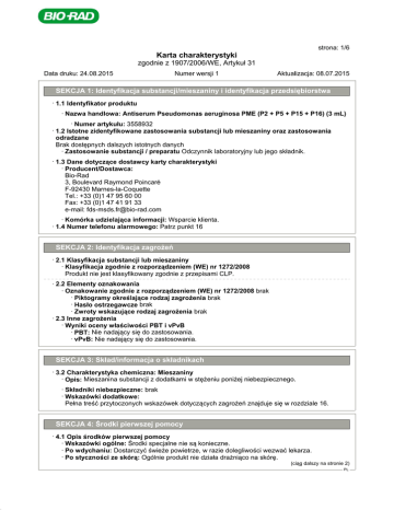 41.0 strona: 1/6 Karta charakterystyki zgodnie z 1907/2006/WE, Artykuł 31 Data druku: 24.08.2015 Numer wersji 1 Aktualizacja: 08.07.2015 SEKCJA 1: Identyfikacja substancji/mieszaniny i identyfikacja przedsiębiorstwa · 1.1 Identyfikator produktu · Nazwa handlowa: Antiserum Pseudomonas aeruginosa PME (P2 + P5 + P15 + P16) (3 mL) · Numer artykułu: 3558932 · 1.2 Istotne zidentyfikowane zastosowania substancji lub mieszaniny oraz zastosowania odradzane Brak dostępnych dalszych istotnych danych · Zastosowanie substancji / preparatu Odczynnik laboratoryjny lub jego składnik. · 1.3 Dane dotyczące dostawcy karty charakterystyki · Producent/Dostawca: Bio-Rad 3, Boulevard Raymond Poincaré F-92430 Marnes-la-Coquette Tel.: +33 (0)1 47 95 60 00 Fax: +33 (0)1 47 41 91 33 e-mail: [email protected] · Komórka udzielająca informacji: Wsparcie klienta. · 1.4 Numer telefonu alarmowego: Patrz punkt 16 SEKCJA 2: Identyfikacja zagrożeń · 2.1 Klasyfikacja substancji lub mieszaniny · Klasyfikacja zgodnie z rozporządzeniem (WE) nr 1272/2008 Produkt nie jest klasyfikowany zgodnie z przepisami CLP. · 2.2 Elementy oznakowania · Oznakowanie zgodnie z rozporządzeniem (WE) nr 1272/2008 brak · Piktogramy określające rodzaj zagrożenia brak · Hasło ostrzegawcze brak · Zwroty wskazujące rodzaj zagrożenia brak · 2.3 Inne zagrożenia · Wyniki oceny właściwości PBT i vPvB · PBT: Nie nadający się do zastosowania. · vPvB: Nie nadający się do zastosowania. SEKCJA 3: Skład/informacja o składnikach · 3.2 Charakterystyka chemiczna: Mieszaniny · Opis: Mieszanina substancji z dodatkami w stężeniu poniżej niebezpiecznego. · Składniki niebezpieczne: brak · Wskazówki dodatkowe: Pełna treść przytoczonych wskazówek dotyczących zagrożeń znajduje się w rozdziale 16. SEKCJA 4: Środki pierwszej pomocy · 4.1 Opis środków pierwszej pomocy · Wskazówki ogólne: Środki specjalne nie są konieczne. · Po wdychaniu: Dostarczyć świeże powietrze, w razie dolegliwości wezwać lekarza. · Po styczności ze skórą: Ogólnie produkt nie działa drażniąco na skórę. (ciąg dalszy na stronie 2) PL 41.0 strona: 2/6 Karta charakterystyki zgodnie z 1907/2006/WE, Artykuł 31 Data druku: 24.08.2015 Numer wersji 1 Aktualizacja: 08.07.2015 Nazwa handlowa: Antiserum Pseudomonas aeruginosa PME (P2 + P5 + P15 + P16) (3 mL) (ciąg dalszy od strony 1) · Po styczności z okiem: Płukać oczy z otwartą powieką przez kilka minut pod bieżącą wodą. · Po przełknięciu: W razie konieczności zasięgnąć porady lekarza. · 4.2 Najważniejsze ostre i opóźnione objawy oraz skutki narażenia Brak dostępnych dalszych istotnych danych · 4.3 Wskazania dotyczące wszelkiej natychmiastowej pomocy lekarskiej i szczególnego postępowania z poszkodowanym Brak dostępnych dalszych istotnych danych SEKCJA 5: Postępowanie w przypadku pożaru · 5.1 Środki gaśnicze · Przydatne środki gaśnicze: CO2, proszek gaśniczy lub strumień rozpylonej wody. Większy pożar zwalczać strumieniem rozpylonej wody. · 5.2 Szczególne zagrożenia związane z substancją lub mieszaniną Brak dostępnych dalszych istotnych danych · 5.3 Informacje dla straży pożarnej · Specjalne wyposażenie ochronne: Środki specjalne nie są konieczne. SEKCJA 6: Postępowanie w przypadku niezamierzonego uwolnienia do środowiska · 6.1 Indywidualne środki ostrożności, wyposażenie ochronne i procedury w sytuacjach awaryjnych Pracować w rękawicach jednorazowych. · 6.2 Środki ostrożności w zakresie ochrony środowiska: Rozcieńczyć dużą ilością wody. Nie dopuścić do przeniknięcia do kanalizacji /wód powierzchniowych /wód gruntowych. · 6.3 Metody i materiały zapobiegające rozprzestrzenianiu się skażenia i służące do usuwania skażenia: Zebrać za pomocą materiału wiążącego ciecze (piasek, ziemia okrzemkowa, materiał wiążący kwasy, materiał wiążący uniwersalny, trociny). · 6.4 Odniesienia do innych sekcji Nie powstają żadne materiały niebezpieczne. SEKCJA 7: Postępowanie z substancjami i mieszaninami oraz ich magazynowanie · 7.1 Środki ostrożności dotyczące bezpiecznego postępowania Zbiorniki zamknąć szczelnie. Unikać kontaktu z odczynnikami, nawet z nie klasyfikowanymi jako niebezpieczne. Przestrzegać zasad Dobrej Praktyki Laboratoryjnej. · Wskazówki dla ochrony przeciwpożarowej i przeciwwybuchowej: Nie są potrzebne szczególne zabiegi. · 7.2 Warunki bezpiecznego magazynowania, łącznie z informacjami dotyczącymi wszelkich wzajemnych niezgodności · Składowanie: · Wymagania w stosunku do pomieszczeń składowych i zbiorników: Brak szczególnych wymagań. · Wskazówki odnośnie wspólnego składowania: Nie konieczne. · Dalsze wskazówki odnośnie warunków składowania: Brak. (ciąg dalszy na stronie 3) PL 41.0 strona: 3/6 Karta charakterystyki zgodnie z 1907/2006/WE, Artykuł 31 Data druku: 24.08.2015 Numer wersji 1 Aktualizacja: 08.07.2015 Nazwa handlowa: Antiserum Pseudomonas aeruginosa PME (P2 + P5 + P15 + P16) (3 mL) (ciąg dalszy od strony 2) · 7.3 Szczególne zastosowanie(-a) końcowe Brak dostępnych dalszych istotnych danych SEKCJA 8: Kontrola narażenia/środki ochrony indywidualnej · Dodatkowe wskazówki dla wykonania urządzeń technicznych: Brak dalszych danych, patrz punkt 7. · 8.1 Parametry dotyczące kontroli · Składniki wraz z kontrolowanymi wartościami granicznymi zależnymi od miejsca pracy: Produkt nie zawiera znaczących ilości materiałów, których wartości graniczne musiałyby być kontrolowane pod kątem warunków miejsca pracy. · Wskazówki dodatkowe: Podstawą były aktualnie obowiązujące wykazy. · Osobiste wyposażenie ochronne: · Ogólne środki ochrony i higieny: Należy przestrzegać zwyczajne środki ostrożności przy obchodzeniu się z chemikaliami. · Ochrona dróg oddechowych: Nie konieczne. · Ochrona rąk: Materiał, z którego wykonane są rękawice musi być nieprzepuszczalny i odporny na działanie produktu