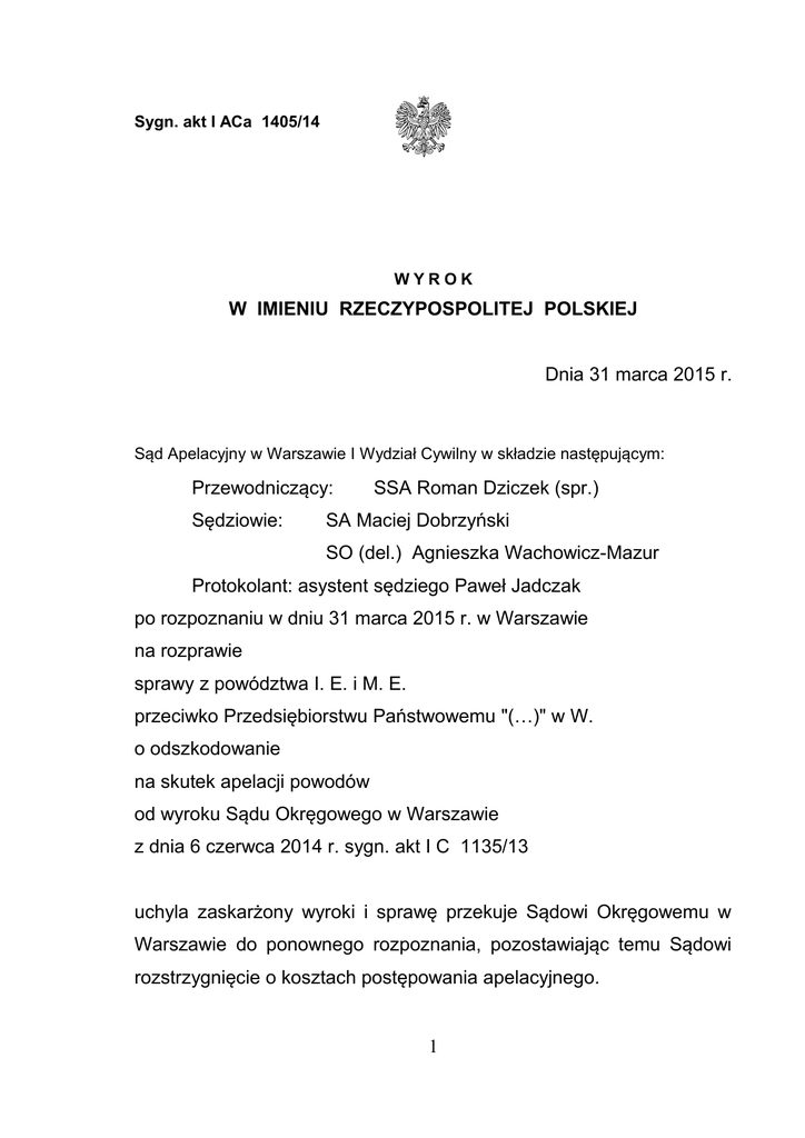 Sygn. akt I ACa 1405/14 WYROK W IMIENIU RZECZYPOSPOLITEJ POLSKIEJ Dnia 31 marca 2015 r. Sąd Apelacyjny w Warszawie I Wydział Cywilny w składzie następującym: Przewodniczący: Sędziowie: SSA Roman Dziczek (spr.) SA Maciej Dobrzyński SO (del.) Agnieszka Wachowicz-Mazur Protokolant: asystent sędziego Paweł Jadczak po rozpoznaniu w dniu 31 marca 2015 r. w Warszawie na rozprawie sprawy z powództwa I. E. i M. E. przeciwko Przedsiębiorstwu Państwowemu "(…)" w W. o odszkodowanie na skutek apelacji powodów od wyroku Sądu Okręgowego w Warszawie z dnia 6 czerwca 2014 r. sygn. akt I C 1135/13 uchyla zaskarżony wyroki i sprawę przekuje Sądowi Okręgowemu w Warszawie do ponownego rozpoznania, pozostawiając temu Sądowi rozstrzygnięcie o kosztach postępowania apelacyjnego. 1 Sygn. akt I ACa 1405/14 UZASADNIENIE W dniu 2 sierpnia 2013 roku powodowie - małżonkowie I. E. i M. E. wnieśli o zasądzenie od pozwanego Przedsiębiorstwa (…) z siedzibą w W. solidarnie na ich rzecz kwoty 61 200 złotych tytułem pokrycia kosztów dostosowania lokalu pod względem wymagań technicznych (w szczególności hałasu i drgań) będącego ich własnością, kwoty 20.000 zł tytułem zmniejszenia wartości nieruchomości i kwoty 500 zł za szkodę związaną z ograniczeniem sposobu korzystania z nieruchomości – ze stosownymi odsetkami i kosztami. W uzasadnieniu powodowie wskazali, że są właścicielami na zasadzie małżeńskiej wspólności majątkowej ustawowej wyodrębnionego lokalu mieszkalnego nr (…) w budynku mieszkalnym wielorodzinnym przy ul. (…) w W. o powierzchni 76,5 m 2, dla którego Sąd Rejonowy dla Warszawy Mokotowa w Warszawie VI Wydział Ksiąg Wieczystych prowadzi księgę wieczystą o nr (…). Ponadto wskazali, że z własnością lokalu jest związany udział w prawie użytkowania wieczystego nieruchomości gruntowej stanowiącej działkę ewidencyjną nr (…) obrębu (…) oraz współwłasności części wspólnych budynku położonym przy ul. (…) w W., wynoszący (…) części dla której to nieruchomości gruntowej Sąd Rejonowy dla Warszawy Mokotowa w Warszawie VI Wydział Ksiąg Wieczystych prowadzi Księgę Wieczystą o nr (…). Nieruchomość lokalowa usytuowana na II w budynku położonym przy ul. (…) w W. znajduje się w granicach utworzonego na mocy Uchwały nr (…) Sejmiku województwa (…) z dnia 20 czerwca 2011 roku Obszarze Ograniczonego Użytkowania dla (…) 2 ((…)), co wynika z załącznika nr (…) do Uchwały OOU. Działka ewidencyjna nr (…) obrębu (…), na której usytuowany jest Budynek znajduje się w strefie uciążliwości OOU. Wysokość swojej szkody powodowie określili przyjmując, że nieruchomość utraciła około 10% na wartości na skutek znajdowania się w strefie uciążliwości OOU w porównaniu do innych lokali mieszkalnych dostępnych na rynku wtórnym w dzielnicy (…) w okolicy znajdującej się poza strefą uciążliwości OOU i poza OOU. Ponadto zdaniem powodów ich budynek powinien zostać dostosowany do standardów akustycznych i przeciw drganiowych takich jakie są przewidziane dla budynków nowopowstających w obszarze ograniczonego użytkowania. Na szkodę powodów składa się szereg uciążliwości i ograniczeń w związku z ustanowieniem OOU. Nieruchomość znajduje się w strefie uciążliwości, w której przekroczone są dobowe dopuszczalne normy hałasu dla zabudowy mieszkaniowej. Pomimo, iż nieruchomość znajduje się w odleglejszej części strefy OOU, to jednak nie powoduje to zmniejszenia rozmiarów uciążliwości w miarę odległości od lotniska, gdyż wyznaczona strefa gdzie dozwolonym jest przekroczenie dobowego dopuszczalnego poziomu hałasu ulega znacznemu zwężeniu tuż nad nieruchomością. Powyższe skutkuje de facto wytyczeniem wąskiego „korytarza” (linii, po której poruszają się samoloty) w miejscu położenia nieruchomości, co sprawia, że ruch lotniczy nad budynkiem jest zintensyfikowany a to z kolei prowadzi do dyskomfortu w czasie codziennego przebywania w lokalu powodów. Działalność pozwanego spowodowała duże natężenie hałasu, drgań oraz spalin silnikowych, zwłaszcza w okresie wzmożonego ruchu lotniczego podczas Euro 2012 gdy do mieszkania dostawał się pył i czarny kurz osadzający się na meblach, podłodze a zwłaszcza na parapetach lokalu. Zdaniem powodów powyższe sprawia, że obniża się standard życia w tej strefie, a w dłuższej perspektywie ma to negatywny wpływ na ich zdrowie. Jako podstawę prawną żądania powodowie 3 wskazali art. 129 ust. 2-4 oraz art. 136 ust. 3 ustawy z dnia 27 kwietnia 2001 roku Prawo ochrony środowiska (Dz. U. z 2008 r. Nr 25, poz. 150 ze zm.). W odpowiedzi na pozew pozwany Przedsiębiorstwo (…) z siedzibą w W. (dalej – (…)) wniósł o oddalenie powództwa w całości jako bezpodstawnego. W uzasadnieniu wskazano, że przypisanie pozwanemu odpowiedzialności na podstawie art. 129 ust. 1 i 2 ustawy z dnia 29 kwietnia 2001 roku Prawo ochrony środowiska (Dz. U. Nr 62, poz. 627 z późn. zm.) wymaga z jednej strony ograniczeń w sposobie korzystania z nieruchomości wynikających z utworzenia OOU na mocy uchwały nr (…) Sejmiku Województwa (…) z dnia 20 czerwca 2011 roku, w sprawie utworzenia obszaru ograniczonego użytkowania dla (…) im. (…) w W. („Uchwała”), z drugiej strony ograniczenia te muszą powodować, że korzystanie z nieruchomości w dotychczasowy sposób lub w sposób zgodny z dotychczasowym przeznaczeniem stało się niemożliwe lub istotnie ograniczone. Ponadto przypisanie odpowiedzialności pozwanemu wymaga również wykazania poniesienia szkody pozostającej w związku z ograniczeniami wynikającymi z objęcia danej nieruchomości OOU oraz istnienia związku przyczynowo –skutkowego pomiędzy szkodą a ograniczeniami wynikającymi z objęcia danej nieruchomości OOU. Lokal powodów znajduje się co prawda w OOU jednakże poza strefą (…) i (…). Zdaniem pozwanego powodo