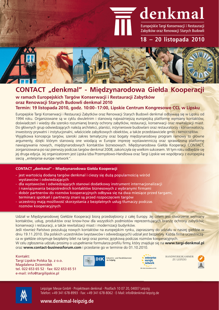 CONTACT „denkmal” - Międzynarodowa Giełda Kooperacji w ramach Europejskich Targów Konserwacji i Restauracji Zabytków oraz Renowacji Starych Budowli denkmal 2010 Termin: 19 listopada 2010, godz. 10:00 - 17:00, Lipskie Centrum Kongresowe CCL w Lipsku Europejskie Targi Konserwacji i Restauracji Zabytków oraz Renowacji Starych Budowli denkmal odbywają się w Lipsku od 1994 roku. Organizowane są w cyklu dwuletnim i stanowią najważniejszą europejską platformę wymiany kontaktów, doświadczeń i wiedzy dla szeroko rozumianej branży ochrony zabytków, restauracji, konserwacji oraz rewitalizacji miast. Do głównych grup odwiedzających należą architekci, planiści, inżynierowie budowlani oraz restauratorzy i konserwatorzy, inwestorzy prywatni i instytucjonalni, właściciele zabytkowych obiektów, a także przedstawiciele gmin i samorządów. Wyjątkowa koncepcja targów, szeroki zakres tematyczny oraz bogaty międzynarodowy program ramowy to główne argumenty, dzięki którym stanowią one wiodącą w Europie imprezę wystawienniczą oraz sprawdzoną platformę nawiązywania nowych, międzynarodowych kontaktów biznesowych. Międzynarodowa Giełda Kooperacji CONTACT, zorganizowana po raz pierwszy podczas targów denkmal 2008, zakończyła się wielkim sukcesem. W tym roku odbędzie się jej druga edycja. Jej organizatorem jest Lipska Izba Przemysłowo-Handlowa oraz Targi Lipskie we współpracy z europejską siecią „enterprise europe network“. CONTACT „denkmal“ – Międzynarodowa Giełda Kooperacji - jest wartością dodaną targów denkmal i cieszy się dużą popularnością wśród wystawców i odwiedzających - dla wystawców i odwiedzających stanowi dodatkowy instrument internacjonalizacji i nawiązywania bezpośrednich kontaktów biznesowych z wybranymi firmami - dobór partnerów do rozmów kooperacyjnych odbywa się na dwa miesiące przed targami, terminarz spotkań i partnerzy znani są przed rozpoczęciem targów - uczestnicy mają możliwość skorzystania z bezpłatnych usług tłumaczy podczas rozmów kooperacyjnych Udział w Międzynarodowej Giełdzie Kooperacji biorą przedsiębiorcy z całej Europy. Jej celem jest stworzenie wymiany kontaktów, usług, produktów oraz know-how dla wszystkich podmiotów reprezentujących branżę ochrony zabytków, konserwacji i restauracji, a także rewitalizacji miast i modernizacji budynków. Jeśli również Państwo poszukują nowych kontaktów na europejskim rynku, zapraszamy do udziału w naszej giełdzie w dniu 19.11.2010. Dla polskich uczestników (wystawców i odwiedzających) udział jest bezpłatny. Każda firma uczestnicząca w giełdzie otrzymuje bezpłatny bilet na targi oraz pomoc językową podczas rozmów kooperacyjnych. W celu zgłoszenia udziału prosimy o uzupełnienie formularza profilu firmy, który znajduje się na www.targi-denkmal.pl oraz www.contact-businessforum.com i przesłanie go w terminie do 01.10.2010. Kontakt: Targi Lipskie Polska Sp. z o.o. Magdalena Dziemidek tel. 022 653 65 52 · fax: 022 653 65 51 e-mail: [email protected] Leipziger Messe GmbH · Projektteam denkmal · Postfach 10 07 20, 04007 Leipzig Telefon: +49 341 678-8993 · Fax: +49 341 678-8062 · E-Mail: [email protected] www.denkmal-leipzig.de