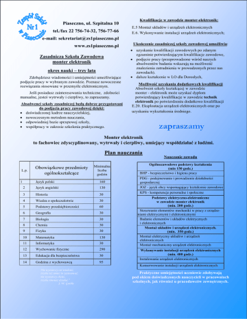 Piaseczno, ul. Szpitalna 10 tel./fax 22 756-74-32, 756-77-66 Kwalifikacje w zawodzie monter-elektronik: E.5 Montaż układów i urządzeń elektronicznych E.6. Wykonywanie instalacji urządzeń elektronicznych; e-mail: [email protected] www.zs1piaseczno.pl Zasadnicza Szkoła Zawodowa monter elektronik okres nauki – trzy lata Zdobędziesz wiadomości i umiejętności umożliwiające podjęcie pracy w wybranym zawodzie. Poznasz nowoczesne rozwiązania stosowane w przemyśle elektronicznym. Jeśli posiadasz zainteresowania techniczne, zdolności manualne, jesteś wytrwały i cierpliwy, to zapraszamy. Absolwenci szkoły zasadniczej będą dobrze przygotowani do podjęcia pracy zawodowej dzięki: • doświadczonej kadrze nauczycielskiej, • nowoczesnym metodom nauczania, • odpowiedniej bazie sprzętowej szkoły, • współpracy w zakresie szkolenia praktycznego. Ukończenie zasadniczej szkoły zawodowej umożliwia: • uzyskanie kwalifikacji zawodowych po zdanym egzaminie potwierdzającym kwalifikacje zawodowe, • podjęcie pracy (przeprowadzone wśród naszych absolwentów badania wskazują na możliwość znalezienia zatrudnienia w prowadzonych przez nas zawodach). • dalsze kształcenie w LO dla Dorosłych, Możliwość uzyskania dodatkowych kwalifikacji Absolwent szkoły kształcącej w zawodzie monter - elektronik może uzyskać dyplom potwierdzający kwalifikacje w zawodzie technik elektronik po potwierdzeniu dodatkowo kwalifikacji E.20. Eksploatacja urządzeń elektronicznych oraz po uzyskaniu wykształcenia średniego. zapraszamy Monter elektronik to fachowiec zdyscyplinowany, wytrwały i cierpliwy, umiejący współdziałać z ludźmi. Plan nauczania Nauczanie zawodu Minimalna liczba godzin L.p. Obowiązkowe przedmioty ogólnokształcące 1 Język polski 160 2 Język angielski 130 3 Historia 30 4 Wiedza o społeczeństwie 30 5 Podstawy przedsiębiorczości 60 6 Geografia 30 7 Biologia 30 8 Chemia 30 9 Fizyka 30 10 Matematyka 130 11 Informatyka 30 12 Wychowanie fizyczne 290 13 Edukacja dla bezpieczeństwa 30 14 Godzina z wychowawcą 95 Ogólnozawodowe podstawy kształcenia (min 150 godz.) BHP - bezpieczeństwo i higiena pracy PDG - podejmowanie i prowadzenie działalności gospodarczej JOZ - język obcy wspomagający kształcenie zawodowe KPS - kompetencje personalne i społeczne Podstawy elektryczno-elektroniczne w zawodzie monter elektronik (min. 200 godz.) Stosowanie elementów mechaniki w pracy z urządzeniami elektrycznymi i elektronicznymi Badanie elementów i układów elektrycznych i elektronicznych Montaż układów i urządzeń elektronicznych. (min. 350 godz.) Montaż elektryczny układów i urządzeń elektronicznych Montaż mechaniczny urządzeń elektronicznych Wykonywanie instalacji urządzeń elektronicznych (min. 400 godz.) Instalowanie urządzeń elektronicznych Konserwowanie instalacji urządzeń elektronicznych. Nie wystarczy coś wiedzieć, trzeba też umieć to zastosować; nie wystarczy chcieć, trzeba również działać.” J. W. Goethe Praktyczne umiejętności uczniowie zdobywają pod okiem doświadczonych nauczycieli w pracowniach szkolnych, jak również u pracodawców zewnętrznych.