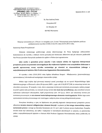 1 OGÓLNOPOLSKIE STOW ARZYSZENI PRZECIWDZIAŁANIA E LE KTR OS KAŻE NIC „PRAWO DO ŻYCIA” Rybnik 2 0 1 5 -ll-2 0 vires koresp.: 44-251 Rybnik, ul. Bracka i 1-'.'-, ta!. 32 42 54 608, kom. 605 654 C / ‘J w w w . p r a w od o t y o i r . ; ; I Sz. Pan Andrzej Duda Prezydent RP Ul. Wiejska 10 00-902 Warszawa Dotyczy naruszenia art. 178 ust 1 w związku z art. 2 oraz 7 Konstytucji przez Sędziów podczas podejmowania wyroku II OSK 2113/10 z dnia 25.01.2012 roku. Szanowny Panie Prezydencie! Złożenie niniejszego publicznego pisma skierowanego do Pana będącego jednocześnie komentarzem do wyroku, o którym mowa powyżej jest konieczne albowiem tak jak słusznie podkreślił Pan Prezes Jarosław Kaczyński zaufanie do sądów w Polsce jest ograniczone. Jako osoba o genialnej pracy umysłu i tym samym zdolna do logicznej interpretacji przepisów praw a na poziomie nieosiągalnym dla większości Sędziów oraz urzędników dokonam w sposób uproszczony oceny wyroku zestawiając go również ze stanowiskiem jednego z najwybitniejszych Sędziów NSA Profesorem Zygmuntem Niewiadomskim. W wyroku z dnia 25.01.2015 roku Sędzia Arkadiusz Despot - Mładanowicz /przewodniczący sprawozdawca/ sformułował następujące stanowisko cytuje; Wobec tego trafnie Sąd pierwszej instancji uznał, powołując się na wyrok Wojewódzkiego Sądu Administracyjnego w Gliwicach z dnia 28 stycznia 2009 r., sygn. akt II SA/Gl 877/08, że omawiany termin ma charakter procesowy. W związku z tym, skoro omawiany termin jest terminem procesowym, należy przyjąć, że jeżeli zajdzie taka potrzeba, na wniosek strony termin ten może być przedłużony, aby umożliwić stronie wykonanie nałożonych obowiązków, bądź przywrócony (art. 58 k.p.a.). Skoro zaś omawiany termin jest terminem procesowym, to nie stanowi materialnoprawnego elementu rozstrzygnięcia. Wobec tego samo wyznaczenie terminu procesowego nie rozstrzyga o nabyciu przez stronę jakiegokolw iek prawa. Powyższe świadczy o tym, że Sędziowie nie potrafią logicznie interpretować przepisów prawa albowiem term in stanowi obligatoryjny elem ent decyzji i wydanie jej bez niego stanowiłoby rażące naruszenie praw a z uwagi na literalne brzmienie art. 51 ust 1 pkt 3 ustawy prawo budowlane. Ponadto termin może być zmieniony, ale tylko i wyłącznie w warunkach określonych w ustawie, co potwierdza jeden z najwybitniejszych Sędziów w historii NSA Profesor Zygmunt Niewiadomski, który podkreśla, że cytuje; 2 W doktrynie podkreśla się zasadnie , źe niewykonanie w terminie obowiązku nałożonego przez właściwy organ, stosownie do art. 51 ust. 1 pkt 3 prawa budowlanego, rodzi obow iązek wydania decyzji nakazującej zaniechanie dalszych robót bądź rozbiórkę obiektu budowlanego lub jeg o części, bądź doprowadzenie obiektu do stanu poprzedniego (zob.: Z. Niewiadomski (red.): Prawo budowlane. Komentarz, Warszawa 2006, s. 543). Podkreślenia wymaga okoliczność, że określenie terminu wykonania obowiązku jest elementem treści decyzji administracyjnej wydawanej w oparciu o art. 51 ust. 1 pkt 3 Prawa budowlanego. Może być w związku z tym przedmiotem odwołania, jak i skargi do sądu administracyjnego, jeżeli np. zbyt krótki termin uniemożliwia wykonanie nałożonego obowiązku (zob.: Z. Niewiadomski (red.): Prawo budowlane. Komentarz, Warszawa 2006, s. 542). Oznacza to, że jakkolw iek określenie terminu wykonania nałożonych obowiązków należy do organu, który w tej mierze ma pewną swobodę decyzyjną, to z pewnością nie jest dopuszczalne przedłużanie tego terminu w drodze innej niż poprzez wydanie decyzji administracyjnej. W świetle powyższego nawet dla laika wiadomo jest, że termin w decyzji stanowi jej materialną część i jest wiążący z uwagi na literalne brzmienie art. 51 ust 5 ustawy prawo budowlane, który stanowi, że w przypadku niewykonania w term inie obowiązku, o którym mowa w ust. 1 pkt 3. właściwy organ wydaje decyzję nakazującą zaniechanie dalszych robót budowlanych bądź rozbiórkę obiektu lub jego części, bądź doprowadzenie obiektu do stanu poprzedniego. Oczywiście istnieje możliwość przywrócenia terminu, o czym świadczy literalne brzmienie art. 58, 59, 60 kpa w ich konkretnej jednostce prawnej, jeżeli inwestor spełni warunki określone w w/w przepisach. Jednakże w wyroku pojawiało się jeszcze całkowicie poza prawne następujące stanowisko cytuje; Stosownie do art. 123 § 1 k.p.a. w toku postępowania organ administracji publicznej wydaje postanowienia. Dotyczą one poszczególnych kwestii wynikających w toku postępowania, lecz nie rozstrzygają o istocie sprawy (§ 2). Przedłużenie terminu do wykonania obowiązków nałożonych na inwestora na podstawie art. 51 ust. 1 pkt 3 ustawy - Prawo budowlane, ja k o kwestia wynikła w toku postępowania naprawczego winno nastąpić w drodze postanowienia. Kwestia przedłużenia terminu nie stanowi rozstrzygnięcia o istocie sprawy. Powyższe stwierdzenie podważa zaufanie do Sędziów albowiem świadczy ono o braku podstawowej wiedzy prawniczej oraz zdolności logicznej interpretacji przepisów prawa przez nich z 2 powodów. Po pierwsze nigdy art. 1 2 3 § 1 kpa nie może stanowić samodzielnej podstawy prawnej postanowienia albowiem mówi on tylko, że organ w trakcie postępowania wydaje postanowienia, lecz jego podstawę prawna stanowi konkretny przepis prawa wynikający z kpa lub innych ustaw. Przyjmując stanowisko NSA organy mogłyby z pominięciem procedury legislacyjnej tworzyć własne prawo, co na razie jest niedopuszczalne ze względu na brzmienie art. 6 kpa oraz 7 Konstytucji RP. Po drugie, co jeszcze bardziej szokuje jest stwierdzenie możliwości przedłużenia terminu określonego w decyzji wydanej na podstawie art. 51 ust 1 pkt 3 ustawy prawo budowlane postanowieniem gdzie każda osoba znająca prawo nawet w podstawowym zakresie wie, że nie istnieje możliwość zmiany treści decyzji I 3 postanowieniem.