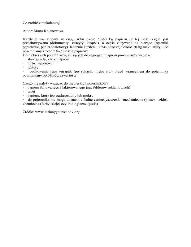 Co zrobić z makulaturą? Autor: Marta Kolanowska KaŜdy z nas zuŜywa w ciągu roku około 50-60 kg papieru. Z tej ilości część jest przechowywana (dokumenty, zeszyty, ksiąŜki), a część zuŜywana na bieŜąco (ręczniki papierowe, papier toaletowy). Rocznie kaŜdemu z nas pozostaje około 20 kg makulatury – co powinniśmy zrobić z taką ilością papieru? Do niebieskich pojemników, słuŜących do segregacji papieru powinniśmy wrzucać: · stare gazety, kartki papieru · torby papierowe · tekturę · opakowania typu tetrapak (po sokach, mleku itp.) przed wrzuceniem do pojemnika powinniśmy opróŜnić z zawartości Czego nie naleŜy wrzucać do niebieskich pojemników? · papieru foliowanego i lakierowanego (np. folderów reklamowych) · tapet · papieru, który jest zatłuszczony lub mokry · do pojemnika nie mogą dostać się Ŝadne zanieczyszczenia: mechaniczne (piasek, szkło), chemiczne (farby, kleje) czy biologiczne (pleśń) Źródło: www.zielonygdansk.ohv.org