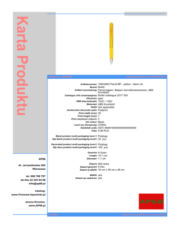 Karta Produktu Artykuł nr: 10643805 Karta utworzona: 08:18 08/03/2017 Artikelnummer: 10643805 Parral BP - yellow - black ink Brand: Bullet Artikel omschrijving: Parral balpen. Balpen met klikmechanisme. ABS Catalogus info (naam/pagina): Kleur(en): PMS kleurindicatie: Materiaal: Refill: Aanbevolen decoratie optie: Print width (mm): Print height (mm): Print maximum colours: Ink colour: Land van Oorsprong: Statistiek code: Prijs: Kunststof. Bullet catalogue 2017 303 geel 122C / 130C ABS Kunststof. Not applicable Padprint 45 7 4 Black CHINA (007) 9608109200000000000000 0.99 PLN Blank product multi packaging level 1: Polybag Qty blank product multi packaging level1: 25 pcs Decorated product multi packaging lever1: Polybag Qty deco product multi packaging level1: 100 pcs Gewicht: 9 Gram Lengte: 14,1 cm Diameter: 1,1 cm AP68 Export: 500 stuks Export gewicht: 5 Kilo Export (LxBxH): 16 cm x 38 cm x 26 cm Al. Jerozolimskie 202 Warszawa MSDS: yes Getest op cadmium: yes tel. 698 788 797 tel./fax 22 303 94 68 [email protected] katalog: www.Firmowe-Upominki.pl strona firmowa: www.AP68.pl (c) 2008 Zobacz inne produkty na www.ap68.pl