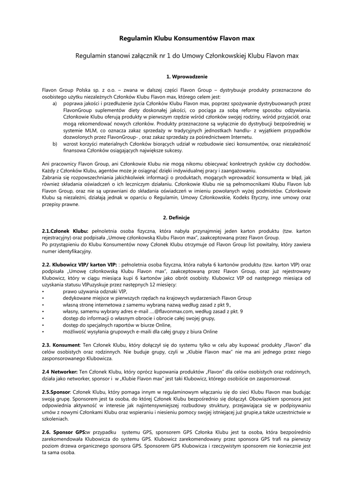 Regulamin Klubu Konsumentów Flavon max Regulamin stanowi załącznik nr 1 do Umowy Członkowskiej Klubu Flavon max 1. Wprowadzenie Flavon Group Polska sp. z o.o. – zwana w dalszej części Flavon Group – dystrybuuje produkty przeznaczone do osobistego użytku niezależnych Członków Klubu Flavon max, którego celem jest: a) poprawa jakości i przedłużenie życia Członków Klubu Flavon max, poprzez spożywanie dystrybuowanych przez FlavonGroup suplementów diety doskonałej jakości, co pociąga za sobą reformę sposobu odżywiania. Członkowie Klubu oferują produkty w pierwszym rzędzie wśród członków swojej rodziny, wśród przyjaciół, oraz mogą rekomendować nowych członków. Produkty przeznaczone są wyłącznie do dystrybucji bezpośredniej w systemie MLM, co oznacza zakaz sprzedaży w tradycyjnych jednostkach handlu- z wyjątkiem przypadków dozwolonych przez FlavonGroup- , oraz zakaz sprzedaży za pośrednictwem Internetu. b) wzrost korzyści materialnych Członków biorących udział w rozbudowie sieci konsumentów, oraz niezależność finansowa Członków osiągających największe sukcesy. Ani pracownicy Flavon Group, ani Członkowie Klubu nie mogą nikomu obiecywać konkretnych zysków czy dochodów. Każdy z Członków Klubu, agentów może je osiągnąć dzięki indywidualnej pracy i zaangażowaniu. Zabrania się rozpowszechniania jakichkolwiek informacji o produktach, mogących wprowadzić konsumenta w błąd, jak również składania oświadczeń o ich leczniczym działaniu. Członkowie Klubu nie są pełnomocnikami Klubu Flavon lub Flavon Group, oraz nie są uprawniani do składania oświadczeń w imieniu powołanych wyżej podmiotów. Członkowie Klubu są niezależni, działają jednak w oparciu o Regulamin, Umowy Członkowskie, Kodeks Etyczny, inne umowy oraz przepisy prawne. 2. Definicje 2.1.Członek Klubu: pełnoletnia osoba fizyczna, która nabyła przynajmniej jeden karton produktu (tzw. karton rejestracyjny) oraz podpisała „Umowę członkowską Klubu Flavon max”, zaakceptowaną przez Flavon Group. Po przystąpieniu do Klubu Konsumentów nowy Członek Klubu otrzymuje od Flavon Group list powitalny, który zawiera numer identyfikacyjny. 2.2. Klubowicz VIP/ karton VIP: : pełnoletnia osoba fizyczna, która nabyła 6 kartonów produktu (tzw. karton VIP) oraz podpisała „Umowę członkowską Klubu Flavon max”, zaakceptowaną przez Flavon Group, oraz już rejestrowany Klubowicz, który w ciągu miesiąca kupi 6 kartonów jako obrót osobisty. Klubowicz VIP od następnego miesiąca od uzyskania statusu VIPuzyskuje przez następnych 12 miesięcy: • prawo używania odznaki VIP, • dedykowane miejsce w pierwszych rzędach na krajowych wydarzeniach Flavon Group • własną stronę internetowa z samemu wybraną nazwą według zasad z pkt 9., • własny, samemu wybrany adres e-mail …[email protected], według zasad z pkt. 9 • dostęp do informacji o własnym obrocie i obrocie całej swojej grupy, • dostęp do specjalnych raportów w biurze Online, • możliwość wysyłania grupowych e-maili dla całej grupy z biura Online 2.3. Konsument: Ten Członek Klubu, który dołączył się do systemu tylko w celu aby kupować produkty „Flavon” dla celów osobistych oraz rodzinnych. Nie buduje grupy, czyli w „Klubie Flavon max” nie ma ani jednego przez niego zasponsorowanego Klubowicza. 2.4 Networker: Ten Członek Klubu, który oprócz kupowania produktów „Flavon” dla celów osobistych oraz rodzinnych, działa jako networker, sponsor i w „Klubie Flavon max” jest taki Klubowicz, którego osobiście on zasponsorował. 2.5.Sponsor: Członek Klubu, który pomaga innym w regulaminowym włączaniu się do sieci Klubu Flavon max budując swoją grupę. Sponsorem jest ta osoba, do której Członek Klubu bezpośrednio się dołączył. Obowiązkiem sponsora jest odpowiednia aktywność w interesie jak najintensywniejszej rozbudowy struktury, przejawiająca się w podpisywaniu umów z nowymi Członkami Klubu oraz wspieraniu i niesieniu pomocy swojej istniejącej już grupie,a także uczestnictwie w szkoleniach. 2.6. Sponsor GPS:w przypadku systemu GPS, sponsorem GPS Członka Klubu jest ta osoba, która bezpośrednio zarekomendowała Klubowicza do systemu GPS. Klubowicz zarekomendowany przez sponsora GPS trafi na pierwszy poziom drzewa organicznego sponsora GPS. Sponsorem GPS Klubowicza i rzeczywistym sponsorem nie koniecznie jest ta sama osoba. 2.7. Linia sponsorowania: powiązanie pomiędzy Członkiem Klubu, jego aktywnym sponsorem oraz sponsorem znajdującym się nad jego sponsorem itd., którzy służą mu pomocą w pracy sieciowej. Wszystkie linie sponsorowania rozpoczynają się od Flavon Group. Linia sponsorowania zostaje zachowana nawet w przypadku, gdy któryś z jej Członków jest nieaktywny, wystąpi z sieci, zostanie zawieszony lub wykluczony. W takim przypadku linia sponsorowania znajdująca się pod nim zostanie przesunięta o poziom wyżej. 2.8.Drzewo organiczne: w systemie GPS linia sponsorowania – którą w tym przypadku nazywamy kręgami koncentrycznymi – i poziomy drzewa organicznego różnią się od siebie. Drzewo organiczne składa się z linii tych Klubowiczów, których dany Członek Klubu osobiście zarekomendował do systemu. Członek Klubu zarekomendowany przez sponsora GPS zajmie miejsce na pierwszym poziomie drzewa organicznego sponsora GPS, a Członek Klubu zarekomendowany przez Członka Klubu zajmie miejsce na drugim poziomie drzewa organicznego sponsora GPS, itd.. Drzewo organiczne wiec jest prawdziwą strukturą dołączenia się. 2.9. Grupa: zbiór wszystkich linii sponsorowania danego Członka Klubu. Na grupę może się składać jedna lub więcej linii sponsorowania. 2.10. Karton aktywności: pierwszy zakupiony w danym miesiącu rozliczeniowym karton produktu o wartości 3 punktów. Jest to jeden z warunków uzyskania prowizji za obrót w danym miesiącu. Zakup kartonu aktywności sam w sobie nie oz