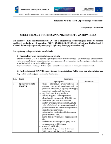 PROJEKT WSPÓŁFINANSOWANY PRZEZ UNIĘ EUROPEJSKĄ Z EUROPEJSKIEGO FUNDUSZU ROZWOJU REGIONALNEGO Załącznik Nr 1 do SIWZ „Specyfikacja techniczna” Nr sprawy: ZP/41/2011 SPECYFIKACJA TECHNICZNA PRZEDMIOTU ZAMÓWIENIA Na dostawę 1 kpl. spektrofotometru UV-VIS z przystawką termostatującą Peltie w ramach realizacji zadania nr 3 projektu POIG 02.01.00–14–111/09–00 „Centrum Radiochemii i Chemii Jądrowej na potrzeby energetyki jądrowej i medycyny nuklearnej”. Szczegółowy opis przedmiotu zamówienia: Szczegółowy opis przedmiotu zamówienia: Spektrofotometr UV-VIS będzie wykorzystywany do ilościowego i jakościowego oznaczania w roztworach substancji organicznych i nieorganicznych wykazujących absorpcję promieniowania w nadfiolecie i w zakresie widzialnym. Przystawka termostatująca Peltie będzie umożliwiała pomiar w różnych temperaturach. I. II. Spektrofotometr UV-VIS z przystawką termostatującą Peltie musi być ukompletowany i spełniać następujące parametry techniczne: L.p. Treść 1 Spektrofotometr UV-VIS Parametry − − − − − − − − − wymagane układ optyczny: dwuwiązkowy z dwoma gniazdami pomiarowymi na próbkę i odnośnik, z optyką zbierającą promieniowanie na 1 detektor, typ detektora: fotopowielacz, zakres długości fali do pomiaru absorbancji: co najmniej 190-900 nm, szerokość spektralna – zmienna: zestaw dyskretnych szczelin 0,2; 0,5; 1,0; 1,5; 2,0; 4,0 nm gwarantujących w pełni odtwarzalną szerokość spektralną szczeliny pomiarowej, maksymalna rozdzielczość danych nie gorsza niż 0,05 nm, zakres fotometryczny: co najmniej do 6 Abs, dokładność fotometryczna przy 1,0 A nie gorsza niż ± 0,004 Abs, szumy<0,0001 Abs, dokładność długości fali: ± 0,15 nm (656,1 nm - linii D2 ); ± 0,3 nm w oferowane 1 PROJEKT WSPÓŁFINANSOWANY PRZEZ UNIĘ EUROPEJSKĄ Z EUROPEJSKIEGO FUNDUSZU ROZWOJU REGIONALNEGO całym zakresie 190-900nm, − powtarzalność długości fali: <0,1 nm, − stabilność: < 0,0005 Abs/h, − światło rozproszone: < 0,0035%T przy 340 nm. 2 Monochromator typu Eberta 3 Ośmiopozycyjny zmieniacz kuwet z termostatem Peltiera + kontroler temperatury − monochromator musi być wyposażony w napęd z silnikiem krokowym gwarantujący, że pomiar próby oraz próby odniesienia jest dokonywany przy idealnie tej samej długości fali nawet przy najwyższych prędkościach przemiatania długości fali, − musi być zapewniona możliwość sterowania monochromatorem z funkcją oświetlania próbki białym światłem. − − − − − 4 Przystawka do kontroli temperatury − 5 System do automatycznego zasysania i pomiaru próbki w kuwecie przepływowej Przystawka do pomiarów małych ilości próbki (od 0,7 µl) współpracująca ze spektrofotometrem Moduł do automatycznej walidacji aparatu kwalifikacji IQ/OQ/PQ − 6 7 − − − − na osiem kuwet o drodze optycznej do 10 mm i wysokości 8,5mm, zakres temperatur: od 0 do 100°C, dokładność temperatury: ±0,1°C, stabilność temperatury: ±0,05 °C bez gwałtownych zmian temperatury, prędkość mieszania próbki: 250 - 2000 obr/min. spektrofotometr ma posiadać przystawkę umożliwiającą bezpośrednią kontrolę temperatury w kuwecie objętość zasysanej próbki od 200 µl do 10 ml, trzy tryby pracy: zassanie-pomiarodprowadzenie próbki do ścieku, zassanie-pomiar-zawrócenie próbki do probówki, ciągłe zasysanie roztworu. długość drogi optycznej 0,2 mm i 1 mm, objętość mierzonej próbki od 0,75 µl do 3 µl. ma umożliwiać bezobsługową walidację spektrofotometru oraz generację raportu zawierającego informacje dotyczące dopuszczenia lub odrzucenia wyników (PASS/FAIL) 2 PROJEKT WSPÓŁFINANSOWANY PRZEZ UNIĘ EUROPEJSKĄ Z EUROPEJSKIEGO FUNDUSZU ROZWOJU REGIONALNEGO 8 Sprzęt komputerowy i oprogramowanie spektrofotometr UV-VIS musi być sterowany przez zewnętrzny komputer o parametrach nie gorszych niż: Procesor Intel i5, 4 GB RAM, HDD 500 GB, grafika 512 MB, napęd CD/DVD-RW z nagrywarką, minimum 4 wejścia USB, karta graficzna 32 bit, posiadający system operacyjny Windows 7 (Professional), pakiet MS Office, monitor LCD przynajmniej 21,5” oraz małe laserowe urządzenie wielofunkcyjne HP umożliwiające drukowanie w kolorze, kopiowanie i skanowanie, − spektrofotometr UV-VIS musi być wyposażony w specjalistyczne, licencjonowane oprogramowanie umożliwiające: • zdejmowanie i obróbkę widm, wyświetlanie wyników w trybie: Abs, %T, logA, 1-4. pochodna, intensywność, %R, wyszukiwanie charakterystycznych punktów widma - maksimów i minimów, przejść przez zero, dowolnych punktów wcześniej ustalonych przez użytkownika, podstawowe operacje arytmetyczne na widmach; obliczanie pochodnych; praca przy stałej długości fali; pomiary ilościowe z krzywymi kalibracji z podaniem równania krzywych, współczynników korelacji itp., • analizę roztworów mieszanin wieloskładnikowych, − oprogramowanie spektrofotometru UVVIS musi mieć wbudowany arkusz kalkulacyjny umożliwiający wprowadzenie własnych równań, obliczeń i operacji matematycznych i statystycznych na uzyskanych wynikach; możliwość stworzenia wydruków w układzie wybranym przez użytkownika, z wprowadzeniem obiektów Windows z innych programów, − spektrofotometr UV-VIS musi posiadać oprogramowanie do analiz − 3 PROJEKT WSPÓŁFINANSOWANY PRZEZ UNIĘ EUROPEJSKĄ Z EUROPEJSKIEGO FUNDUSZU ROZWOJU REGIONALNEGO biochemicznych spełniające następujące funkcje: • pomiary temperatury topnienia DNA, • kinetyka enzymatyczna: 4 algorytmy wyznaczania szybkości reakcji, • wbudowana biblioteka równań, co najmniej: Michaelis-Menten, Lineweaver-Burk, Eadie-Hofstee, Haynes-Woolf, Hill. 9 Dalsze wymagania w stosunku do aparatury 10 Inne − spektrofotometr ma mieć możliwość zainstalowania lampy rtęciowej do kalibracji dł. fali zgodnie z zaleceniami Farmakopei Europejskiej, − spektrofotometr ma mieć dużą komorę pomiarową zapewniającą