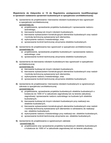 Wyjaśnienia do Załącznika nr 15 do Regulaminu postępowania kwalifikacyjnego w sprawach nadawania uprawnień budowlanych w specjalności architektonicznej: 1) Uprawnienia do projektowania i kierowania robotami budowlanymi bez ograniczeń w specjalności architektonicznej upoważniają do: a) projektowanie, sprawdzanie projektów budowlanych i sprawowanie nadzoru autorskiego, b) kierowanie budową lub innymi robotami budowlanymi, c) kierowanie wytwarzaniem konstrukcyjnych elementów budowlanych oraz nadzór i kontrolę techniczną wytwarzania tych elementów, d) wykonywanie nadzoru inwestorskiego, oraz e) sprawowanie kontroli technicznej utrzymania obiektów budowlanych. 2) Uprawnienia do projektowania bez ograniczeń w specjalności architektonicznej upoważniają do: a) projektowanie, sprawdzanie projektów budowlanych i sprawowanie nadzoru autorskiego, oraz b) sprawowanie kontroli technicznej utrzymania obiektów budowlanych. 3) Uprawnienia do kierowania robotami budowlanymi bez ograniczeń w specjalności architektonicznej upoważniają do: a) kierowanie budową lub innymi robotami budowlanymi, b) kierowanie wytwarzaniem konstrukcyjnych elementów budowlanych oraz nadzór i kontrolę techniczną wytwarzania tych elementów, c) wykonywanie nadzoru inwestorskiego, oraz d) sprawowanie kontroli technicznej utrzymania obiektów budowlanych. 4) Uprawnienia do projektowania i kierowania robotami budowlanymi w ograniczonym zakresie w specjalności architektonicznej upoważniają do: a) projektowanie, sprawdzanie projektów budowlanych obiektów budowlanych o kubaturze do 1000 m³ w zabudowie zagrodowej lub na terenie zabudowy zagrodowej i sprawowanie nadzoru autorskiego na budowie tych obiektów budowlanych, b) kierowanie budową lub innymi robotami budowlanymi przy realizacji ww. obiektów budowlanych, c) kierowanie wytwarzaniem konstrukcyjnych elementów budowlanych oraz nadzór i kontrolę techniczną wytwarzania tych elementów w odniesieniu do realizacji ww. obiektów budowlanych, d) wykonywanie nadzoru inwestorskiego przy realizacji ww. obiektów budowlanych, e) sprawowanie kontroli technicznej utrzymania ww. obiektów budowlanych. 5) Uprawnienia do projektowania w ograniczonym zakresie upoważniają do: a) projektowanie oraz sprawdzanie projektów budowlanych obiektów budowlanych o kubaturze do 1000 m³ w zabudowie zagrodowej lub na terenie zabudowy zagrodowej i sprawowanie nadzoru autorskiego na budowie tych obiektów budowlanych, oraz b) sprawowanie kontroli technicznej utrzymania obiektów budowlanych. 6) Uprawnienia do kierowania robotami budowlanymi w ograniczonym zakresie upoważniają do: a) kierowanie budową lub innymi robotami budowlanymi przy realizacji obiektów budowlanych o kubaturze do 1000 m³ w zabudowie zagrodowej lub na terenie zabudowy zagrodowej, b) kierowanie wytwarzaniem konstrukcyjnych elementów budowlanych oraz nadzór i kontrolę techniczną wytwarzania tych elementów w odniesieniu do realizacji ww. obiektów budowlanych, c) wykonywanie nadzoru inwestorskiego przy realizacji ww. obiektów budowlanych, oraz d) sprawowanie kontroli technicznej utrzymania ww. obiektów budowlanych.