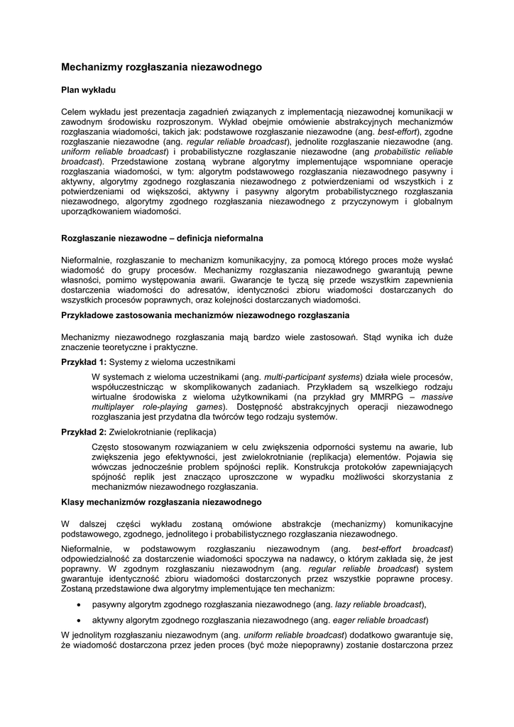Mechanizmy rozgłaszania niezawodnego Plan wykładu Celem wykładu jest prezentacja zagadnień związanych z implementacją niezawodnej komunikacji w zawodnym środowisku rozproszonym. Wykład obejmie omówienie abstrakcyjnych mechanizmów rozgłaszania wiadomości, takich jak: podstawowe rozgłaszanie niezawodne (ang. best-effort), zgodne rozgłaszanie niezawodne (ang. regular reliable broadcast), jednolite rozgłaszanie niezawodne (ang. uniform reliable broadcast) i probabilistyczne rozgłaszanie niezawodne (ang probabilistic reliable broadcast). Przedstawione zostaną wybrane algorytmy implementujące wspomniane operacje rozgłaszania wiadomości, w tym: algorytm podstawowego rozgłaszania niezawodnego pasywny i aktywny, algorytmy zgodnego rozgłaszania niezawodnego z potwierdzeniami od wszystkich i z potwierdzeniami od większości, aktywny i pasywny algorytm probabilistycznego rozgłaszania niezawodnego, algorytmy zgodnego rozgłaszania niezawodnego z przyczynowym i globalnym uporządkowaniem wiadomości. Rozgłaszanie niezawodne – definicja nieformalna Nieformalnie, rozgłaszanie to mechanizm komunikacyjny, za pomocą którego proces może wysłać wiadomość do grupy procesów. Mechanizmy rozgłaszania niezawodnego gwarantują pewne własności, pomimo występowania awarii. Gwarancje te tyczą się przede wszystkim zapewnienia dostarczenia wiadomości do adresatów, identyczności zbioru wiadomości dostarczanych do wszystkich procesów poprawnych, oraz kolejności dostarczanych wiadomości. Przykładowe zastosowania mechanizmów niezawodnego rozgłaszania Mechanizmy niezawodnego rozgłaszania mają bardzo wiele zastosowań. Stąd wynika ich duże znaczenie teoretyczne i praktyczne. Przykład 1: Systemy z wieloma uczestnikami W systemach z wieloma uczestnikami (ang. multi-participant systems) działa wiele procesów, współuczestnicząc w skomplikowanych zadaniach. Przykładem są wszelkiego rodzaju wirtualne środowiska z wieloma użytkownikami (na przykład gry MMRPG – massive multiplayer role-playing games). Dostępność abstrakcyjnych operacji niezawodnego rozgłaszania jest przydatna dla twórców tego rodzaju systemów. Przykład 2: Zwielokrotnianie (replikacja) Często stosowanym rozwiązaniem w celu zwiększenia odporności systemu na awarie, lub zwiększenia jego efektywności, jest zwielokrotnianie (replikacja) elementów. Pojawia się wówczas jednocześnie problem spójności replik. Konstrukcja protokołów zapewniających spójność replik jest znacząco uproszczone w wypadku możliwości skorzystania z mechanizmów niezawodnego rozgłaszania. Klasy mechanizmów rozgłaszania niezawodnego W dalszej części wykładu zostaną omówione abstrakcje (mechanizmy) komunikacyjne podstawowego, zgodnego, jednolitego i probabilistycznego rozgłaszania niezawodnego. Nieformalnie, w podstawowym rozgłaszaniu niezawodnym (ang. best-effort broadcast) odpowiedzialność za dostarczenie wiadomości spoczywa na nadawcy, o którym zakłada się, że jest poprawny. W zgodnym rozgłaszaniu niezawodnym (ang. regular reliable broadcast) system gwarantuje identyczność zbioru wiadomości dostarczonych przez wszystkie poprawne procesy. Zostaną przedstawione dwa algorytmy implementujące ten mechanizm: • pasywny algorytm zgodnego rozgłaszania niezawodnego (ang. lazy reliable broadcast), • aktywny algorytm zgodnego rozgłaszania niezawodnego (ang. eager reliable broadcast) W jednolitym rozgłaszaniu niezawodnym (ang. uniform reliable broadcast) dodatkowo gwarantuje się, że wiadomość dostarczona przez jeden proces (być może niepoprawny) zostanie dostarczona przez wszystkie poprawne procesy. Przedstawione zostaną dwa algorytmy niezawodnego rozgłaszania jednolitego: • algorytm jednolitego rozgłaszania niezawodnego z potwierdzeniami od wszystkich (ang. allack uniform reliable broadcast) • algorytm jednolitego rozgłaszania niezawodnego z potwierdzeniami od większości (ang. majority-ack uniform reliable broadcast) W probabilistycznym rozgłaszaniu niezawodnym (ang. probabilistic reliable broadcast) gwarancje dotyczące dostarczenia wiadomości są zachowane jedynie z pewnym prawdopodobieństwem. W zgodnym rozgłaszaniu niezawodnym z przyczynowym uporządkowaniem wiadomości gwarantowane jest dodatkowo, że wiadomości przyczynowo zależne będą dostarczone do odbioru zgodnie z relacją poprzedzania. W zgodnym rozgłaszaniu niezawodnym z globalnym uporządkowaniem wiadomości zapewniona jest natomiast taka sama kolejność dostarczania wiadomości do wszystkich poprawnych procesów. Warto zaznaczyć, że własności uporządkowania przyczynowego i globalnego są niezależne. Oznacza to, że uporządkowanie przyczynowe nie implikuje i nie jest implikowane przez uporządkowanie globalne. Nie są to oczywiście jedyne możliwe abstrakcyjne operacje rozgłaszania. Wspomnieć warto jeszcze choćby o quasi-niezawodnym rozgłaszaniu. Podstawowe rozgłaszanie niezawodne: Specyfikacja Najprostszym rodzajem rozgłaszania jest podstawowe rozgłaszanie niezawodne (ang. best-effort broadcast). Ten podstawowy mechanizm (abstrakcja) komunikacyjny składa odpowiedzialność za niezawodność na nadawcę. Nie zapewnia przy tym dostarczenia wiadomości do wszystkich procesów, jeżeli nadawca ulegnie awarii. Mechanizm podstawowego rozgłaszania niezawodnego ma z definicji następujące własności: ważności, braku powielania, braku samogeneracji. Własność ważności (ang. best-effort validity) oznacza, że jeżeli procesy Pi oraz Pj są poprawne, to każda wiadomość rozgłaszana przez Pi jest ostatecznie dostarczona do Pj. Ogólnie, jest to własność żywotności. Zauważmy, że mimo tej własności zbiory wiadomości dostarczanych przez różne poprawne procesy mogą się różnić. Własność braku powielania (ang. no duplication) oznacza, że jeżeli wiadomość jest dostarczona, to jest dostarczona co najwyżej raz. Jest to ważna gwarancja: jej sens łatwo wyjaśnić za 
