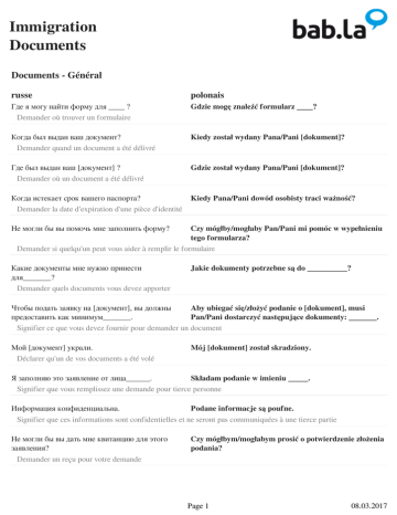 Immigration Documents Documents - Général russe polonais Где я могу найти форму для ____ ? Demander où trouver un formulaire Gdzie mogę znaleźć formularz ____? Когда был выдан ваш документ? Demander quand un document a été délivré Kiedy został wydany Pana/Pani [dokument]? Где был выдан ваш [документ] ? Demander où un document a été délivré Gdzie został wydany Pana/Pani [dokument]? Когда истекает срок вашего паспорта? Demander la date d'expiration d'une pièce d'identité Kiedy Pana/Pani dowód osobisty traci ważność? Не могли бы вы помочь мне заполнить форму? Czy mógłby/mogłaby Pan/Pani mi pomóc w wypełnieniu tego formularza? Demander si quelqu'un peut vous aider à remplir le formulaire Какие документы мне нужно принести для_______? Demander quels documents vous devez apporter Jakie dokumenty potrzebne są do __________? Чтобы подать заявку на [документ], вы должны Aby ubiegać się/złożyć podanie o [dokument], musi предоставить как минимум_______. Pan/Pani dostarczyć następujące dokumenty: _______. Signifier ce que vous devez fournir pour demander un document Мой [документ] украли. Déclarer qu'un de vos documents a été volé Mój [dokument] został skradziony. Я заполняю это заявление от лица______. Składam podanie w imieniu _____. Signifier que vous remplissez une demande pour tierce personne Информация конфиденциальна. Podane informacje są poufne. Signifier que ces informations sont confidentielles et ne seront pas communiquées à une tierce partie Не могли бы вы дать мне квитанцию для этого заявления? Demander un reçu pour votre demande Czy mógłbym/mogłabym prosić o potwierdzenie złożenia podania? Page 1 08.03.2017 Immigration Documents Documents - Données personnelles russe polonais Как вас зовут? Demander le nom d'une personne Jak się Pan/Pani nazywa? Скажите мне, пожалуйста, место и дату вашего Czy mógłby/mogłaby Pan/Pani podać swoją datę i рождения. miejsce urodzenia? Demander le lieu et la date de naissance d'une personne Где вы живете? Demander le lieu de résidence d'une personne Gdzie Pan/Pani mieszka? Каков ваш адрес? Demander l'adresse d'une personne Jaki jest Pana/Pani adres? Какое у вас гражданство? Demander la nationalité d'une personne Jakie posiada Pana/Pani obywatelstwo? Когда вы въехали в страну? Kiedy przyjechał/a Pan/Pani do [nazwa kraju]? Demander la date d'arrivée dans le pays à une personne Не могли бы вы показать ваше удостоверение Czy mógłbym/mogłabym zobaczyć Pana/Pani dowód личности? osobisty? Demander à une personne de présenter un document d'identité Documents - Situation familiale russe polonais Мое семейное положение -_______. Signifier votre situation matrimoniale Mój stan cywilny: _____. холост Situation matrimoniale kawaler/panna Женат/замужем Situation matrimoniale żonaty/zamężna Page 2 08.03.2017 Immigration Documents Разведен/а Situation matrimoniale w separacji Разведен/а Situation matrimoniale rozwodnik/rozwódka в сожительстве Situation matrimoniale w konkubinacie в гражданском браке Situation matrimoniale w rejestrowanym związku partnerskim Не женатая пара Situation matrimoniale w związku partnerskim в домашнем партнерстве w związku partnerskim (ze wspólnym gospodarstwem domowym) Situation matrimoniale вдовец/вдова Situation matrimoniale wdowiec/wdowa У вас есть дети? Demander à une personne si elle a des enfants Czy ma Pan/Pani dzieci? Вы проживаете с кем-то, кто материально Czy mieszka Pan/Pani z osobami na Pana/Pani зависит от вас? utrzymaniu? Demander à une personne si elle a des personnes à charge Я бы хотел(а) объединиться с моей семьей. Chciałbym/Chciałabym skorzystać z prawa do łączenia rodzin. Signifier votre intention de réunir votre famille Documents - S'inscrire à la mairie russe polonais Я бы хотел(а) зарегистрироваться в городе Chciałbym/Chciałabym się zameldować (w nowym miejscu zamieszkania). Signifier que vous souhaitez vous inscrire en tant que nouvel arrivant sur la commune Page 3 08.03.2017 Immigration Documents Какие документы мне нужно принести? Demander quels documents vous devez fournir Jakie dokumenty wymagane są do meldunku? Мне нужно платить за регистрацию? Demander s'il y a des frais d'inscription Czy za meldunek pobierana jest opłata? Я бы хотела зарегистрироваться по месту Chciałbym/Chciałabym zameldować się na pobyt stały. жительства. Signifier que vous souhaitez signaler un changement d'adresse Я бы хотела подать заявку на положительную Chciałbym/Chciałabym prosić o wydanie zaświadczenia характеристику. o niekaralności. Signifier que vous souhaitez demander une attestation de bonne conduite Я бы хотела подать заявку на разрешение на Chciałbym/Chciałabym złożyć podanie o zezwolenie na пребывание. pobyt stały. Signifier que vous souhaitez demander un permis de séjour Documents - Assurance santé russe polonais Я бы хотела задать кое-какие вопросы по поводу Mam kilka pytań dotyczących ubezpieczenia медицинской страховки. zd