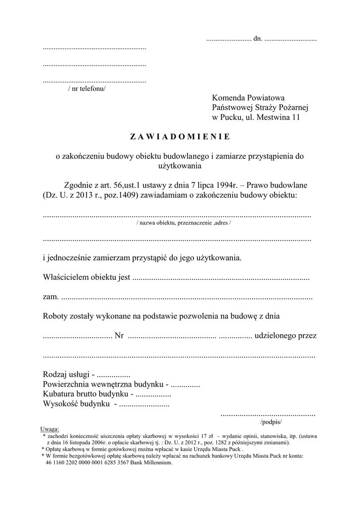 ......................... dn. ............................. ......................................................... ......................................................... ......................................................... / nr telefonu/ Komenda Powiatowa Państwowej Straży Pożarnej w Pucku, ul. Mestwina 11 ZAWIADOMIENIE o zakończeniu budowy obiektu budowlanego i zamiarze przystąpienia do użytkowania Zgodnie z art. 56,ust.1 ustawy z dnia 7 lipca 1994r. – Prawo budowlane (Dz. U. z 2013 r., poz.1409) zawiadamiam o zakończeniu budowy obiektu: ............................................................................................................................... / nazwa obiektu, przeznaczenie ,adres / ............................................................................................................................... i jednocześnie zamierzam przystąpić do jego użytkowania. Właścicielem obiektu jest .................................................................................... zam. ....................................................................................................................... Roboty zostały wykonane na podstawie pozwolenia na budowę z dnia ................................. Nr .......................................... ................ udzielonego przez ................................................................................................................................. Rodzaj usługi - ................ Powierzchnia wewnętrzna budynku - .............. Kubatura brutto budynku - ................. Wysokość budynku - ........................ ............................................. /podpis/ Uwaga: * zachodzi konieczność uiszczenia opłaty skarbowej w wysokości 17 zł – wydanie opinii, stanowiska, itp. (ustawa z dnia 16 listopada 2006r. o opłacie skarbowej tj. : Dz. U. z 2012 r., poz. 1282 z późniejszymi zmianami). * Opłatę skarbową w formie gotówkowej można wpłacać w kasie Urzędu Miasta Puck . * W formie bezgotówkowej opłatę skarbową należy wpłacać na rachunek bankowy Urzędu Miasta Puck nr konta: 46 1160 2202 0000 0001 6285 3567 Bank Millennium.