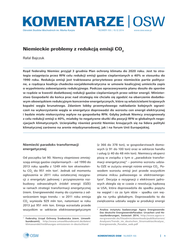 Ośrodek Studiów Wschodnich im. Marka Karpia NUMER 155 | 15.12.2014 www.osw.waw.pl Niemieckie problemy z redukcją emisji CO2 Rafal Bajczuk Rząd federalny Niemiec przyjął 3 grudnia Plan ochrony klimatu do 2020 roku. Jest to strategia osiągnięcia przez RFN celu redukcji emisji gazów cieplarnianych o 40% w stosunku do 1990 roku. Redukcja emisji jest traktowana priorytetowo przez niemieckie partie polityczne, a rządząca koalicja chadecko-socjaldemokratyczna w umowie koalicyjnej umieściła zapis o wypełnieniu zobowiązania redukcyjnego. Podczas opracowywania planu doszło do sporów w rządzie w kwestii dodatkowej redukcji gazów cieplarnianych przez sektor energii. Ministerstwo Gospodarki do końca prac nad strategią nie chciało się zgodzić na obarczenie dodatkowym obowiązkiem redukcyjnym koncernów energetycznych, które są właścicielami krajowych kopalni węgla brunatnego. Zdaniem lobby przemysłowego nakładanie kolejnych ograniczeń na wykorzystanie węgla w energetyce doprowadzi do wzrostu cen energii elektrycznej i będzie miało niekorzystny wpływ na gospodarkę RFN. Gdyby jednak Niemcy zrezygnowały z celu redukcji emisji o 40%, miałoby to negatywne skutki dla pozycji RFN w globalnych negocjacjach klimatycznych. Ucierpiałby również prestiż Niemiec kreujących się na lidera polityki klimatycznej zarówno na arenie międzynarodowej, jak i na forum Unii Europejskiej. Niemiecki paradoks transformacji energetycznej Od początku lat 90. Niemcy stopniowo zmniejszają emisję gazów cieplarnianych – od 1990 do 2013 roku spadła z 1249 mln ton ekwiwalentu CO2 do 951 mln ton1. Jednak od momentu ogłoszenia w 2011 roku ostatecznej rezygnacji z energetyki jądrowej i przyspieszenia rozbudowy odnawialnych źródeł energii (OZE) w ramach strategii transformacji energetycznej (niem. Energiewende) mamy do czynienia z odwróceniem tego trendu – w 2011 roku emisja CO2 wyniosła 929 mln ton, natomiast w roku 2013 już 951 mln ton. Emisja wzrastała przede wszystkim w sektorze elektroenergetycznym Federalny Urząd Ochrony Środowiska (niem. Umweltbundesamt), http://www.umweltbundesamt.de/daten/ klimawandel/treibhausgas-emissionen-in-deutschland 1 (z 366 do 378 ton), w gospodarstwach domowych (z 91 do 100 ton) oraz w sektorze handlu i usług (z 40 do 48 mln ton). Niemieccy eksperci piszą w związku z tym o „paradoksie transformacji energetycznej” – pomimo wzrostu udziału OZE w zużyciu energii rośnie emisja CO2. Powodem wzrostu emisji jest przede wszystkim zmiana miksu paliwowego w elektroenergetyce2. Decyzja o rezygnacji z elektrowni jądrowych zbiegła się w czasie z rewolucją łupkową w USA, która doprowadziła do spadku popytu na węgiel i co za tym idzie – spadku cen węgla na rynku globalnym. Doprowadziło to do zwiększenia udziału węgla w produkcji energii Analiza instytutu badawczego Agora Energiewende: Das deutsche EnergiewendeParadox: Ursachen und Herausforderungen, kwiecień 2014, http://www.agora-energiewende.de/fileadmin/downloads/publikationen/ Analysen/Trends_im_deutschen_Stromsektor/Analyse_ Energiewende_Paradox_web.pdf 2 KOMENTARZE OSW NUMER 155 1 w państwach UE, w tym w Niemczech. Na ten trend nałożył się spadek cen uprawnień do emisji CO2 w unijnym systemie handlu emisjami, co skutkowało wzrostem produkcji energii z węgla brunatnego w Niemczech. W efekcie, pomimo że w latach 2010–2013 zużycie energii elektrycznej w RFN spadło o 15%, a produkcja energii elektrycznej z OZE wzrosła o 47%, to produkcja energii z węgla wzrosła o 23%, przyczyniając się do wzrostu emisji. Niemcy produkują także z węgla coraz więcej energii elektrycznej przeznaczonej na eksport, przede wszystkim do Holandii i Austrii. Federalny Urząd Środowiska podaje również wzrost spalania oleju opałowego i gazu w celach grzewczych jako powód zwiększenia emisji3. Plan ochrony klimatu do 2020 roku Plan ochrony klimatu do 2020 roku4 zawiera listę działań, które mają doprowadzić do redukcji od 62 do 78 mln ton ekwiwalentu CO2 w ciągu najbliższych pięciu lat – redukcja tej ilości emisji pozwoli osiągnąć cel 40% (wielkość emisji w poszczególnych sektorach zob. Aneks). Bez dodatkowych działań ze strony rządu redukcja emisji wyniosłaby od 33% do 35%. Największa redukcja emisji w wielkości od 26,5 do 35 mln ton ekwiwalentu CO2 ma pochodzić ze zwiększenia efektywności energetycznej oraz termomodernizacji budynków. Efektywność energetyczna była dotychczas najwolniej realizowanym elementem strategii transformacji energetycznej. Obecny rząd chce, żeby efektywność stała się obok rozwoju OZE priorytetem transformacji energetycznej. Głównym instrumentem w realizacji takiej polityki jest, przyjęty równolegle z Planem ochrony klimatu, Narodowy plan efektywności energetycznej. Zawarte w nim cele strategiczne zakładają Federalny Urząd Ochrony Środowiska, http://www. umweltbundesamt.de/presse/presseinformationen/treibhausgasausstoss-im-jahr-2013-erneut-um-12 4 http://www.bmub.bund.de/service/publikationen/downloads/details/artikel/aktionsprogramm-klimaschutz -2020/?tx_ttnews[backPid]=3616 3 wdrożenie zarówno instrumentów dla wsparcia termomodernizacji budynków, jak i oszczędzanie energii. Niemiecka strategia zakłada, że efektywność energetyczna stanie się nową gałęzią gospodarki. 22 mln ton redukcji emisji CO2 pochodzić będzie z sektora energii elektrycznej. W tym zakresie Niemcy chcą z jednej strony lobbować na rzecz reformy europejskiego systemu handlu emisjami, z drugiej zaś reformować własny sektor energii elektrycznej poprzez zmniejszenie udziału węgla. Redukcja emisji CO2 w tym sektorze była najbardziej kontrowersyjną kwestią w całej strategii i do ostatniej chwili nie było pewne, w jakim stopniu sektor energii elektrycznej zostanie włączony do Planu ochrony klimatu. Ostatecznie dokument zawiera jedynie zapisy mówiące o tym, że Ministerstwo Gospodarki w 2015 roku przedłoży propozyc