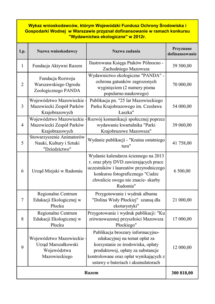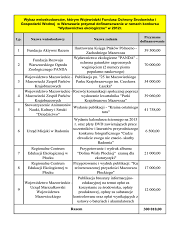 Wykaz wnioskodawców, którym Wojewódzki Fundusz Ochrony Środowiska i Gospodarki Wodnej w Warszawie przyznał dofinansowanie w ramach konkursu "Wydawnictwa ekologiczne" w 2012r. Lp. 1 2 3 4 5 6 7 8 9 Nazwa wnioskodawcy Nazwa zadania Ilustrowana Księga Ptaków Pólnocno Zachodniego Mazowsza Wydawnictwo ekologiczne "PANDA" Fundacja Rozwoju ochrona gatunków zagrozonych Warszawskiego Ogrodu wyginięciem (2 numery pisma Zoologicznego PANDA popularno-naukowego) Województwo Mazowieckie - Publikacja pn. "25 lat Mazowieckiego Mazowiecki Zespół Parków Parku Krajobrazowego im. Czesława Krajobrazowych Łaszka" Województwo Mazowieckie - Rozwój komunikacji społecznej poprzez Mazowiecki Zespół Parków wydawanie kwartalnika "Parki Krajobrazowych Krajobrazowe Mazowsza" Stowarzyszenie Animatorów Wydanie publikacji - "Kraina ostatniego Nauki, Kultury i Sztuki tura" "Dziedzictwo" Wydanie kalendarza ściennego na 2013 r. oraz płyty DVD zawierających prace uczestników i laureatów przyrodniczego Urząd Miejski w Radomiu konkursu fotograficznego "Cudze chwalicie swego nie znacie- skarby Radomia" Fundacja Aktywni Razem Regionalne Centrum Edukacji Ekologicznej w Płocku Regionalne Centrum Edukacji Ekologicznej w Płocku Przygotowanie i wydruk albumu "Dolina Wisły Płockiej" szansą dla ekoturystyki" Przygotowanie i wydruk publikacji: "Ku zrównowazonej przyszłości Mazowsza Płockiego" Publikacja broszury informacyjnoWojewództwo Mazowieckie edukacyjnej na temat opłat za Urząd Marszałkowski korzystanie ze środowiska, opłaty Województwa produktowej, opłaty za substancje Mazowieckiego kontrolowane oraz opłat wynikających z ustawy o bateriach i akumulatorach Razem Przyznane dofinansowanie 39 500,00 70 000,00 54 000,00 39 060,00 41 758,00 6 500,00 21 000,00 17 000,00 12 000,00 300 818,00