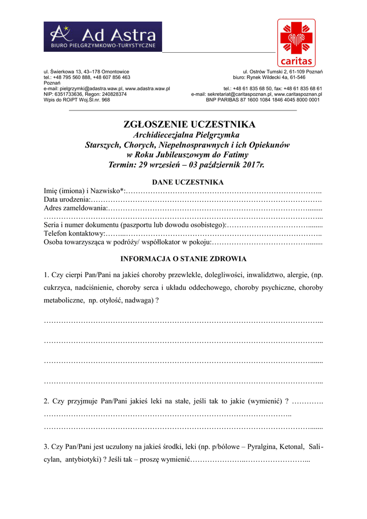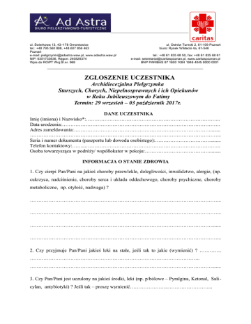 ul. Świerkowa 13, 43–178 Ornontowice tel.: +48 795 560 888, +48 607 856 463 Poznań e-mail: [email protected], www.adastra.waw.pl NIP: 6351733636, Regon: 240828374 Wpis do ROiPT Woj.Śl.nr. 968 ul. Ostrów Tumski 2, 61-109 Poznań biuro: Rynek Wildecki 4a, 61-546 tel.: +48 61 835 68 50, fax: +48 61 835 68 61 e-mail: [email protected], www.caritaspoznan.pl BNP PARIBAS 87 1600 1084 1846 4045 8000 0001 ZGŁOSZENIE UCZESTNIKA Archidiecezjalna Pielgrzymka Starszych, Chorych, Niepełnosprawnych i ich Opiekunów w Roku Jubileuszowym do Fatimy Termin: 29 wrzesień – 03 październik 2017r. DANE UCZESTNIKA Imię (imiona) i Nazwisko*:…………………………………………………………………….. Data urodzenia:…………………………………………………………………………………. Adres zameldowania:………………………………………………………………………........ …………………………………………………………………………………………………... Seria i numer dokumentu (paszportu lub dowodu osobistego):……………………………........ Telefon kontaktowy:……...…………………………………………………………………….. Osoba towarzysząca w podróży/ współlokator w pokoju:…………………………………........ INFORMACJA O STANIE ZDROWIA 1. Czy cierpi Pan/Pani na jakieś choroby przewlekle, dolegliwości, inwalidztwo, alergie, (np. cukrzyca, nadciśnienie, choroby serca i układu oddechowego, choroby psychiczne, choroby metaboliczne, np. otyłość, nadwaga) ? …………………………………………………………………………………………………... …………………………………………………………………………………………………... ………………………………………………………………………………………………....... …………………………………………………………………………………………………... 2. Czy przyjmuje Pan/Pani jakieś leki na stałe, jeśli tak to jakie (wymienić) ? …………. ……………………………………………………………………………………….. ………………………………………………………………………………………………....... 3. Czy Pan/Pani jest uczulony na jakieś środki, leki (np. p/bólowe – Pyralgina, Ketonal, Salicylan, antybiotyki) ? Jeśli tak – proszę wymienić…………………..……………………... ul. Świerkowa 13, 43–178 Ornontowice tel.: +48 795 560 888, +48 607 856 463 Poznań e-mail: [email protected], www.adastra.waw.pl NIP: 6351733636, Regon: 240828374 Wpis do ROiPT Woj.Śl.nr. 968 ul. Ostrów Tumski 2, 61-109 Poznań biuro: Rynek Wildecki 4a, 61-546 tel.: +48 61 835 68 50, fax: +48 61 835 68 61 e-mail: [email protected], www.caritaspoznan.pl BNP PARIBAS 87 1600 1084 1846 4045 8000 0001 …………………………………………………………………………………………………... 4. Czy Pan/Pani porusza się samodzielnie ? …………………………………………………… 5. Czy wymaga pomocy osób trzecich przy poruszaniu się (kule, wózek inwalidzki) ? ……………………….………………………………………………………………………….. * Imiona i nazwisko proszę podać tak, jak jest wpisane w dokumencie zabieranym na pielgrzymkę 6. Czy Pan/Pani wymaga pomocy przy wykonywaniu podstawowych czynności higienicznych (mycie, ubieranie się), wydalanie, spożywanie posiłków lub inne ? …………………………………………………………………………………………………... ....................................................................................................................................................... 7. W przypadku konieczności pomocy ze strony osób trzecich proszę o podanie danych osoby, która będzie towarzyszyć w pielgrzymce:………………………………………………. …………………………………………………………………………………………………... 8. Czy Pan/Pani ma aktualne ubezpieczenie zdrowotne ? ………. W jakiej kasie chorych? …………………………………………………………………………………………………... 9. EKUZ – ubezpieczenie zdrowotne za granicą – …………………………………………….. 10. Czy w przypadku wystąpienia niespodziewanych dolegliwości zagrażających życiu wyraża Pan/Pani zgodę na hospitalizację lub zabieg ?................................................................. OŚWIADCZENIE UCZESTNIKA Ja, niżej podpisany/a (wpisać imię i nazwisko)…………….………………….oświadczam, że: 1. mój stan zdrowia pozwala na wzięcie udziału w pielgrzymce, a wszystkie wyżej podane dane osobowe i informacje dotyczące stanu mojego zdrowia są zgodne z prawdą 2. zapoznałem się z programem pielgrzymki i świadczeniami gwarantowanymi przez Organizatora – co wraz z niniejszym zgłoszeniem stanowi integralną część umowy 3. akceptuję fakt, że przydziału miejsca w samolocie dokonują linie lotnicze, a w pokoju w miejscu zakwaterowania Organizator 4. wyrażam zgodę, by moje dane osobowe: imię, nazwisko, data urodzenia i adres zameldowania zostały udostępnione i były przetwarzane przez SIGNAL IDUNA Polska TU S.A. z siedzibą przy ul. Przyokopowej 31 w Warszawie, zgodnie z ustawą z dnia 29.08.1997r. o ochronie danych osobowych w celu realizacji umowy ubezpieczenia podczas pielgrzymki 6. wyrażam zgodę, by moje dane osobowe oraz wszystkie podane w zgłoszeniu informacje były przetwarzane przez Caritas Archidiecezji Poznańskiej z siedzibą przy ul. Rynek Wildecki 4a w Poznaniu oraz AD ASTRA Kamila Banaś z siedzibą przy ul. Świerkowej 13 w Ornonto- ul. Świerkow