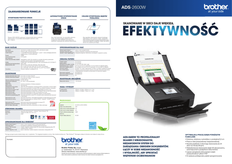 ADS-2600W ZAAWANSOWANE FUNKCJE AUTOMATYCZNE WYRÓWNYWANIE STRON WYKRYWANIE PUSTYCH STRON A B Doc 1 Dokument dwustronny C WŁĄCZONE Doc 2 WYŁĄCZONE Dokument jednostronny A B C Doc 1 Doc 1 Doc 2 A B C Doc 1 Doc 1 Doc 2 CZUJNIK WYKRYWANIA BŁĘDÓW PODAJNIKA SKANOWANIE W SIECI DAJE WIĘKSZĄ Puste strony zostały usunięte Doc 2 Skaner ADS-2600W wykrywa i usuwa puste strony podczas skanowania, co pozwala zaoszczędzić zarówno czas, jak i miejsce. Aby mieć pewność, że wszystkie włożone przez nas strony będą zeskanowane, urządzenie ADS-2600W automatycznie wykrywa i poprawia źle ułożone dokumenty. Aby zapobiec skanowaniu wiecej niż jednego dokumentu w tym samym czasie, urządzenie ADS-2600W posiada funkcję ultradźwiekowego wykrywania błędów podajnika. Dzieki niej żadna strona nie zostanie pominięta. DANE OGÓLNE OPROGRAMOWANIE DLA MAC Typ skanera Automatyczny podajnik dokumentów (ADF), automatyczny duplex Tryby skanowania Kolorowy, szary, monochromatyczny Czujnik obrazu 2 x Dual CMOS CIS (Contact Image Sensor), 1 x przód i 1 x tylne umożliwiające jednokrotne przejście arkusza, a 2 stronne skanowanie Pamięć256MB Czas przechowywania Do 60 godzin kopii zapasowej Czujnik wykrywania błędu podajnika Ultradźwiękowy czujnik, który sprawdza czy wszystkie dokumenty są skanowane prawidłowo, tak aby zapobiec utracie jakichkolwiek danych Intefejs Hi-Speed USB 2.0, sieć bezprzewodowa 802.11b/g/n i sieć przewodowa LAN 10/100 Base-TX Ustawienia sieci bezprzewodowej WPS, AOSS Bezpieczeństwo sieci WEP 64/128 bit, WPA-PSK (TKIP/AES), WPA2-PSK (AES) 802.1x (LEAP, EAP-FAST, PEAP, EAP-TLS, EAP-TTLS), Kerberos 802.1x (EAP-MD5, EAP-FAST, PEAP, EAP-TLS, EAP-TTLS), Kerberos Wyświetlacz Kolorowy, dotykowy o przekątnej 9,3 cm Brother Control Center 2 Łatwe w użyciu oprogramowanie NewSoft® Presto! Biz Card 5 Globalne zarządzanie rozwiązaniami kart biznesowych ® ® NewSoft Presto! PageManager 9 Zarządzanie programem dokumentów wchodzących i programem wymiany SKANOWANIE Szybkość skanowania: kolor i mono Do 24 stron na minutę, format A4 Szybkość skanowania (Duplex) Do 24 stron na minutę, do 48 ipm, format A4 (2-stronnie kolor i mono) Optyczna rozdzielczość skanowania Do 600 x 600 dpi Interpolowana rozdzielczość Do 1,200 x 1,200 dpi skanowania skanowania Głębia koloru 30-bitowa wewnętrzna i 24-bitowa zewnętrzna Skala szarości 256 poziomów Obsługiwane formaty plików JPEG, TIFF, & PDF (standardowe, archiwizacyjne (PDF/A), przeszukiwalne i chronione hasłem) Skanowanie do USB Skanowanie bezpośrednio do pamięci USB, bez potrzeby korzystania z komputera 1 Skanowanie do poczty e-mail Skanowanie dokumentów jako załącznik bezpośrednio do poczty e-mail Skanowanie do OCR1 Skanowanie bezpośrednio do edytora tekst, np. Microsoft® Word, do natychmiastowej edycji Skanowanie do pliku1 Skanowanie bezpośrednio do pliku na komputerze lub do sieci 1 Skanowanie do obrazu Skanowanie bezpośrednio do wybranego programu do edycji obrazów 1 Skanowanie do przeszukiwalnego PDF Skanowanie dokumentów do pliku PDF, co pozwala na łatwe wyszukiwanie słów kluczowych w dokumentach Skanowanie do e-mail Skanowanie dokumentów z ADS-2600W bezpośrednio do ksiązki adresowej przez serwer Skanowanie do chmury Skanowanie dokumentów do: GOOGLE DOCS™, Facebook™, FLICKR®,Dropbox, Picasa™ i EVERNOTE® Skanowanie do FTP Skanowanie dokumentów bezpośrednio do serwera FTP Połączenie do Microsoft®SharePoint Skanowanie to Microsoft® SharePoint1 Skan do folderu sieciowego Skanowanie dokumentów bezpośrednio do folderu sieciowego STEROWNIKI SKANERA Windows® Twain,WIA & ISIS (Windows® 7, Windows® Vista & Windows® XP) Macintosh TWAIN & ICA (Mac OS X 10.6, 10.7) LinuxSANE2 EFEKTYWNOŚĆ OBSŁUGA PAPIERU Podajnik papieru Do 50 arkuszy Wyjście papieru Do 50 arkuszy Standardowe typu papieru i wymiary A4, A5, A6, B5, B6, Letter i Legal Niestardardowe typy i rozmiary Od 51mm do 215.9 mm (szerokość) i 70 mm do 355,6 mm (długość) papieru Skanowanie długiego papieru Tak, pomiędzy 51mm do 215.9 mm (szerokość) i 70 mm do 863 mm (długość) Gramatura papieru Od 52g/m2 do 110g/m2 (wiele arkuszy), od 52g/m2 do 200g/m2 (pojedyncze arkusze) Tryb nośnika papieru Plastikowa, przezroczysta kieszeń używana w przypadku skanowania dokumentów o niestandardowych wymiarach lub dokumentów na zniszczonym papierze Skanowanie wizytówek Tak (pojedynczo) Skanowanie plastikowych kart Tak (pojedynczo) Skanowanie kopertTak MAKSYMALNE OBCIĄŻENIE Maksymalne dzienne 1 500 arkuszy WAGA I WYMIARY Z opakowaniem Bez opakowania 383(szer.) x 291(dłg.) x 285(wys.) mm / 5.7kg 299(szer.) x 220(dłg) x 179(wys.) mm / 3.6kg ŚRODOWISKO Zasilanie AC 220V do 240V, 50/60Hz Pobór mocy (skanowanie)20W Pobór mocy (w stanie gotowości)4W Pobór mocy (w stanie uśpienia) 2W Poziom ciśnienia akustycznego49dB (aktywny) Poziom hałasu (aktywny)62.5dB OPROGRAMOWANIE DLA WINDOWS® Brother Control Center 4 Presto! Biz Card 6 Nuance® PDF Converter Professional 7 Nuance® PaperPort 12 SE Łatwe w użyciu oprogramowanie do skanowania NewSoft® Rozwiązanie do globalnego zarządzania kartami biznesowymi Wydajne, inteligentne oprogramowanie PDF, które pozwala udostępnianie plików PDF współpracownikom i klientom Łączy w sobie łatwe i szybkie narzędzia do skanowania z kreacją plików PDF 1 Wymaga oprogramowania dostarczonego wraz z urządzeniem, 2Do ściągnięcia bezpłanie ze strony: http://solutions.brother.com, 3Tylko Windows®, 4Wymagany dostęp do Internetu oraz dostęp do usług chmury. Kontakt: Brother Polska Sp. z o.o. ul. Cybernetyki 7b, 02-677 Warszawa Strona internetowa: www.brother.pl Wszystkie dane techniczne aktualne w chwili drukowania. Brother jest zastrzeżonym znakiem towarowym Brother Industries Ltd. Nazwy marek produktów są zastrzeżonymi znakami towarowymi lub znakami towarowymi poszczególnych firm. ADS-2600W TO PROFESJONALNY SKANER Z WBUDOWANYM, NIEZAWODNYM SYSTEM DO ZARZĄDZANIA OBIE