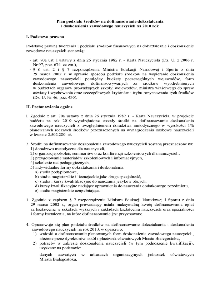 Plan podziału środków na dofinansowanie dokształcania i doskonalenia zawodowego nauczycieli na 2010 rok I. Podstawa prawna Podstawę prawną tworzenia i podziału środków finansowych na dokształcanie i doskonalenie zawodowe nauczycieli stanowią: - art. 70a ust. l ustawy z dnia 26 stycznia 1982 r. - Karta Nauczyciela (Dz. U. z 2006 r. Nr 97, poz. 674 ze zm.), - § 6 ust. 2 i § 7 rozporządzenia Ministra Edukacji Narodowej i Sportu z dnia 29 marca 2002 r. w sprawie sposobu podziału środków na wspieranie doskonalenia zawodowego nauczycieli pomiędzy budŜety poszczególnych wojewodów, form doskonalenia zawodowego dofinansowywanych za środków wyodrębnionych w budŜetach organów prowadzących szkoły, wojewodów, ministra właściwego do spraw oświaty i wychowania oraz szczegółowych kryteriów i trybu przyznawania tych środków (Dz. U. Nr 46, poz. 430). II. Postanowienia ogólne l. Zgodnie z art. 70a ustawy z dnia 26 stycznia 1982 r. - Karta Nauczyciela, w projekcie budŜetu na rok 2010 wyodrębnione zostały środki na dofinansowanie doskonalenia zawodowego nauczycieli z uwzględnieniem doradztwa metodycznego w wysokości 1% planowanych rocznych środków przeznaczonych na wynagrodzenia osobowe nauczycieli w kwocie 2.502.280 zł. 2. Środki na dofinansowanie doskonalenia zawodowego nauczycieli zostaną przeznaczone na: 1) doradztwo metodyczne dla nauczycieli, 2) organizację szkoleń, seminariów oraz konferencji szkoleniowych dla nauczycieli, 3) przygotowanie materiałów szkoleniowych i informacyjnych, 4) szkolenie rad pedagogicznych, 5) indywidualne formy dokształcania i doskonalenia: a) studia podyplomowe, b) studia magisterskie i licencjackie jako druga specjalność, c) studia i kursy kwalifikacyjne do nauczania języków obcych, d) kursy kwalifikacyjne nadające uprawnienia do nauczania dodatkowego przedmiotu, e) studia magisterskie uzupełniające. 3. Zgodnie z zapisem § 7 rozporządzenia Ministra Edukacji Narodowej i Sportu z dnia 29 marca 2002 r., organ prowadzący ustala maksymalną kwotę dofinansowania opłat za kształcenie w szkołach wyŜszych i zakładach kształcenia nauczycieli oraz specjalności i formy kształcenia, na które dofinansowanie jest przyznawane. 4. Opracowuje się plan podziału środków na dofinansowanie dokształcania i doskonalenia zawodowego nauczycieli na rok 2010, w oparciu o: 1) wnioski o dofinansowanie planowanych form doskonalenia zawodowego nauczycieli, złoŜone przez dyrektorów szkół i placówek oświatowych Miasta Białegostoku, 2) potrzeby w zakresie doskonalenia nauczycieli (w tym podnoszenie kwalifikacji), uzyskane na podstawie: - danych zawartych w Miasta Białegostoku, arkuszach organizacyjnych jednostek oświatowych - zapotrzebowań zgłaszanych przez dyrektorów szkół i placówek oświatowych, informacji o oczekiwaniach rynku pracy, 3) potrzebę doskonalenia umiejętności dyrektorów w zakresie zarządzania oraz poprawy jakości zarządzania w placówkach oświatowych Miasta Białegostoku, 4) wyliczoną kwotę stanowiącą 1% planowanych rocznych środków przeznaczonych na wynagrodzenia osobowe nauczycieli, zatrudnionych w szkołach i placówkach oświatowych Miasta Białegostoku. III. Zasady i kryteria przyznawania dofinansowania 1. Środki na dofinansowanie doskonalenia zawodowego nauczycieli w 2010 roku w kwocie 2.502.280 zł, rozdysponuje się na: 1) Zadania realizowane przez szkoły i placówki oświatowe Miasta Białegostoku – 2.222.280 zł: a) doradztwo metodyczne (wynagrodzenia wraz z pochodnymi doradców metodycznych, realizujących zadania w Miejskim Ośrodku Doradztwa Metodycznego w Białymstoku) – 967.486 zł, organizacja konferencji samokształceniowych, seminariów, szkoleń – 209.786 zł, zakup materiałów szkoleniowych i informacyjnych – 208.598 zł, koszty przejazdów – 2.040 zł, szkolenia rad pedagogicznych – 163.369 zł, opłaty za kształcenie w szkołach wyŜszych – 241.287 zł, opłaty za kursy kwalifikacyjne i doskonalące, seminaria – 321.199 zł, warsztaty metodyczne i przedmiotowe – 108.515 zł, b) c) d) e) f) g) h) 2) Zadania realizowane przez szkoły, przedszkola i placówki oświatowe po akceptacji Departamentu Edukacji, Kultury i Sportu – 280.000 zł: a) doskonalenie zawodowe dyrektorów szkół i placówek oświatowych Miasta Białegostoku – 176.000 zł, z przeznaczeniem na: - podnoszenie kwalifikacji dyrektorów jednostek oświatowych w zakresie doskonalenia zarządzania placówką, zgłębianie problematyki prawa oświatowego i finansów publicznych, wyjazdów studyjnych kadry kierowniczej, b) warsztaty metodyczne i przedmiotowe z zakresu komunikacji i przygotowania do zmiany – 104.000 zł. 2. Maksymalna kwota dofinansowania w 2010 roku opłat za kształcenie i doskonalenie nauczycieli szkół i placówek oświatowych Miasta Białegostoku, pobieranych przez szkoły wyŜsze i zakłady kształcenia nauczycieli wynosi 800 zł za jeden semestr. 3. Dofinansowanie do indywidualnych form dokształcania przysługuje nauczycielowi z chwilą rozpoczęcia określonej formy doskonalenia. Wysokość dofinansowania wynosi 500 zł. 4. W 2010 roku dofinansowanie będzie przyznawane: 1) na doskonalenie doradców i konsultantów, 2) na formy kształcenia i doskonalenia nauczycieli w zakresie: a) diagnozy psychologicznej i pedagogicznej dziecka w okresie przedszkolnym i wczesnoszkolnym, b) odkrywania i rozwijania uzdolnień i zainteresowań dzieci, młodzieŜy i osób dorosłych, c) efektywnych metod nauczania, w tym metod uczenia się, d) uzyskiwania i doskonalenia umiejętności w zakresie realizacji godzin do dyspozycji wychowawcy klasy z uwzględnieniem tematyki rozwiązywania problemów klasowych i konfliktów rówieśniczych, e) pozyskiwania i uzupełniania kwalifikacji do nauczania przedmiotów zawodowych, f) dokształcania nauczycieli przedmiotów teoretyczno - praktycznych w zakresie kształcenia modułowego, g) pracy z dziećmi i młodzieŜą niepełnosprawn