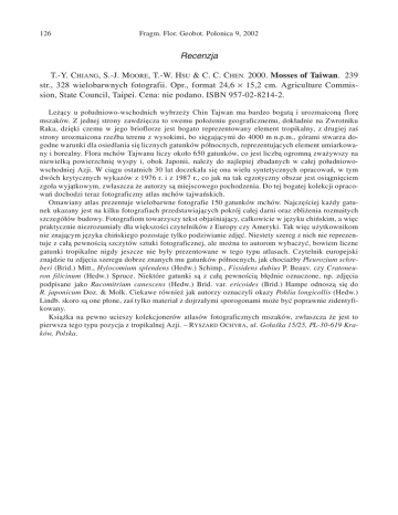 126 Fragm. Flor. Geobot. Polonica 9, 2002 Recenzja T.-Y. CHIANG, S.-J. MOORE, T.-W. HSU & C. C. CHEN. 2000. Mosses of Taiwan. 239 str., 328 wielobarwnych fotografii. Opr., format 24,6 × 15,2 cm. Agriculture Commission, State Council, Taipei. Cena: nie podano. ISBN 957-02-8214-2. Leża˛cy u południowo-wschodnich wybrzeży Chin Tajwan ma bardzo bogata˛ i urozmaicona˛ flore˛ mszaków. Z jednej strony zawdzie˛ cza to swemu położeniu geograficznemu, dokładnie na Zwrotniku Raka, dzie˛ki czemu w jego brioflorze jest bogato reprezentowany element tropikalny, z drugiej zaś strony urozmaicona rzeźba terenu z wysokimi, bo sie˛gaja˛cymi do 4000 m n.p.m., górami stwarza dogodne warunki dla osiedlania sie˛ licznych gatunków północnych, reprezentuja˛cych element umiarkowany i borealny. Flora mchów Tajwanu liczy około 650 gatunków, co jest liczba˛ ogromna˛ zważywszy na niewielka˛ powierzchnie˛ wyspy i, obok Japonii, należy do najlepiej zbadanych w całej południowowschodniej Azji. W cia˛gu ostatnich 30 lat doczekała sie˛ ona wielu syntetycznych opracowań, w tym dwóch krytycznych wykazów z 1976 r. i z 1987 r., co jak na tak egzotyczny obszar jest osia˛gnie˛ciem zgoła wyja˛tkowym, zwłaszcza że autorzy sa˛ miejscowego pochodzenia. Do tej bogatej kolekcji opracowań dochodzi teraz fotograficzny atlas mchów tajwańskich. Omawiany atlas prezentuje wielobarwne fotografie 150 gatunków mchów. Najcze˛ ściej każdy gatunek ukazany jest na kilku fotografiach przedstawiaja˛cych pokrój całej darni oraz zbliżenia rozmaitych szczegółów budowy. Fotografiom towarzyszy tekst objaśniaja˛cy, całkowicie w je˛zyku chińskim, a wie˛c praktycznie niezrozumiały dla wie˛kszości czytelników z Europy czy Ameryki. Tak wie˛c użytkownikom nie znaja˛cym je˛zyka chińskiego pozostaje tylko podziwianie zdje˛ć. Niestety szereg z nich nie reprezentuje z cała˛ pewnościa˛ szczytów sztuki fotograficznej, ale można to autorom wybaczyć, bowiem liczne gatunki tropikalne nigdy jeszcze nie były prezentowane w tego typu atlasach. Czytelnik europejski znajdzie tu zdje˛cia szeregu dobrze znanych mu gatunków północnych, jak chociażby Pleurozium schreberi (Brid.) Mitt., Hylocomium splendens (Hedw.) Schimp., Fissidens dubius P. Beauv. czy Cratoneuron filicinum (Hedw.) Spruce. Niektóre gatunki sa˛ z cała˛ pewnościa˛ błe˛dnie oznaczone, np. zdje˛cia podpisane jako Racomitrium canescens (Hedw.) Brid. var. ericoides (Brid.) Hampe odnosza˛ sie˛ do R. japonicum Doz. & Molk. Ciekawe również jak autorzy oznaczyli okazy Pohlia longicollis (Hedw.) Lindb. skoro sa˛ one płone, zaś tylko materiał z dojrzałymi sporogonami może być poprawnie zidentyfikowany. Ksia˛żka na pewno ucieszy kolekcjonerów atlasów fotograficznych mszaków, zwłaszcza że jest to pierwsza tego typu pozycja z tropikalnej Azji. – RYSZARD OCHYRA, ul. Gołaśka 15/25, PL-30-619 Kraków, Polska.