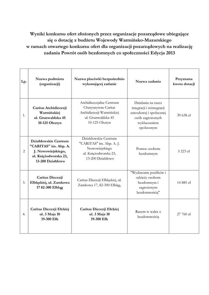 Wyniki konkursu ofert złożonych przez organizacje pozarządowe ubiegające się o dotację z budżetu Wojewody Warmińsko-Mazurskiego w ramach otwartego konkursu ofert dla organizacji pozarządowych na realizację zadania Powrót osób bezdomnych co społeczności Edycja 2013 Lp. Nazwa podmiotu (organizacji) Nazwa placówki bezpośrednio wykonującej zadanie 1. Caritas Archidiecezji Warmińskiej ul. Grunwaldzka 45 10-125 Olsztyn Archidiecezjalne Centrum Charytatywne Caritas Archidiecezji Warmińskiej ul. Grunwaldzka 45 10-125 Olsztyn 2 Działdowskie Centrum "CARITAS" im. Abp. A. J. Nowowiejskiego, ul. Księżodworska 23, 13-200 Działdowo Działdowskie Centrum "CARITAS" im. Abp. A. J. Nowowiejskiego ul. Księżodworska 23, 13-200 Działdowo Nazwa zadania Przyznana kwota dotacji Działania na rzecz integracji i reintegracji zawodowej i społecznej osób zagrożonych wykluczeniem społecznym 39 638 zł Pomoc osobom bezdomnym 5 223 zł 14 885 zł 27 760 zł 3. Caritas Diecezji Elbląskiej, ul. Zamkowa 17 82-300 Elbląg Caritas Diecezji Elbląskiej, ul. Zamkowa 17, 82-300 Elbląg, "Wydawanie posiłków i odzieży osobom bezdomnym i zagrożonym bezdomnością" 4. Caritas Diecezji Ełckiej ul. 3 Maja 10 19-300 Ełk Caritas Diecezji Ełckiej ul. 3 Maja 10 19-300 Ełk Razem w walce z bezdomnością 5. Diecezja Elbląska ul. Mostowa 17 82-300 Elbląg Ośrodek Wsparcia i Interwencji Kryzysowej - Dom dla Matek z Małoletnimi Dziećmi i Kobiet w Ciąży ul. Nowowiejskiego 49 82-300 Elbląg Zapewnienie całodobowego pobytu z wyżywieniem bezdomnym kobietom 8 060 zł Powrót osób bezdomnych do społeczności 16 516 zł Zarząd Rejonowy Polskiego Komitetu Pomocy Społecznej 11200 Bartoszyce, ul. Pieniężnego 10A tel. (89) 762-97-74 [email protected] Całodobowy pobyt z wyżywieniem 24 310 zł "Pomoc bezdomnym" 39 638 zł 6 Polski Komitet Pomocy Społecznej WarmińskoMazurski Zarząd Polski Komitet Pomocy Społecznej Wojewódzki w Stowarzyszenie Charytatywne Olsztynie, Zarząd Rejonowy w Ostródzie ul. ul. Dąbrowszczaków Sienkiewicza 15, 14-100 Ostróda 34/3, 10-541 Olsztyn 7 Polski Komitet Pomocy Społecznej WarmińskoMazurski Zarząd Wojewódzki w Olsztynie, ul. Dąbrowszczaków 34/3, 10-541 Olsztyn 8. Stowarzyszenie Stowarzyszenie "OTWARTE "OTWARTE DRZWI" DRZWI" w Olecku Al Zwycięstwa w Olecku Al Zwycięstwa 3a, 19-400 Olecko 3a 19-400 Olecko 9 Stowarzyszenie na rzecz Świadczenie Stowarzyszenie na rzecz osób osób bezdomnych i bezpośredniej pomocy na bezdomnych i potrzebujących "Od potrzebujących "Od rzecz osób bezdomnych i nowa.." nowa.." zagrożonych ul. Nowogrodzka 49 ul. Nowogrodzka 49 bezdomnością z Miasta 82-300 Elbląg 82-300 Elbląg Elbląg i okolic 39 638 zł 10 Dom Odzyskanych dla Życia MONARMARKOT, Marwałd 56, 14-120 Dąbrówno 11 Stowarzyszenie MONAR ul. Nowolipki 9b 00-151 Warszawa Stowarzyszenie Pomocy Bliźniemu "MAR-KOT" ul. Kopernika 2 12. 05-850 Ożarów Mazowiecki tel. (22) 423-55-30 (22) 722-22-99 Stowarzyszenie Pomocy Bliźniemu "MARKOT"ul. Kopernika 20513 850 Ożarów Mazowieckitel. (22) 42355-30 (22) 722-22-99 Świadczenie pomocy na Dom Odzyskanych dla Życia rzecz osób bezdomnych i MONAR-MARKOT, Marwałd 56, zagrożonych 14-120 Dąbrówno, bezdomnością 39 638 zł Dom dla Osób Bezdomnych i Najuboższych MONARMARKOT ul. Dąbrowskiego 3c 19-300 Ełk, Bezdomność nie hospicjum - tu nie kończy się życie… - edycja 2013 7 928 zł "Dom Rodzinny" Arklity 3 11-410 Barciany tel. (89) 753-22-03 667-304-780 "Świadczenie bezpośredniej pomocy na rzecz osób bezdomnych i zagrożonych bezdomnością, z uwzględnieniem wspierania bieżącej działalności jednostek zapewniających usługi osobom bezdomnym, aktywizacja i usamodzielnianie osób bezdomnych, w tym poradnictwa, terapii, zmniejszenia skali uzależnień". 36 996 zł Dom Samotnej Matki "Kotanek" Sławosze 211-410 Barciany "Świadczenie bezpośredniej pomocy na rzecz osób bezdomnych i zagrożonych bezdomnością, z uwzględnieniem wspierania bieżącej działalności jednostek zapewniających usługi osobom bezdomnym, aktywizacja i usamodzielnianie osób bezdomnych, w tym poradnictwa, terapii, zmniejszenia skali uzależnień". 28 824 zł 14 Bank Żywności w Olsztynie ul. Artyleryjska 17 10-165 Olsztyn 15. Stowarzyszenie Pomocy Socjalnej "Socjal"ul. Rzemieślnicza 114-500 Braniewo 16 Poradnictwo Elbląskie Specjalistyczne dla osób Stowarzyszenie Elbląskie Stowarzyszenie bezdomnych i Organizatorów Pomocy Organizatorów Pomocy Społecznej zagrożonych Społecznej Ul. Świętego Ducha 19 bezdomnością Ul. Świętego Ducha 19 82-300 Elbląg Masz prawo – skorzystaj 82-300 Elbląg z bezpłatnej porady Bank Żywności w Olsztynie, ul. Artyleryjska 17 10-165 Olsztyn, Powrót osób bezdomnych do społeczności 0 zł Stowarzyszenie Pomocy Socjalnej "Socjal"ul. Rzemieślnicza 114-500 Braniewo „Przeciw izolacji społecznej – środowiskowe formy wspierania osób bezdomnych z terenu powiatu braniewskiego” 8 258 zł 12 688 zł