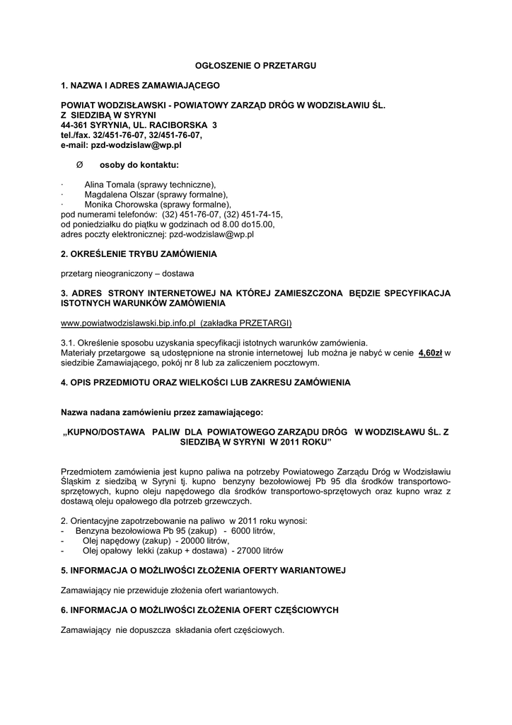 OGŁOSZENIE O PRZETARGU 1. NAZWA I ADRES ZAMAWIAJĄCEGO POWIAT WODZISŁAWSKI - POWIATOWY ZARZĄD DRÓG W WODZISŁAWIU ŚL. Z SIEDZIBĄ W SYRYNI 44-361 SYRYNIA, UL. RACIBORSKA 3 tel./fax. 32/451-76-07, 32/451-76-07, e-mail: [email protected] Ø osoby do kontaktu: · Alina Tomala (sprawy techniczne), · Magdalena Olszar (sprawy formalne), · Monika Chorowska (sprawy formalne), pod numerami telefonów: (32) 451-76-07, (32) 451-74-15, od poniedziałku do piątku w godzinach od 8.00 do15.00, adres poczty elektronicznej: [email protected] 2. OKREŚLENIE TRYBU ZAMÓWIENIA przetarg nieograniczony – dostawa 3. ADRES STRONY INTERNETOWEJ NA KTÓREJ ZAMIESZCZONA BĘDZIE SPECYFIKACJA ISTOTNYCH WARUNKÓW ZAMÓWIENIA www.powiatwodzislawski.bip.info.pl (zakładka PRZETARGI) 3.1. Określenie sposobu uzyskania specyfikacji istotnych warunków zamówienia. Materiały przetargowe są udostępnione na stronie internetowej lub można je nabyć w cenie 4,60zł w siedzibie Zamawiającego, pokój nr 8 lub za zaliczeniem pocztowym. 4. OPIS PRZEDMIOTU ORAZ WIELKOŚCI LUB ZAKRESU ZAMÓWIENIA Nazwa nadana zamówieniu przez zamawiającego: „KUPNO/DOSTAWA PALIW DLA POWIATOWEGO ZARZĄDU DRÓG W WODZISŁAWU ŚL. Z SIEDZIBĄ W SYRYNI W 2011 ROKU” Przedmiotem zamówienia jest kupno paliwa na potrzeby Powiatowego Zarządu Dróg w Wodzisławiu Śląskim z siedzibą w Syryni tj. kupno benzyny bezołowiowej Pb 95 dla środków transportowosprzętowych, kupno oleju napędowego dla środków transportowo-sprzętowych oraz kupno wraz z dostawą oleju opałowego dla potrzeb grzewczych. 2. Orientacyjne zapotrzebowanie na paliwo w 2011 roku wynosi: - Benzyna bezołowiowa Pb 95 (zakup) - 6000 litrów, Olej napędowy (zakup) - 20000 litrów, Olej opałowy lekki (zakup + dostawa) - 27000 litrów 5. INFORMACJA O MOŻLIWOŚCI ZŁOŻENIA OFERTY WARIANTOWEJ Zamawiający nie przewiduje złożenia ofert wariantowych. 6. INFORMACJA O MOŻLIWOŚCI ZŁOŻENIA OFERT CZĘŚCIOWYCH Zamawiający nie dopuszcza składania ofert częściowych. 7. TERMIN WYKONANIA ZAMÓWIENIA od 01.01.2011r. do dnia 31.12.2011r. 8. WARUNKI UDZIAŁU W POSTĘPOWANIU ORAZ OPIS SPOSOBU DOKONYWANIA OCENY SPEŁNIENIA TYCH WARUNKÓW 1. O udzielenie zamówienia mogą ubiegać się wykonawcy, którzy złożą ważną ofertę oraz którzy spełniają warunki, dotyczące: 1) posiadania uprawnień do wykonywania określonej działalności lub czynności, jeżeli przepisy prawa nakładają obowiązek posiadania takich uprawnień, 2) posiadania wiedzy i doświadczenia, 3) dysponowania odpowiednim potencjałem technicznym oraz osobami zdolnymi do wykonania zamówienia, 4) sytuacji ekonomicznej i finansowej 2. Wykażą brak podstaw do wykluczenia z postępowania o udzielenie zamówienia na podstawie art. 24 ust. 1 ustawy PZP. 3. Sprawdzenie w/w warunków udziału w postępowaniu odbywać się będzie na podstawie przedłożonych przez Wykonawcę dokumentów i oświadczeń wg zasady spełnia / nie spełnia. 9. INFORMACJA NA TEMAT WADIUM Zamawiający nie wymaga wniesienia wadium. 10. KRYTERIA OCENY OFERT I ICH ZNACZENIE CENA - 100 % 11. TERMIN ORAZ MIEJSCE SKŁADANIA OFERT Termin złożenia ofert do dnia 2010-12-09 do godz. 9:00, Miejsce: siedziba Zamawiającego, sekretariat; 12. TERMIN ORAZ MIEJSCE OTWARCIA OFERT Otwarcie ofert nastąpi dnia 2010-12-09 o godz. 12.30, Miejsce: siedziba Zamawiającego, świetlica; 13. TERMIN ZWIĄZANIA OFERTĄ Termin związania ofertą wynosi: 30 dni. 14. INFORMACJA O ZAMIARZE ZAWARCIA UMOWY RAMOWEJ Zamawiający nie przewiduje zawarcia umowy ramowej. 15. INFORMACJA O ZAMIARZE USTANOWIENIA DYNAMICZNEGO SYSTEMU ZAKUPÓW Zamawiający nie przewiduje ustanowienia dynamicznego systemu zakupów. 16. INFORMACJA O PRZEWIDYWANYM WYBORZE NAJKORZYSTNIEJSZEJ OFERTY Z ZASTOSOWANIEM AUKCJI ELEKTRONICZNEJ Zamawiający nie przewiduje wyboru najkorzystniejszej oferty z zastosowaniem aukcji elektronicznej. 17. INFORMACJA O PRZEWIDYWANYCH ZAMÓWIENIACH UZUPEŁNIAJĄCYCH Zamawiający przewiduje udzielenie zamówień uzupełniających, o których mowa w art. 67 ust.1 pkt 7 ustawy. 18. OGŁOSZENIE O PRZETARGU W UZP Ogłoszenie o przetargu zostało wysłane do UZP w dniu 29.11.2010r. pod numerem 339871-2010 oraz zamieszczone na stronie internetowej oraz na tablicy ogłoszeń w siedzibie Zamawiającego.