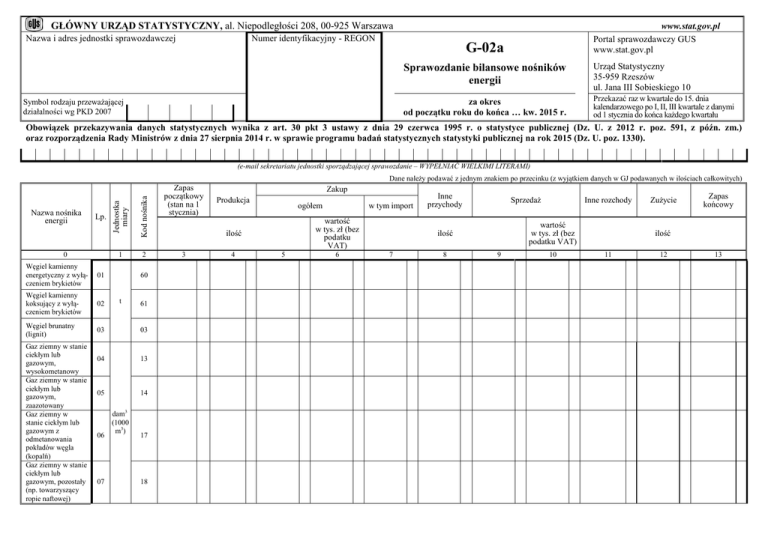 GŁÓWNY URZĄD STATYSTYCZNY, al. Niepodległości 208, 00-925 Warszawa Nazwa i adres jednostki sprawozdawczej Numer identyfikacyjny - REGON www.stat.gov.pl Portal sprawozdawczy GUS www.stat.gov.pl G-02a Symbol rodzaju przeważającej działalności wg PKD 2007 Sprawozdanie bilansowe nośników energii Urząd Statystyczny 35-959 Rzeszów ul. Jana III Sobieskiego 10 za okres od początku roku do końca … kw. 2015 r. Przekazać raz w kwartale do 15. dnia kalendarzowego po I, II, III kwartale z danymi od 1 stycznia do końca każdego kwartału Obowiązek przekazywania danych statystycznych wynika z art. 30 pkt 3 ustawy z dnia 29 czerwca 1995 r. o statystyce publicznej (Dz. U. z 2012 r. poz. 591, z późn. zm.) oraz rozporządzenia Rady Ministrów z dnia 27 sierpnia 2014 r. w sprawie programu badań statystycznych statystyki publicznej na rok 2015 (Dz. U. poz. 1330). (e-mail sekretariatu jednostki sporządzającej sprawozdanie – WYPEŁNIAĆ WIELKIMI LITERAMI) Lp. 0 Kod nośnika Nazwa nośnika energii Jednostka miary Dane należy podawać z jednym znakiem po przecinku (z wyjątkiem danych w GJ podawanych w ilościach całkowitych) 1 2 Węgiel kamienny energetyczny z wyłączeniem brykietów 01 Węgiel kamienny koksujący z wyłączeniem brykietów 02 Węgiel brunatny (lignit) 03 03 04 13 05 14 Gaz ziemny w stanie ciekłym lub gazowym, wysokometanowy Gaz ziemny w stanie ciekłym lub gazowym, zaazotowany Gaz ziemny w stanie ciekłym lub gazowym z odmetanowania pokładów węgla (kopalń) Gaz ziemny w stanie ciekłym lub gazowym, pozostały (np. towarzyszący ropie naftowej) 06 07 60 t dam3 (1000 m3) 61 17 18 Zapas początkowy (stan na 1 stycznia) Zakup Produkcja ogółem wartość w tys. zł (bez podatku VAT) ilość 3 4 w tym import 5 6 Inne przychody Sprzedaż wartość w tys. zł (bez podatku VAT) ilość 7 8 Inne rozchody 9 10 Zużycie Zapas końcowy ilość 11 12 13 Kod nośnika 0 Koks i półkoks z węgla kamiennego i brunatnego (lignitu) Lp. Jednostka miary Nazwa nośnika energii 1 2 08 09 Benzyna lotnicza 10 69 Oleje napędowe do silników (Diesla) 11 64 Olej opałowy lekki 12 96 Energia elektryczna Zakup Produkcja ogółem wartość w tys. zł (bez podatku VAT) ilość 3 w tym import 4 5 6 Inne przychody Sprzedaż wartość w tys. zł (bez podatku VAT) ilość 7 8 Inne rozchody 9 10 Zużycie Zapas końcowy ilość 11 12 13 62 Benzyna silnikowa, bezołowiowa Olej opałowy LSC - o niskiej zawartości siarki (<1 %) (ciężki olej opałowy) Olej opałowy HSC - o wysokiej zawartości siarki (≥1 %) (ciężki olej opałowy) Gaz skroplony (LPG) -propan i butan skroplone Zapas początkowy (stan na 1 stycznia) t 88 13 98 t 14 99 15 12 16 MWh 24 X X 3 Gaz koksowniczy 17 dam (1000 m3) 16 X X Ciepło w parze i gorącej wodzie 18 GJ 23 X X Proszę podać szacunkowy czas (w minutach) przeznaczony na przygotowanie danych dla potrzeb wypełnienia formularza 1 Proszę podać szacunkowy czas (w minutach) przeznaczony na wypełnienie formularza 2 (e-mail osoby sporządzającej sprawozdanie – WYPEŁNIAĆ WIELKIMI LITERAMI) (imię, nazwisko i telefon osoby sporządzającej sprawozdanie) (miejscowość, data) (pieczątka imienna i podpis osoby działającej w imieniu sprawozdawcy) Objaśnienia do formularza G-02a Pojęcia i zasady sporządzania sprawozdań z gospodarki paliwowo-energetycznej zostały omówione w zeszycie metodycznym pt. „Zasady metodyczne sprawozdawczości statystycznej z zakresu gospodarki paliwami i energią oraz definicje stosowanych pojęć” wydanym przez GUS w 2006 r. dostępnym również na stronie internetowej GUS pod adresem: http://www.stat.gov.pl/dane_spol-gosp/prod_bud_inw/ zasady_metodyczne/zasady2006.pdf. Przy wypełnianiu poszczególnych pozycji sprawozdania G-02a powinna być spełniona dla danych ilościowych następująca zasada: zapas początkowy (+)produkcja (+)zakup (+)inne przychody (–)sprzedaż (–)inne rozchody (–)zużycie (=)zapas końcowy, o ile nie stanowią inaczej wyjaśnienia uzupełniające. Nie należy wykazywać zakupu/sprzedaży w przypadku refaktur. W rubryce 0 są wymienione nazwy nośników energii. Symbole PKWiU/PRODPOL przyporządkowane dla poszczególnych wierszy podano poniżej: PKWiU 2008 Nazwa nośnika energii 1 ex. 05.10.10 ex. 05.10.10 05.20.10 Lp. 2 Węgiel kamienny energetyczny z wyłączeniem brykietów Węgiel kamienny koksujący z wyłączeniem brykietów Węgiel brunatny (lignit) 01 02 03 ex. 06.20.10 Gaz ziemny w stanie ciekłym lub gazowym, wysokometanowy 04 ex. 06.20.10 Gaz ziemny w stanie ciekłym lub gazowym, zaazotowany 05 ex. 06.20.10 ex. 06.20.10 Gaz ziemny w stanie ciekłym lub gazowym z odmetanowania pokładów węgla (kopalń) Gaz ziemny w stanie ciekłym lub gazowym, pozostały (np. towarzyszący ropie naftowej) 06 07 ex. 19.10.10 Koks i półkoks z węgla kamiennego i brunatnego (lignitu) lub torfu 08 ex. 19.20.21 Benzyna silnikowa, bezołowiowa 09 ex. 19.20.21 Benzyna lotnicza 10 ex. 19.20.26 Oleje napędowe do silników (Diesla) 11 ex. 19.20.28 Olej opałowy lekki 12 ex. 19.20.28 Olej opałowy LSC – o niskiej zawartości siarki (<1 %) (ciężki olej opałowy) 13 ex. 19.20.28 Olej opałowy HSC – o wysokiej zawartości siarki (≥1 %) (ciężki olej opałowy) 14 35.11.10 ex. 35.21.10 Gaz skroplony (LPG) - propan i butan skroplone Energia elektryczna Gaz koksowniczy 35.30.11 Ciepło w parze i gorącej wodzie ex. 19.20.31 15 16 17 18 Dane należy podawać z jednym miejscem po przecinku, z wyjątkiem GJ, które należy podać w wartościach całkowitych. W rubryce 1 są wyszczególnione jednostki miary, w jakich należy wykazywać poszczególne nośniki, np. paliwa stałe i ciekłe wykazuje się w tonach, gazowe w dam3 (tys. m3), paliwa odpadowe, ciepło w GJ (gigadżulach), a energię elektryczną w MWh (megawatogodzinach). Jeżeli w dokumentacji występują inne jednostki, należy je przeliczyć, przyjmując: 1 tona=1337 litrów benzyna silnikowa, bezołowiowa (kod 88) 1 tona=1380 litrów benzyna lotnicza (kod