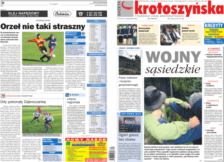 32 S Gazeta Krotoszyńska 44 (75) 31 października 2008 www.krotoszynska.pl PORT ogłoszenie Nr 44 (75) 31 października 2008 WYGRANA ASTRY W przedostatnim meczu rundy jesiennej, na własnym terenie, Astra pokonała Orła Mroczeń. W poprzedniej kolejce Orły pokonały u siebie pleszewską Stal (zrównując się z krotoszynianami punktami, ale mając gorszy stosunek bramek) i jak dotąd była to jedyna porażka tej drużyny. Ich trenerem jest Marek Wojtasiak, który ma na swoim koncie m.in. pracę w Astrze. Aby lepiej rozszyfrować jej obecny styl i sposób gry, a przez to odpowiednio taktycznie przygotować swoją drużynę do tego spotkania, był on obecny tydzień temu na meczu w Ostrowie Wlkp. Jak się jednak okazało te obserwacje nie dały zamierzonego efektu. Od początku przewagę zyskali krotoszynianie. Potwierdziło się to po kwadransie, kiedy po podaniu Marcina Ciesielskiego główką prowadzenie uzyskał Adam Staszewski. 180 sekund później mógł on na swoim koncie zapisać asystę, ale podanie do znajdującego się na dobrej pozycji Adama Szycha przejęli obrońcy. W 22 min. najpierw Michał Małecki skutecznie interweniował poza polem ASTRA Krotoszyn ORZEŁ Mroczeń (2:0) GOLE 1:0 Adam Staszewski ’14 2:0 Adam Szych ‘24 SK£ADY Astra: Półtoraczyk, Witek, M. Kujawski, Smyczyński, Idkowiak, M. Ciesielski, Nowak, Staszewski, Szych, R. Ciesielski, Leis (74 D. Kujawski) Orzeł: Małecki, Owczarek, M. Moś, B. Moś, Pilarski, Luźniak, Skiba, Trzęsicki (74 Piędzioch), Jurasik, Płóciennik (67 Janicki), Szóstak (46 Albert) O PIŁKĘ WALCZY strzelec pierwszego gola Adam Staszewski. karnym, ale po chwili popełnił błąd, w konsekwencji na przedpolu doszło do małego zamieszania, oddano kilka strzałów, ale wszystkie były blokowane. Dwie minuty potem ładną solową akcję przeprowadził Adam Szych, minął kilku rywali i strzelił nie do obrony. Następnie niecelnie główkowali Sebastian Skiba i Staszewski. Tuż przed przerwą Szych z rzutu wolnego z 25 metrów wycelował w samo okienko bramki, ale znów efektownie obronił Małecki. Bohaterem drugiej części spotkania, w której goście zagrali znacznie lepiej, był Półtoraczyk. Najpierw obronił trzy strzały oddane z bliska, a potem jeszcze jeden, oddany po rzucie rożnym. W 52 min. wydawało się, że musi być podwyższenie prowadzenia, ale po podaniu Staszewskiego sytuacji sam na sam z Michałem Małeckim nie wykorzystał Maciej Leis nie czysto trafiając w piłkę i posyłając ją daleko od słupka. Po chwili nasz bramkarz nie dał się zaskoczyć najpierw Przemysławowi Albertowi, a następnie Mateuszowi Płóciennikowi. W 64 min. po raz kolejny Małecki złapał piłkę po rzucie wolnym Szycha z 30 metrów. Kwadrans potem w sytuacji sam na sam był Robert Ciesielski, ale w decydującej fazie lepszym okazał się Małecki. 120 sekund później krotoszyński golkiper nie dał się zaskoczyć Albertowi. Tuż przed końcem mieliśmy powtórkę z pierwszej połowy czyli paradę bramkarską i w efekcie rzut rożny, po rzucie wolnym Szycha. Wynik nie uległ już jednak zmianie. Astra zmierzy się na wyjeździe z KKS 1925 Kalisz w najbliższą niedzielę. Początek meczu o godz. (wb) 11.00. B-KLASA KOŹMINIANIE BYLI FAWORYTAMI Liderzy wygrywają Orły pokonały Dąbroczankę Kolejny komplet punktów zdobył Biały Orzeł. Tym razem na własnym terenie pokonał Dąbroczankę. Faworytem meczu byli koźminianie i od początku osiągnęli oni przewagę. W 25 minucie po rzucie wolnym celnie główkował Wojciech Falentin. Tuż po wznowieniu gry na środku boiska popularny Fala wywalczył piłkę podał do Błażeja Ciesielskiego, który wpadając w pole karne został sfaulowany. Pewnym egzekutorem „jedenastki” był Maciej Kubka. W końcówce pierwszej połowy dwie okazje mieli goście, ale dwukrotnie niecelnie uderzał Marcin Kaczmarek. Druga część zaczęła się od dwóch akcji pępowian: po uderzeniu Jankowskiego piąstkował Grzelak, a następnie niewiele pomylił się Kaczmarek. Miejscowi przeprowadzili szybką kontrę, tyle tylko, że Ciesielski przelobował i wysuniętego Roszaka i jego bramkę. Po chwili golkiper gości nie dał się zaskoczyć Jakubowi Namysłowskiemu. Po kwadransie znów dwie szanse mieli przyjezdni, ale strzały Kaczmarka i Jankowskiego były minimal- 2:0 DZIĘKI DOBREJ GRZE KOŹMIŃSKICH NAPASTNIKÓW: Wojciecha Falentina (z lewej) i Błażeja Ciesielskiego Orły wygrały z Dąbroczanką. nie niecelne. W 71 min. znów jednak trafił Falentin i wtedy było już chyba jasne, że 3 pkt. pozostaną w Koźminie. Dąbroczanka do końca walczyła o zmianę niekorzystnego wyniku i udało się im go zmienić już w przedłużonym czasie. Biały Orzeł zagra na wyjeździe z Koroną Piaski. Mecz zaplanowano na najbliższą niedzielę. Początek o godz. 14.00. (wb) BIAŁY ORZEŁ DĄBROCZANKA 3:1 (2:0) GOLE 1:0 Wojciech Falentin ’25 2:0 Maciej Kubka (karny) ’26 3:0 Wojciech Falentin ’71 3:1 Łukasz Wolszczyniak ’90 SK£ADY Biały Orzeł: Grzelak, Majchrzak, Kubiak, Kubka (74 Poczta), Helwich (67 Nowakowski), Pilarczyk, Stepa, Namysłowski, Skrzypczak, Falentin (85 Styburski), Ciesielski (79 Jagodziński) Trwa zacięta rywalizacja trzech zespołów o mistrzostwo piłkarskiej B klasy (gr. 1). W minioną niedzielę prowadzące zespoły odniosły zwycięstwa. Sulimirczyk pokonał Żaki Tacznów 2:0 (gole Maciej Banasiewicz – już w 1 minucie) i Mariusz Doktór (28). Mimo jeszcze kilku okazji sulmierzyczanie nie zdołali już podwyższyć prowadzenia. Wysokie zwycięstwo odniósł liderujący LZS Rozdrażew wygrywając 5:1 na wyjeździe z Huraganem Szczury. Przegrał Sokół Chwaliszew ulegając na wyjeździe Czar(wb) nym Wierzbno 1:2. 1. 2. 3. 4. 5. 6. 7. 8. 9. 10. 11. 12. 13. 14. 15. 16. 17. BS Raf-Pak Płomyk Koźminiec Calisia Kalisz Biały Orzeł Koźmin Piast Kobylin Sokół Kleczew Centra Ostrów Wlkp. SKP Słupca Korona Piaski LKS Gołuchów Krobianka Krobia Victoria Września Ol