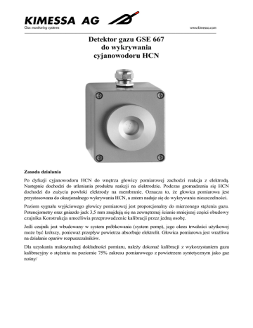 Detektor gazu GSE 667 do wykrywania cyjanowodoru HCN Zasada działania Po dyfuzji cyjanowodoru HCN do wnętrza głowicy pomiarowej zachodzi reakcja z elektrodą. Następnie dochodzi do utleniania produktu reakcji na elektrodzie. Podczas gromadzenia się HCN dochodzi do zużycia powłoki elektrody na membranie. Oznacza to, że głowica pomiarowa jest przystosowana do okazjonalnego wykrywania HCN, a zatem nadaje się do wykrywania nieszczelności. Poziom sygnału wyjściowego głowicy pomiarowej jest proporcjonalny do mierzonego stężenia gazu. Potencjometry oraz gniazdo jack 3,5 mm znajdują się na zewnętrznej ścianie mniejszej części obudowy czujnika Konstrukcja umożliwia przeprowadzenie kalibracji przez jedną osobę. Jeśli czujnik jest wbudowany w system próbkowania (system pomp), jego okres trwałości użytkowej może być krótszy, ponieważ przepływ powietrza absorbuje elektrolit. Głowica pomiarowa jest wrażliwa na działanie oparów rozpuszczalników. Dla uzyskania maksymalnej dokładności pomiaru, należy dokonać kalibracji z wykorzystaniem gazu kalibracyjny o stężeniu na poziomie 75% zakresu pomiarowego z powietrzem syntetycznym jako gaz nośny/ Specyfikacja robocza Czułość: Zakres pomiarowy: Czułość krzyżowa na inne gazy 1 ppm maks. 200 ppm/liniowy Stężenie gazu testowego 1 ppm wskazanie czujnika HCN ok. -0,5 ppm 100 ppm <55 ppm Tlenek węgla CO 300 ppm <54 ppm Siarkowodór H2S 15 ppm ok. 350% 5 ppm 5,5<>17,5 ppm 35 ppm -17,5<> 0 ppm 5 ppm -20<> -10 ppm 200 ppm 0 ppm Kalibracja standardowa: 0–20/0–50 ppm Chlor Cl2 Czas reakcji t 90: maks. 150 sek. Etylen C2H4 Temperatura pracy: -20°C – +50°C maks. 1 godz. Czas rozruchu po ponownym uruchomieniu: Zakres ciśnienia: Wilgotność powietrza: Dwutlenek siarki SO2 atmosferyczne ± 10% 15–90% bez kondensacji poziom sygnału wzrośnie na krótki okres Czułość na pozycję: Długoterminowe pełzanie zera: Żywotność w temperaturze 20°C: Tlenek azotu NO Dwutlenek azotu NO2 Wodór H2 brak 5%/miesiąc przynajmniej 1 rok lub dłużej w niższych temperaturach Specyfikacja czujnika Przewód: Zasilacz: Prąd czujnika: Sygnał wyjściowy: Temperatura pracy: 2-żyłowy, ekranowany 13,5–30 V DC maks. 60 mA 4–20 mA/maks. 60 mA -40°C – +85°C Przegląd (Konserwacja) Czujnik i zespół elektroniki wymagają okresowych przeglądów. Zaleca się przeprowadzanie okresowej kalibracji 1–2 razy do roku. Elektronika Wymiary Dane techniczne i konstrukcja mogą ulec zmianie bez uprzedzenia. GSE667 V080906mb Przedstawiciel w Polsce 84-200 Wejherowo, ul. Kościuszki 6 tel. +48 58 679 40 57, fax. +48 58 600 83 69 www.mechvent.pl [email protected]