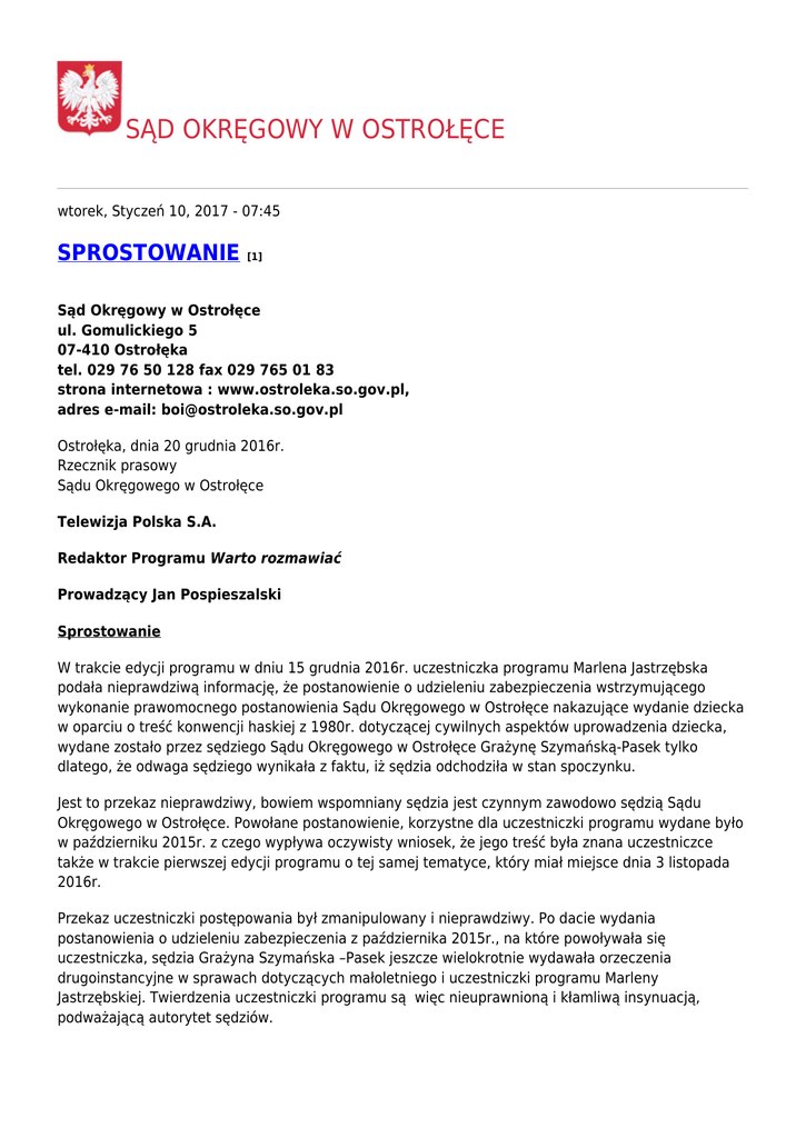 SĄD OKRĘGOWY W OSTROŁĘCE wtorek, Styczeń 10, 2017 - 07:45 SPROSTOWANIE [1] Sąd Okręgowy w Ostrołęce ul. Gomulickiego 5 07-410 Ostrołęka tel. 029 76 50 128 fax 029 765 01 83 strona internetowa : www.ostroleka.so.gov.pl, adres e-mail: [email protected] Ostrołęka, dnia 20 grudnia 2016r. Rzecznik prasowy Sądu Okręgowego w Ostrołęce Telewizja Polska S.A. Redaktor Programu Warto rozmawiać Prowadzący Jan Pospieszalski Sprostowanie W trakcie edycji programu w dniu 15 grudnia 2016r. uczestniczka programu Marlena Jastrzębska podała nieprawdziwą informację, że postanowienie o udzieleniu zabezpieczenia wstrzymującego wykonanie prawomocnego postanowienia Sądu Okręgowego w Ostrołęce nakazujące wydanie dziecka w oparciu o treść konwencji haskiej z 1980r. dotyczącej cywilnych aspektów uprowadzenia dziecka, wydane zostało przez sędziego Sądu Okręgowego w Ostrołęce Grażynę Szymańską-Pasek tylko dlatego, że odwaga sędziego wynikała z faktu, iż sędzia odchodziła w stan spoczynku. Jest to przekaz nieprawdziwy, bowiem wspomniany sędzia jest czynnym zawodowo sędzią Sądu Okręgowego w Ostrołęce. Powołane postanowienie, korzystne dla uczestniczki programu wydane było w październiku 2015r. z czego wypływa oczywisty wniosek, że jego treść była znana uczestniczce także w trakcie pierwszej edycji programu o tej samej tematyce, który miał miejsce dnia 3 listopada 2016r. Przekaz uczestniczki postępowania był zmanipulowany i nieprawdziwy. Po dacie wydania postanowienia o udzieleniu zabezpieczenia z października 2015r., na które powoływała się uczestniczka, sędzia Grażyna Szymańska –Pasek jeszcze wielokrotnie wydawała orzeczenia drugoinstancyjne w sprawach dotyczących małoletniego i uczestniczki programu Marleny Jastrzębskiej. Twierdzenia uczestniczki programu są więc nieuprawnioną i kłamliwą insynuacją, podważającą autorytet sędziów. W związku z powyższymi umotywowanymi zastrzeżeniami wnoszę, aby w najbliższej edycji programu Warto rozmawiać przekazać sprostowanie o poniższej treści: „W trakcie edycji programu w dniu 15 grudnia 2016r. uczestniczka programu Marlena Jastrzębska podała nieprawdziwą informację, że postanowienie o udzieleniu zabezpieczenia wstrzymującego wykonanie postanowienia nakazujące wydanie dziecka, wydane zostało przez sędziego Sądu Okręgowego w Ostrołęce Grażynę Szymańska-Pasek tylko dlatego, że odwaga sędziego wynikała z faktu, iż sędzia odeszła w stan spoczynku. Sędzia wykonuje czynną służbę w Sądzie Okręgowym w Ostrołęce”. Proszę o poinformowanie kiedy powyższe sprostowanie zostanie wyemitowane. Rzecznik prasowy Sądu Okręgowego w Ostrołęce Sędzia Sądu Okręgowego Małgorzata Mikos- Bednarz tel. (29) 76 50 118 tel. kom. 795 422 469 e-mail [email protected] [2] Źródło: http://www.ostroleka.so.gov.pl/aktualnosc/sprostowanie Odnośniki [1] http://www.ostroleka.so.gov.pl/aktualnosc/sprostowanie [2] mailto:[email protected]