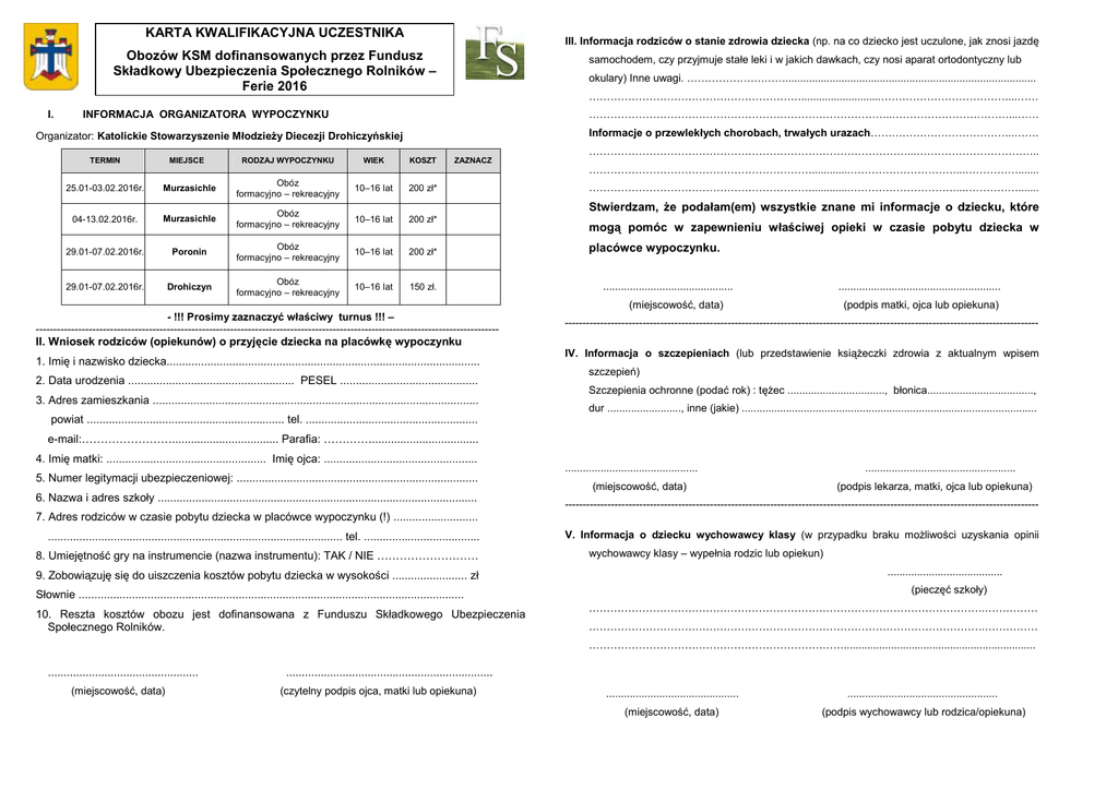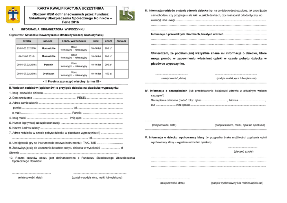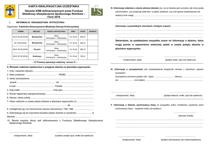 KARTA KWALIFIKACYJNA UCZESTNIKA III. Informacja rodziców o stanie zdrowia dziecka (np. na co dziecko jest uczulone, jak znosi jazdę Obozów KSM dofinansowanych przez Fundusz Składkowy Ubezpieczenia Społecznego Rolników – Ferie 2016 I. samochodem, czy przyjmuje stałe leki i w jakich dawkach, czy nosi aparat ortodontyczny lub okulary) Inne uwagi. ………………….……..................................................................................... ……………………………………………………...........................………………………………...…… INFORMACJA ORGANIZATORA WYPOCZYNKU …………………………………………………………………………..……………………………...…… Informacje o przewlekłych chorobach, trwałych urazach…………………………………..……. Organizator: Katolickie Stowarzyszenie Młodzieży Diecezji Drohiczyńskiej ………………………………………………………………………………...…………………………….. TERMIN MIEJSCE RODZAJ WYPOCZYNKU WIEK KOSZT ZAZNACZ ……………………………………………………….............…………………………...……………....... 25.01-03.02.2016r. Murzasichle Obóz formacyjno – rekreacyjny 04-13.02.2016r. Murzasichle Obóz formacyjno – rekreacyjny 10–16 lat 200 zł* 29.01-07.02.2016r. Poronin Obóz formacyjno – rekreacyjny 10–16 lat 200 zł* 29.01-07.02.2016r. Drohiczyn Obóz formacyjno – rekreacyjny 10–16 lat 150 zł. 10–16 lat 200 zł* ……………………………………………………….............…………………………...……………....... Stwierdzam, że podałam(em) wszystkie znane mi informacje o dziecku, które mogą pomóc w zapewnieniu właściwej opieki w czasie pobytu dziecka w placówce wypoczynku. ............................................ ....................................................... (miejscowość, data) - !!! Prosimy zaznaczyć właściwy turnus !!! – ----------------------------------------------------------------------------------------------------------------------------------- (podpis matki, ojca lub opiekuna) -------------------------------------------------------------------------------------------------------------------------------------- II. Wniosek rodziców (opiekunów) o przyjęcie dziecka na placówkę wypoczynku 1. Imię i nazwisko dziecka.................................................................................................... 2. Data urodzenia ..................................................... PESEL ............................................ 3. Adres zamieszkania ........................................................................................................ IV. Informacja o szczepieniach (lub przedstawienie książeczki zdrowia z aktualnym wpisem szczepień) Szczepienia ochronne (podać rok) : tężec ................................., błonica...................................., dur ........................., inne (jakie) .................................................................................................... powiat ............................................................... tel. ....................................................... e-mail:…………………….................................. Parafia: …….…….................................. 4. Imię matki: ................................................... Imię ojca: ................................................. 5. Numer legitymacji ubezpieczeniowej: ............................................................................. 6. Nazwa i adres szkoły ...................................................................................................... ............................................. ................................................... (miejscowość, data) (podpis lekarza, matki, ojca lub opiekuna) -------------------------------------------------------------------------------------------------------------------------------------- 7. Adres rodziców w czasie pobytu dziecka w placówce wypoczynku (!) ........................... .............................................................................................. tel. ..................................... 8. Umiejętność gry na instrumencie (nazwa instrumentu): TAK / NIE ……………………… V. Informacja o dziecku wychowawcy klasy (w przypadku braku możliwości uzyskania opinii wychowawcy klasy – wypełnia rodzic lub opiekun) ....................................... 9. Zobowiązuję się do uiszczenia kosztów pobytu dziecka w wysokości ........................ zł (pieczęć szkoły) Słownie ........................................................................................................................... 10. Reszta kosztów obozu jest dofinansowana z Funduszu Składkowego Ubezpieczenia Społecznego Rolników. ………………………………………………………………………………………………….…………… ………………………………………………………………………………………………….…………… ………………………………………………………………................................................................. ................................................ (miejscowość, data) .................................................................. (czytelny podpis ojca, matki lub opiekuna) ............................................. ................................................... (miejscowość, data) (podpis wychowawcy lub rodzica/opiekuna) VI. Decyzja o kwalifikacji uczestnika X. Akceptacja warunków obozu Postanawia się: 1. Zakwalifikować i skierować dziecko do placówki wypoczynku 2. Odmówić skierowania dziecka ze względu na ...............................................................