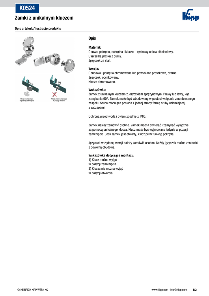 K0524 Zamki z unikalnym kluczem Opis artykułu/ilustracje produktu Opis Materiał: Obuwa, pokrętło, nakrętka i klucze – cynkowy odlew ciśnieniowy. Uszczelka płaska z gumy. Języczek ze stali. Wersja: Obudowa i pokrętło chromowane lub powlekane proszkowo, czarne. Języczek, ocynkowany. Klucze chromowane. Wskazówka: Zamek z unikalnym kluczem z języczkiem sprężynowym. Prawy lub lewy, kąt zamykania 90°. Zamek może być wbudowany w postaci wstępnie zmontowanego zespołu. Śruba mocująca posiada z jednej strony formę śruby uziemiającej z zaczepami. Ochrona przed wodą i pyłem zgodnie z IP65. Zamek należy zamówić osobno. Zamek można otwierać i zamykać wyłącznie za pomocą unikalnego klucza. Klucz może być wyjmowany jedynie w pozycji zamknięcia. Jeśli zamek jest otwarty, klucz pełni funkcję pokrętła. Języczek w żądanej wersji należy zamówić osobno. Każdy języczek można zestawić z dowolną obudową. Wskazówka dotycząca montażu: 1) Klucz można wyjąć w pozycji zamknięcia 2) Klucza nie można wyjąć w pozycji otwarcia © HEINRICH KIPP WERK KG www.kipp.com · [email protected] 1/2 K0524 Zamki z unikalnym kluczem Rysunki Zamki z unikalnym kliczem Nr Zamówienia chromowany Nr Zamówienia powlekane proszkowo, czarne Uruchomienie K0524.181 K0524.182 Klucz Nr Zamówienia Klucz K0524.9 Języczek do zamka Nr Zamówienia K0523.135X K0523.145X A 16,5/18,5/20,5/22,5/24,5 4,5/6,5/8,5/10,5/12,5/14,5/16,5/18,5/20,5/21,5/22,5/24,5/26,5/28,5/30,5/32,5/34,5/36,5/38,5/40,5/42,5 Nr Zamówienia Wersja K0524.9 © HEINRICH KIPP WERK KG L 35 45 Klucz www.kipp.com · [email protected] 2/2