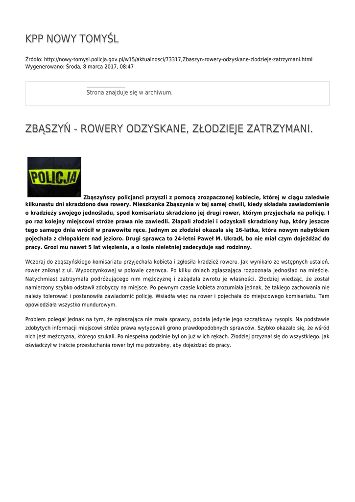 KPP NOWY TOMYŚL Źródło: http://nowy-tomysl.policja.gov.pl/w15/aktualnosci/73317,Zbaszyn-rowery-odzyskane-zlodzieje-zatrzymani.html Wygenerowano: Środa, 8 marca 2017, 08:47 Strona znajduje się w archiwum. ZBĄSZYŃ - ROWERY ODZYSKANE, ZŁODZIEJE ZATRZYMANI. Zbąszyńscy policjanci przyszli z pomocą zrozpaczonej kobiecie, której w ciągu zaledwie kilkunastu dni skradziono dwa rowery. Mieszkanka Zbąszynia w tej samej chwili, kiedy składała zawiadomienie o kradzieży swojego jednośladu, spod komisariatu skradziono jej drugi rower, którym przyjechała na policję. I po raz kolejny miejscowi stróże prawa nie zawiedli. Złapali złodziei i odzyskali skradziony łup, który jeszcze tego samego dnia wrócił w prawowite ręce. Jednym ze złodziei okazała się 16-latka, która nowym nabytkiem pojechała z chłopakiem nad jezioro. Drugi sprawca to 24-letni Paweł M. Ukradł, bo nie miał czym dojeżdżać do pracy. Grozi mu nawet 5 lat więzienia, a o losie nieletniej zadecyduje sąd rodzinny. Wczoraj do zbąszyńskiego komisariatu przyjechała kobieta i zgłosiła kradzież roweru. Jak wynikało ze wstępnych ustaleń, rower zniknął z ul. Wypoczynkowej w połowie czerwca. Po kilku dniach zgłaszająca rozpoznała jednoślad na mieście. Natychmiast zatrzymała podróżującego nim mężczyznę i zażądała zwrotu je własności. Złodziej wiedząc, że został namierzony szybko odstawił zdobyczy na miejsce. Po pewnym czasie kobieta zrozumiała jednak, że takiego zachowania nie należy tolerować i postanowiła zawiadomić policję. Wsiadła więc na rower i pojechała do miejscowego komisariatu. Tam opowiedziała wszystko mundurowym. Problem polegał jednak na tym, że zgłaszająca nie znała sprawcy, podała jedynie jego szczątkowy rysopis. Na podstawie zdobytych informacji miejscowi stróże prawa wytypowali grono prawdopodobnych sprawców. Szybko okazało się, że wśród nich jest mężczyzna, którego szukali. Po niespełna godzinie był on już w ich rękach. Złodziej przyznał się do wszystkiego. Jak oświadczył w trakcie przesłuchania rower był mu potrzebny, aby dojeżdżać do pracy. 24-letni Paweł M. Tak jednak ta historia się nie zakończyła. Kobieta po złożeniu stosownych zeznań, szybko wróciła ponownie prosić o pomoc mundurowych. Zdruzgotana oznajmiła, że właśnie skradziono jej rower, który pozostawiła pod komisariatem. Policjanci wiedząc, że sprawca nie mógł daleko odjechać, szybko rozpoczęli poszukiwania złodzieja. Udało się go zatrzymać pod Zbąszyniem. Okazała się nim, ku zdziwieniu policjantów, 16-letnia Patrycja K. mieszkanka gm. Zbąszyń. Dziewczyna jak tłumaczyła ukradła jednoślad by wspólnie z chłopakiem pojechać nad jezioro. Teraz o jej losie zadecyduje sąd rodzinny. Z kolei Pawłowi M. grozi nawet 5 lat pozbawienia wolności. rower skradziony przez 16-latkę Ocena: 0/5 (0) Tweetnij