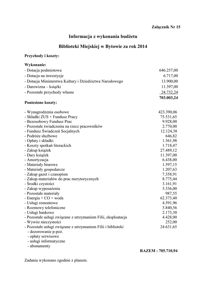 Załącznik Nr 15 - wykonanie budżetu 2014 Biblioteka