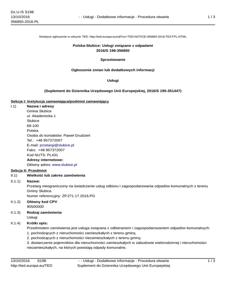 Dz.U./S S198 13/10/2016 356850-2016-PL - - Usługi - Dodatkowe informacje - Procedura otwarta 1/3 Niniejsze ogłoszenie w witrynie TED: http://ted.europa.eu/udl?uri=TED:NOTICE:356850-2016:TEXT:PL:HTML Polska-Słubice: Usługi związane z odpadami 2016/S 198-356850 Sprostowanie Ogłoszenie zmian lub dodatkowych informacji Usługi (Suplement do Dziennika Urzędowego Unii Europejskiej, 2016/S 195-351447) Sekcja I: Instytucja zamawiająca/podmiot zamawiający I.1) Nazwa i adresy Gmina Słubice ul. Akademicka 1 Słubice 69-100 Polska Osoba do kontaktów: Paweł Grudzień Tel.: +48 957372007 E-mail: [email protected] Faks: +48 957372007 Kod NUTS: PL431 Adresy internetowe: Główny adres: www.slubice.pl Sekcja II: Przedmiot II.1) Wielkość lub zakres zamówienia II.1.1) Nazwa: Przetarg nieograniczony na świadczenie usług odbioru i zagospodarowania odpadów komunalnych z terenu Gminy Słubice. Numer referencyjny: ZP.271.17.2016.PG II.1.2) Główny kod CPV 90500000 II.1.3) Rodzaj zamówienia Usługi II.1.4) Krótki opis: Przedmiotem zamówienia jest usługa związana z odbieraniem i zagospodarowaniem odpadów komunalnych: 1. pochodzących z nieruchomości zamieszkałych z terenu gminy, 2. pochodzących z nieruchomości niezamieszkałych z terenu gminy, 3. dostarczenie pojemników dla nieruchomości zamieszkałych w zabudowie wielorodzinnej i nieruchomości niezamieszkałych, na których powstają odpady komunalne, 13/10/2016 S198 http://ted.europa.eu/TED - - Usługi - Dodatkowe informacje - Procedura otwarta Suplement do Dziennika Urzędowego Unii Europejskiej 1/3 Dz.U./S S198 13/10/2016 356850-2016-PL - - Usługi - Dodatkowe informacje - Procedura otwarta 2/3 4. dostarczenie worków dla nieruchomości zamieszkałych w zabudowie jednorodzinnej dla odpadów gromadzonych w sposób selektywny oraz pojemników na odpady zmieszane dla nieruchomości zamieszkałych w zabudowie jednorodzinnej. Sekcja VI: Informacje uzupełniające VI.5) Data wysłania niniejszego ogłoszenia: 10/10/2016 VI.6) Numer pierwotnego ogłoszenia Numer ogłoszenia w Dz.Urz. UE – OJ/S: 2016/S 195-351447 Sekcja VII: Zmiany VII.1) Informacje do zmiany lub dodania VII.1.2) Tekst, który należy poprawić w pierwotnym ogłoszeniu Numer sekcji: III.2 Miejsce, w którym znajduje się tekst do modyfikacji: Warunki dotyczące zamówienia Zamiast: Warunki dotyczące zamówienia. Powinno być: W zakresie wstępnego potwierdzenia spełniania przez wykonawcę warunków udziału w postępowaniu, o których mowa w art. 22 ust. 1b ustawy Pzp oraz nie podlegania wykluczeniu na podstawie art. 24 ust 1 ustawy Pzp należy przedłożyć Jednolity Europejski Dokument Zamówień, zwany dalej JEDZ, stanowiący załącznik do SIWZ. Z udziału w niniejszym postępowaniu wyklucza się Wykonawców, którzy podlegają wykluczeniu na podstawie art. 24 ust. 1 Pzp. lub którzy nie wykażą, że spełniają warunki udziału w postępowaniu. Zamawiający przewiduje wykluczenie wykonawcy na podstawie art. 24 ust 5 pkt 8 Pzp. Numer sekcji: IV.2.2 Miejsce, w którym znajduje się tekst do modyfikacji: Termin składania ofert lub wniosków o dopuszczenie do udziału Zamiast: Data: 14/11/2016 Czas lokalny: 11:00 Powinno być: Data: 18/11/2016 Czas lokalny: 11:00 Numer sekcji: IV.2.7 Miejsce, w którym znajduje się tekst do modyfikacji: Warunki otwarcia ofert Zamiast: Data: 14/11/2016 Czas lokalny: 11:30 Powinno być: Data: 18/11/2016 Czas lokalny: 11:30 VII.2) Inne dodatkowe informacje: Na potwierdzenie niepodleganiu wykluczeniu zamawiający wezwie wykonawcę do złożenia (w skrócie): — informacji z Krajowego Rejestru Karnego, — zaświadczenia właściwego naczelnika urzędu skarbowego, 13/10/2016 S198 http://ted.europa.eu/TED - - Usługi - Dodatkowe informacje - Procedura otwarta Suplement do Dziennika Urzędowego Unii Europejskiej 2/3 Dz.U./S S198 13/10/2016 356850-2016-PL - - Usługi - Dodatkowe informacje - Procedura otwarta 3/3 — zaświadczenia z ZUS lub KRUS, — oświadczenia wykonawcy o braku wydania wobec niego prawomocnego wyroku sądu lub ostatecznej decyzji administracyjnej o zaleganiu z uiszczaniem podatków, opłat lub składek na ubezpieczenie społeczne lub zdrowotne, — oświadczenia wykonawcy o braku orzeczenia wobec niego tytułem środka zapobiegawczego zakazu ubiegania się o zamówienie publiczne, — oświadczenia wykonawcy o niezaleganiu z opłacaniem podatków i opłat lokalnych. W związku z ograniczonym miejscem na wypełnienie ogłoszenia, szczegółowy opis dokumentów, których zamawiający będzie żądał, na potwierdzenie spełniania warunków znajduje się w rozdziale VI Specyfikacji Istotnych Warunków Zamówienia. 13/10/2016 S198 http://ted.europa.eu/TED - - Usługi - Dodatkowe informacje - Procedura otwarta Suplement do Dziennika Urzędowego Unii Europejskiej 3/3