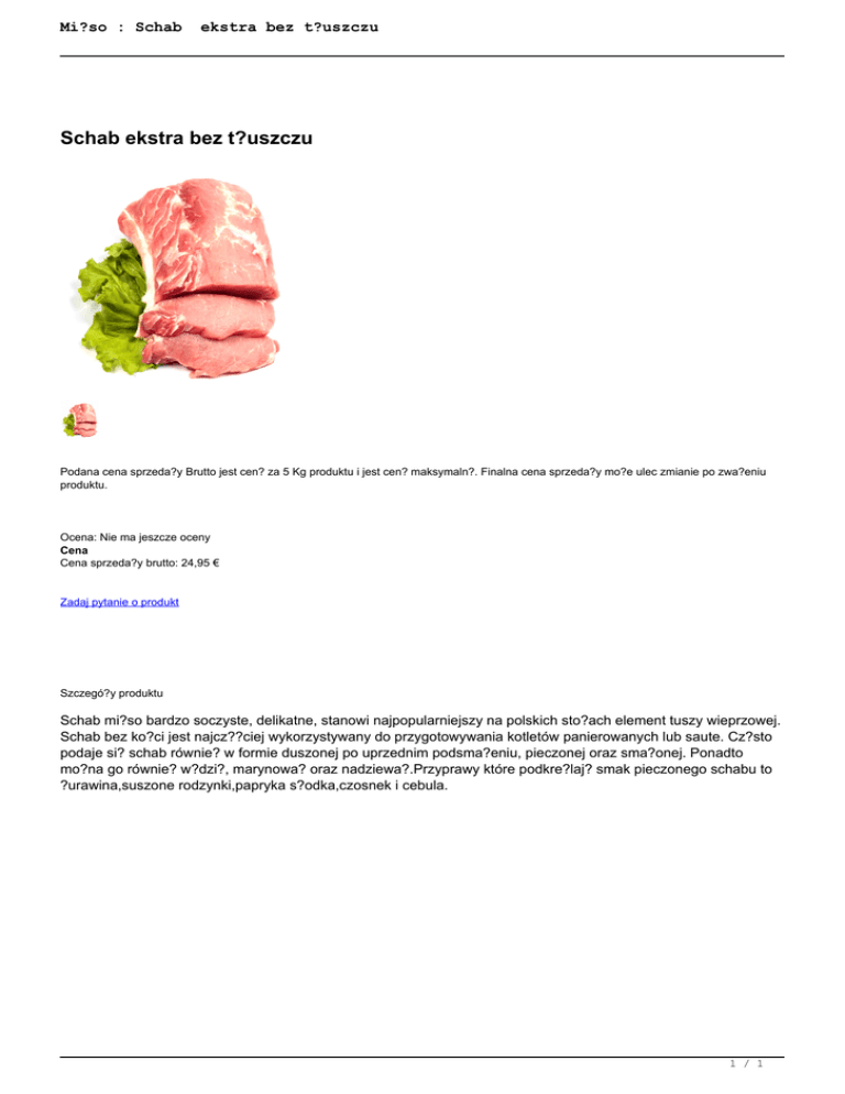 Mi?so : Schab ekstra bez t?uszczu Schab ekstra bez t?uszczu Podana cena sprzeda?y Brutto jest cen? za 5 Kg produktu i jest cen? maksymaln?. Finalna cena sprzeda?y mo?e ulec zmianie po zwa?eniu produktu. Ocena: Nie ma jeszcze oceny Cena Cena sprzeda?y brutto: 24,95 € Zadaj pytanie o produkt Szczegó?y produktu Schab mi?so bardzo soczyste, delikatne, stanowi najpopularniejszy na polskich sto?ach element tuszy wieprzowej. Schab bez ko?ci jest najcz??ciej wykorzystywany do przygotowywania kotletów panierowanych lub saute. Cz?sto podaje si? schab równie? w formie duszonej po uprzednim podsma?eniu, pieczonej oraz sma?onej. Ponadto mo?na go równie? w?dzi?, marynowa? oraz nadziewa?.Przyprawy które podkre?laj? smak pieczonego schabu to ?urawina,suszone rodzynki,papryka s?odka,czosnek i cebula. 1 / 1 Powered by TCPDF (www.tcpdf.org)