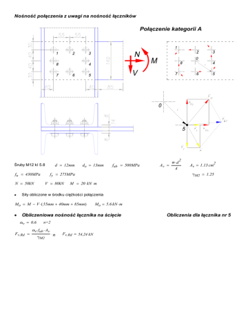 Nośność połączenia z uwagi na nośność łączników Połączenie kategorii A d 12mm Śruby M12 kl 5.8 fu 430MPa V 80kN 2 2 A v 1.13 cm γM2 1.25 M 20 kN m Siły obliczone w środku ciężkości połączenia Mo M V ( 55mm 40mm 85mm) fub 500MPa fy 275MPa N 50kN do 13mm π d Av 4 Mo 5.6 kN m Obliczeniowa nośność łącznika na ścięcie αv 0.6 F v.Rd n=2 αv fub Av γM2 n F v.Rd 27.14 54,24 kN Nośność na jedno cięcie; w tym przypadku powinna być określona dla połączenia dwuciętego Obliczenia dla łącznika nr 5 Obliczeniowa nośność łącznika na docisk Z uwagi na fakt, że kierunek obciążenia nie pokrywa się z kierunkami wyznaczonymi przez rzędy i szeregi łączników, nośność na docisk określa się jako najmniejszą z dwóch nośności obliczonych dla kierunków: pionowego i poziomego. Σt.min 14mm Kierunek pionowy e1 30mm p1 40mm Łącznik skrajny Współczynnik uwzględniający m.in. rozstaw łączników na kierunku działania siły e1 αb min fub 3 do fu e2 40mm e1 3 do 1.0 fub 0.77 fu 1.16 αb 0.77 p2 55mm Łącznik pośredni Współczynnik uwzględniający rozstaw łączników na kierunku prostopadłym do działania siły p2 do k1 min 1.4 1.7 2.5 1.4 p2 do k1 αb d fu Σt.min F b.Rd 1 1.7 4.22 k1 2.5 F b.Rd 111.14 kN 1 γM2 Kierunek poziomy e1 40mm p1 55mm Łącznik pośredni Współczynnik uwzględniający m.in. rozstaw łączników na kierunku działania siły p1 αb min 3 do e2 30mm 1 fub 1.0 4 fu p1 3 do fub 1 1.16 4 fu 1.16 αb 1 p2 40mm Łącznik skrajny Współczynnik uwzględniający rozstaw łączników na kierunku prostopadłym do działania siły p2 do k1 min 1.4 F b.Rd 1.7 2.8 e2 do 1.7 2.5 k1 αb d fu Σt.min 2 γM2 1 F Rd min Fv.Rd Fb.Rd Fb.Rd 1.4 p2 do 1.7 2.61 F b.Rd 144.48 kN 2 2 54,24 kN F Rd 27.14 2.8 e2 do 1.7 4.76 k1 2.5 Wartość obciążenia działającego na śrubę n 8 liczba śrub Siły działająca na łącznik wywołane obciążeniami skupionymi Fx i 1 2 n N n F x 6.25 kN Fy V n F y 10 kN Siła działająca na łącznik wywołana momentem skręcającym r1 2 p2 p1 r2 40 mm 2 r1 68.01 mm r3 68.01 mm r4 55 mm r5 68.01 mm r6 40 mm r7 68.01 mm rmax 68.01 mm p1 p2 α atan α 53.97 deg Siła działająca na łącznik wywołana momentem zginającym FM Mo rmax n F M 13.72 kN ri2 F Mx FM sin ( α) F Mx 11.1 kN F My FM cos ( α) F My 8.07 kN i 1 Wypadkowa obciążenia działająca na łącznik F Ed FMx Fx2 FMy - Fy2 F Ed 17.46 kN < F Rd 27.14 54,24 kN UWAGA Łącznik nr 5 nie jest łącznikiem najbardziej wytężonym! W celu sprawdzenia nośności całego połączenia należy analogicznie wykonać obliczenia wypadkowej siły działającej na łącznik najbardziej wytężony i porównać z najmniejszą nośnością obliczeniową tego łącznika. r8 55 mm