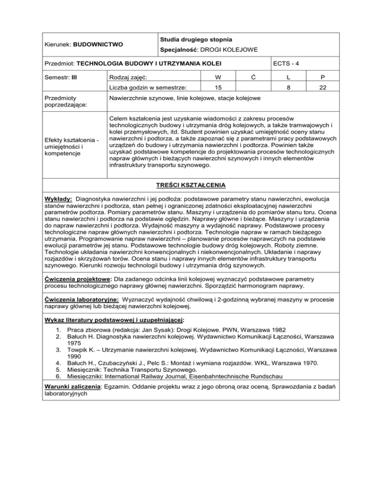 Kierunek: BUDOWNICTWO Studia drugiego stopnia Specjalność: DROGI KOLEJOWE Przedmiot: TECHNOLOGIA BUDOWY I UTRZYMANIA KOLEI Semestr: III Przedmioty poprzedzające: Efekty kształcenia umiejętności i kompetencje Rodzaj zajęć: W Liczba godzin w semestrze: 15 ECTS - 4 Ć L P 8 22 Nawierzchnie szynowe, linie kolejowe, stacje kolejowe Celem kształcenia jest uzyskanie wiadomości z zakresu procesów technologicznych budowy i utrzymania dróg kolejowych, a takŜe tramwajowych i kolei przemysłowych, itd. Student powinien uzyskać umiejętność oceny stanu nawierzchni i podtorza, a takŜe zapoznać się z parametrami pracy podstawowych urządzeń do budowy i utrzymania nawierzchni i podtorza. Powinien takŜe uzyskać podstawowe kompetencje do projektowania procesów technologicznych napraw głównych i bieŜących nawierzchni szynowych i innych elementów infrastruktury transportu szynowego. TREŚCI KSZTAŁCENIA Wykłady: Diagnostyka nawierzchni i jej podłoŜa: podstawowe parametry stanu nawierzchni, ewolucja stanów nawierzchni i podtorza, stan pełnej i ograniczonej zdatności eksploatacyjnej nawierzchni parametrów podtorza. Pomiary parametrów stanu. Maszyny i urządzenia do pomiarów stanu toru. Ocena stanu nawierzchni i podtorza na podstawie oględzin. Naprawy główne i bieŜące. Maszyny i urządzenia do napraw nawierzchni i podtorza. Wydajność maszyny a wydajność naprawy. Podstawowe procesy technologiczne napraw głównych nawierzchni i podtorza. Technologie napraw w ramach bieŜącego utrzymania. Programowanie napraw nawierzchni – planowanie procesów naprawczych na podstawie ewolucji parametrów jej stanu. Podstawowe technologie budowy dróg kolejowych. Roboty ziemne. Technologie układania nawierzchni konwencjonalnych i niekonwencjonalnych. Układanie i naprawy rozjazdów i skrzyŜowań torów. Ocena stanu i naprawy innych elementów infrastruktury transportu szynowego. Kierunki rozwoju technologii budowy i utrzymania dróg szynowych. Ćwiczenia projektowe: Dla zadanego odcinka linii kolejowej wyznaczyć podstawowe parametry procesu technologicznego naprawy głównej nawierzchni. Sporządzić harmonogram naprawy. Ćwiczenia laboratoryjne: Wyznaczyć wydajność chwilową i 2-godzinną wybranej maszyny w procesie naprawy głównej lub bieŜącej nawierzchni kolejowej. Wykaz literatury podstawowej i uzupełniającej: 1. Praca zbiorowa (redakcja: Jan Sysak): Drogi Kolejowe. PWN, Warszawa 1982 2. Bałuch H. Diagnostyka nawierzchni kolejowej. Wydawnictwo Komunikacji Łączności, Warszawa 1975 3. Towpik K. – Utrzymanie nawierzchni kolejowej. Wydawnictwo Komunikacji Łączności, Warszawa 1990 4. Bałuch H., Czubaczyński J., Pelc S.: MontaŜ i wymiana rozjazdów. WKŁ, Warszawa 1970. 5. Miesięcznik: Technika Transportu Szynowego. 6. Miesięczniki: International Railway Journal, Eisenbahntechnische Rundschau Warunki zaliczenia: Egzamin. Oddanie projektu wraz z jego obroną oraz oceną. Sprawozdania z badań laboratoryjnych